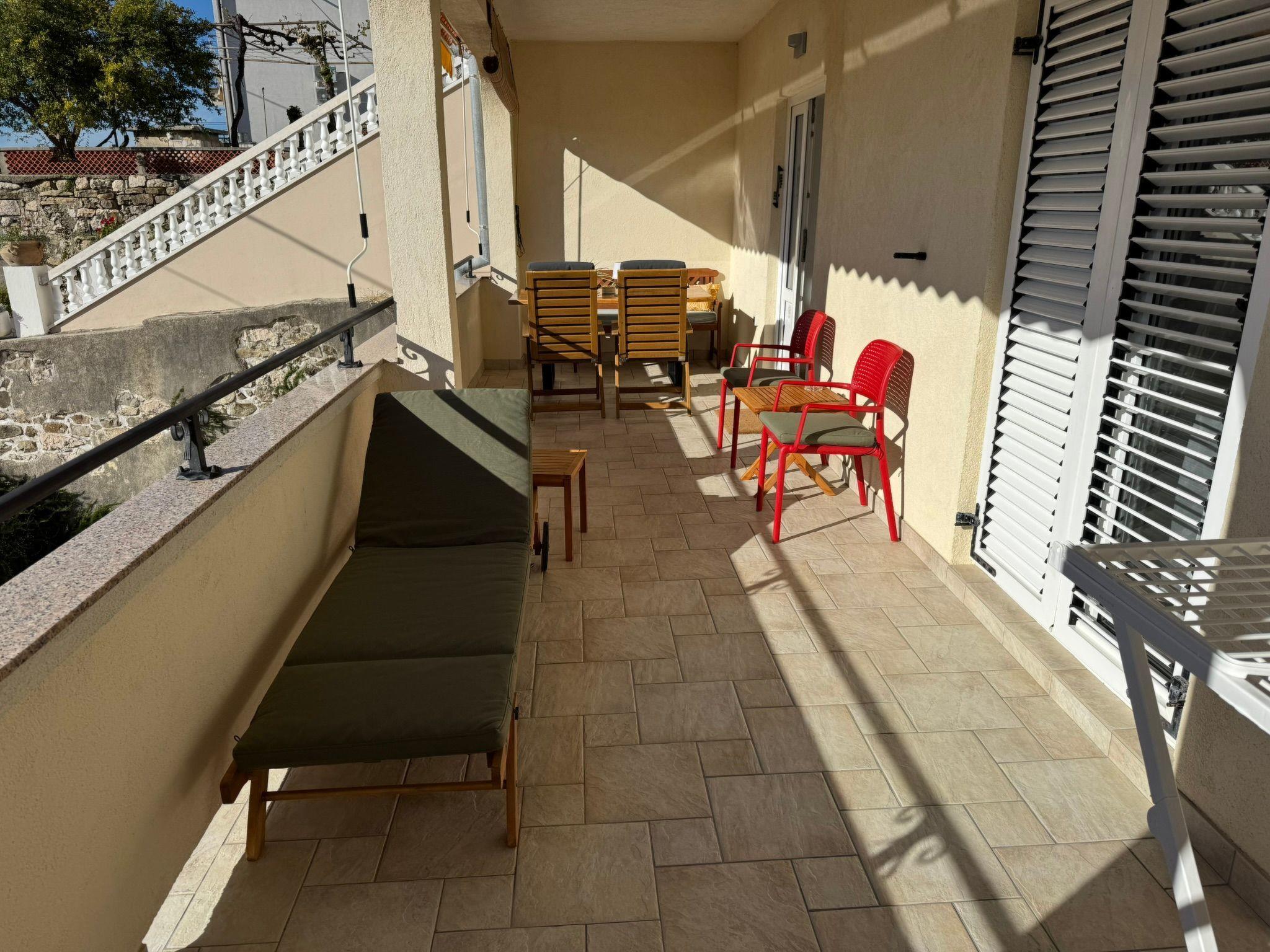Vom Wohnbereich und einem der Schlafzimmer aus gelangen Sie auf Ihre private 18 m² große Sonnenterrasse, die mit einem Tisch und Stühlen ausgestattet ist. Von hier aus können Sie den weitreichenden Panoramablick auf die weite Bucht und das blaue Meer genießen.