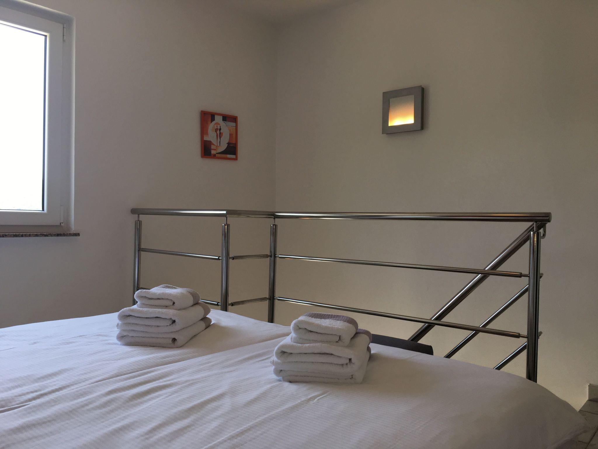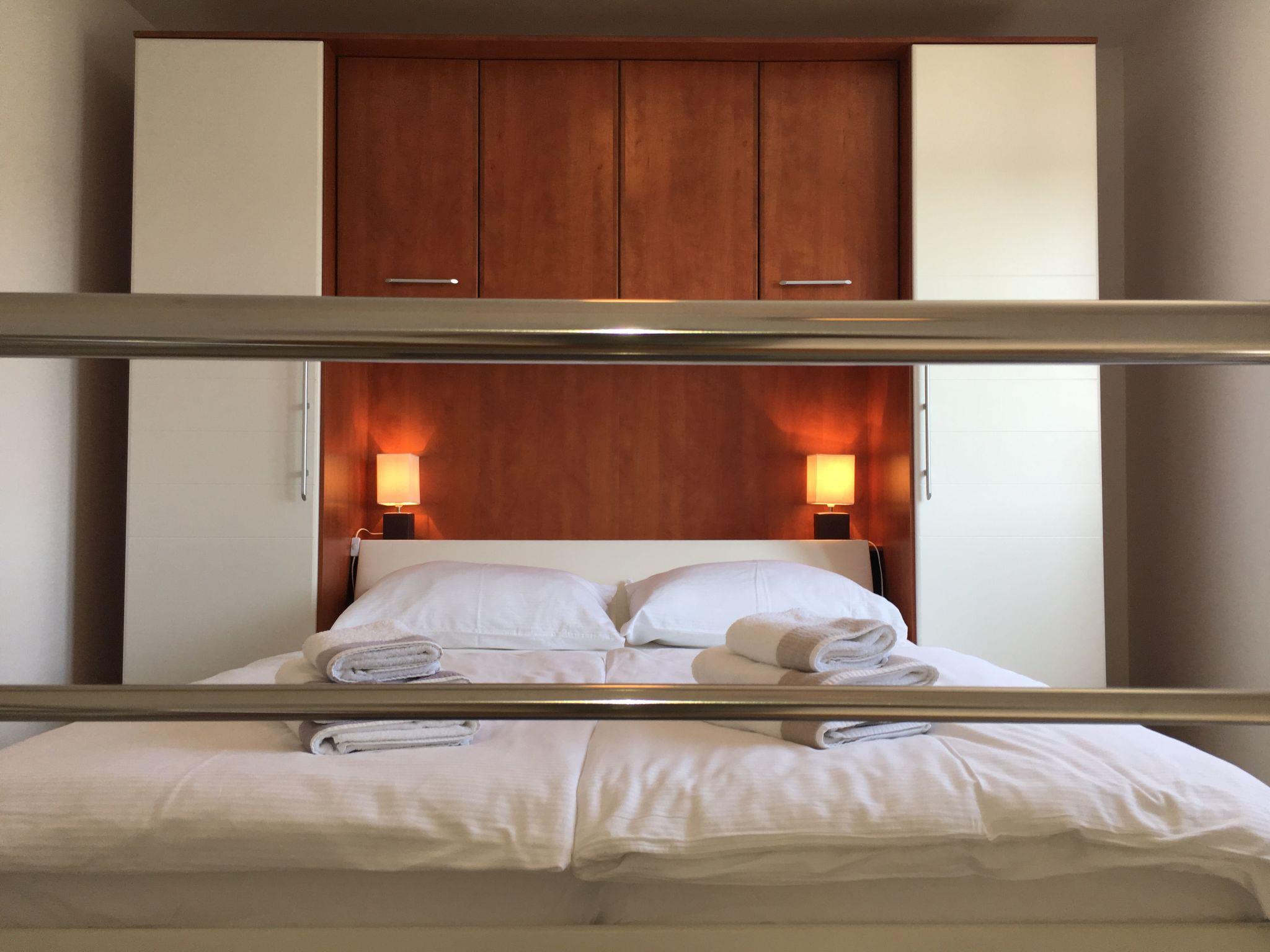 Sie erstreckt sich über zwei Etagen und besteht aus einem Wohn- und Esszimmer mit integrierter, offener Küche, einem Schlafbereich im Hochparterre, einem modernen Badezimmer und einem separaten Gäste-WC. Im Erdgeschoss befindet sich das klimatisierte (kühl/warm) Wohnzimmer mit einem Sofa, einem an der Wand montierten Flachbildfernseher mit Satellitenkanälen und einem USB-Anschluss, einem Radio, einem Safe für Ihre Wertsachen und einem Esstisch mit Stühlen. Daneben befindet sich die Küche, ausgestattet mit Herd, Backofen, Kühlschrank mit Gefrierfach, Wasserkocher und Kaffeemaschine. Es gibt eine praktische separate Gästetoilette. Eine breite Treppe führt zum Zwischengeschoss mit einem Doppelbett (160 x 200 cm). Das Badezimmer hat eine Duschkabine, ein Waschbecken mit Unterschrank, einen Wandspiegel und eine Toilette. Eine Waschmaschine, ein Trockner und ein Kinderbett sind vorhanden, und Bettwäsche und Handtücher sind ausreichend vorhanden. Die zuverlässige drahtlose Internetverbindung in der Wohnung kann kostenlos genutzt werden.