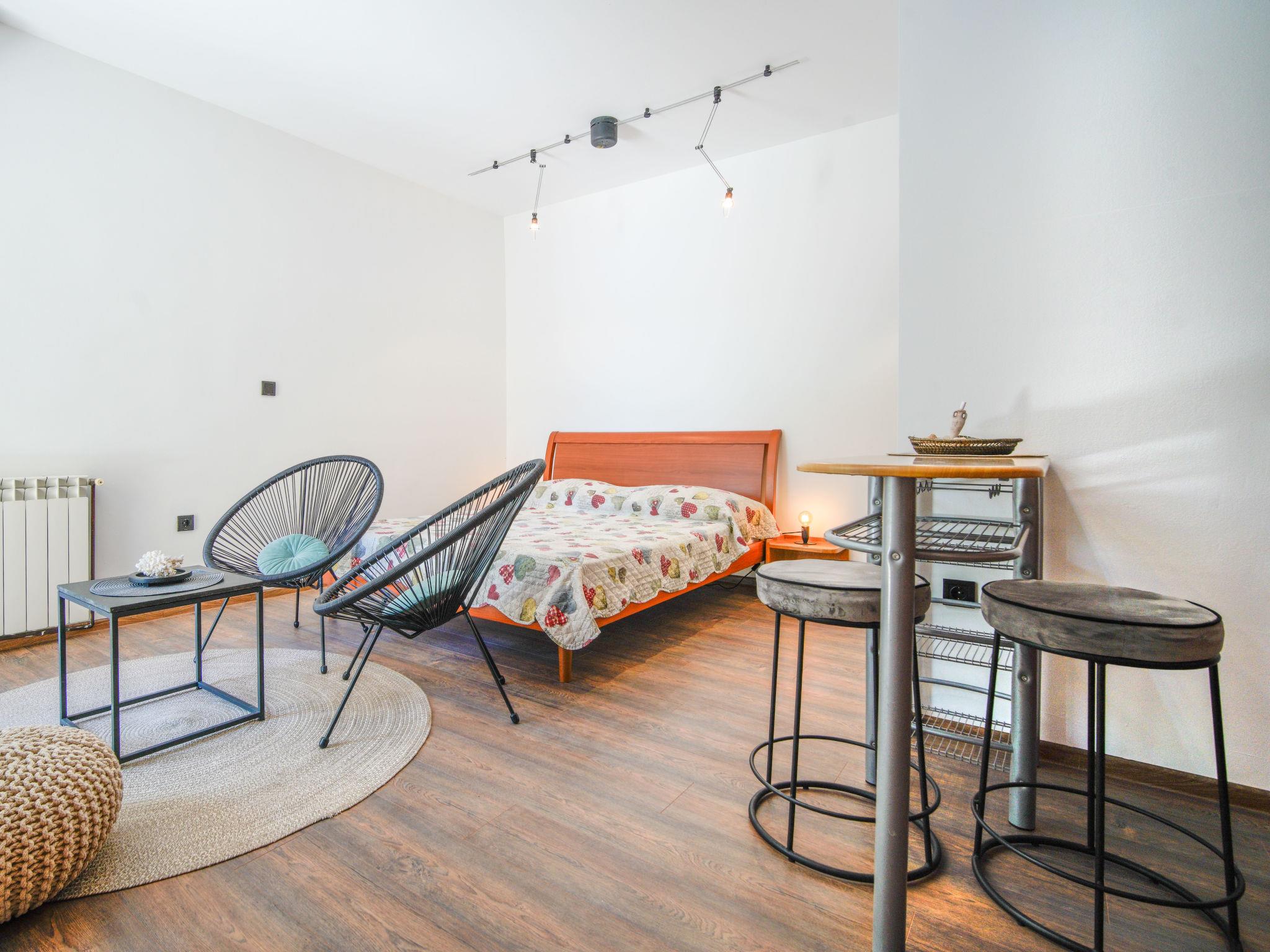 1-Zimmer-Studio 23 m2, im Erdgeschoss. 1 Zimmer mit 1 Doppelbett (2 x 80 cm, Länge 190 cm), Sat-TV und Klimaanlage. Kochnische (2 Glaskeramikplatten, Tiefkühler, elektrische Kaffeemaschine) mit Esstisch. Dusche/WC. Klimaanlage (extra). Terrasse 14 m2. Terrassenmöbel. Zur Verfügung: Internet (Wireless LAN, gratis). Bitte beachten: Maximal 1 Haustier/Hund erlaubt. Eigener Eingang.