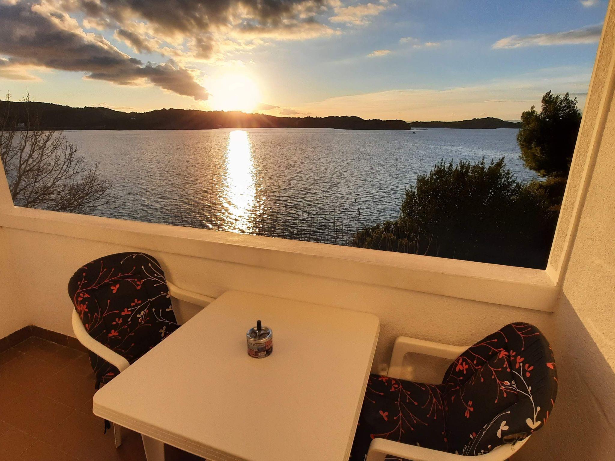 Durch die großen Glastüren im Wohnzimmer gelangen Sie auf Ihren privaten, sonnigen Balkon, wo ein Tisch und Stühle zum Entspannen bereitstehen. Es ist der perfekte Ort, um sich mit einem erfrischenden Glas kroatischen Weins zu entspannen und den Panoramablick auf das glitzernde blaue Meer und die weitläufige Bucht zu genießen, nachdem Sie einen Tag auf Erkundungstour waren oder sich am Strand entspannt haben.