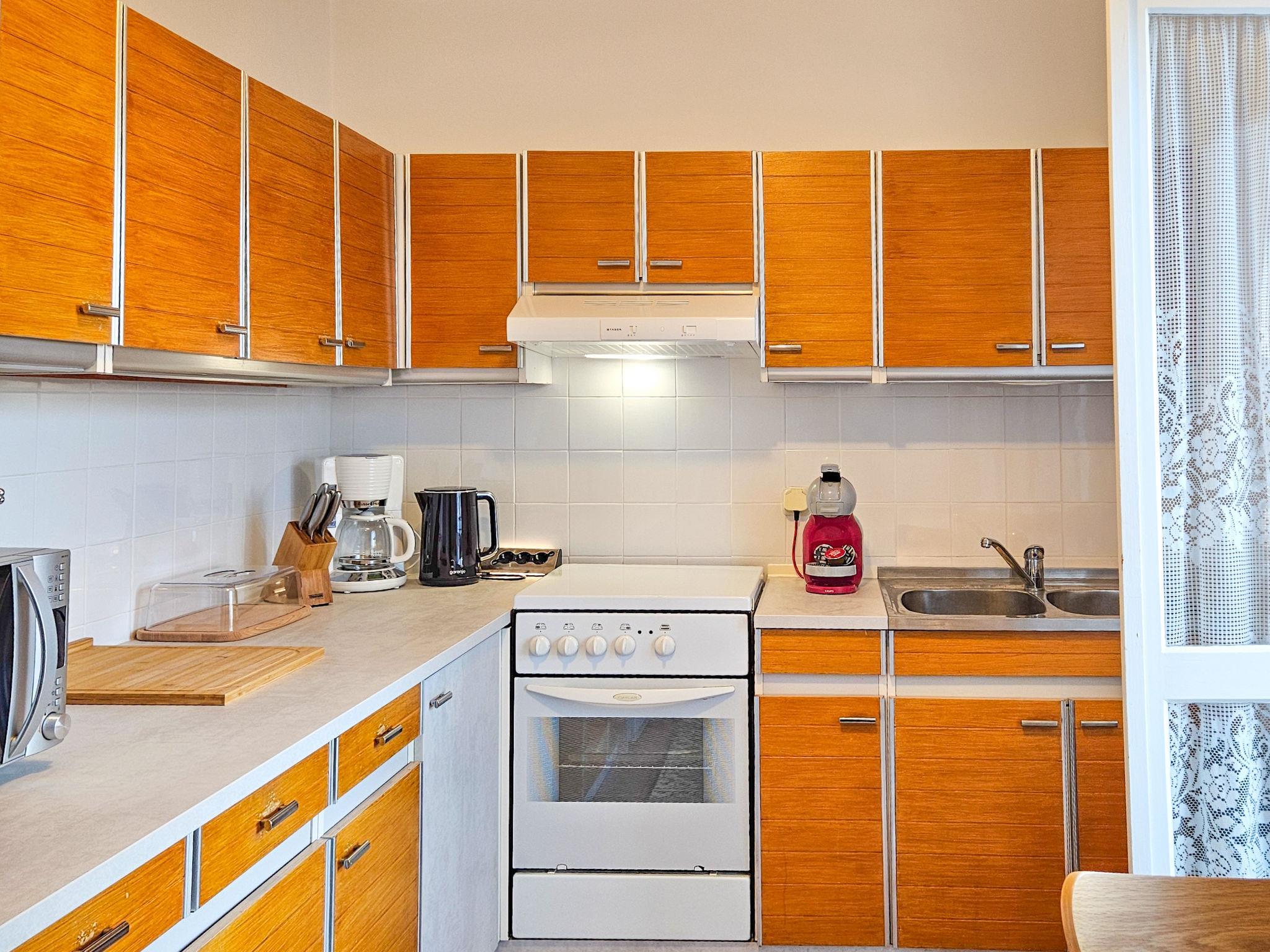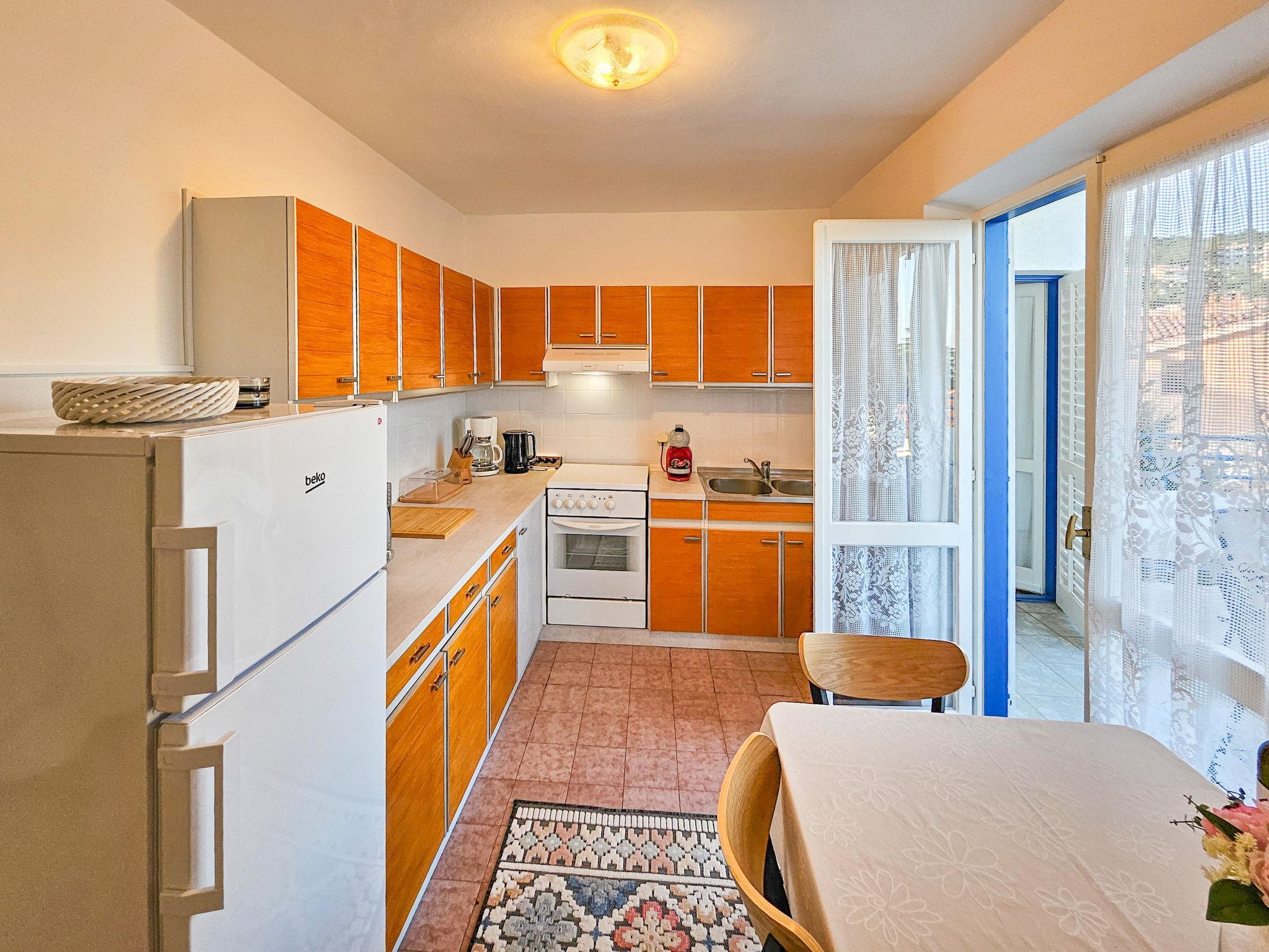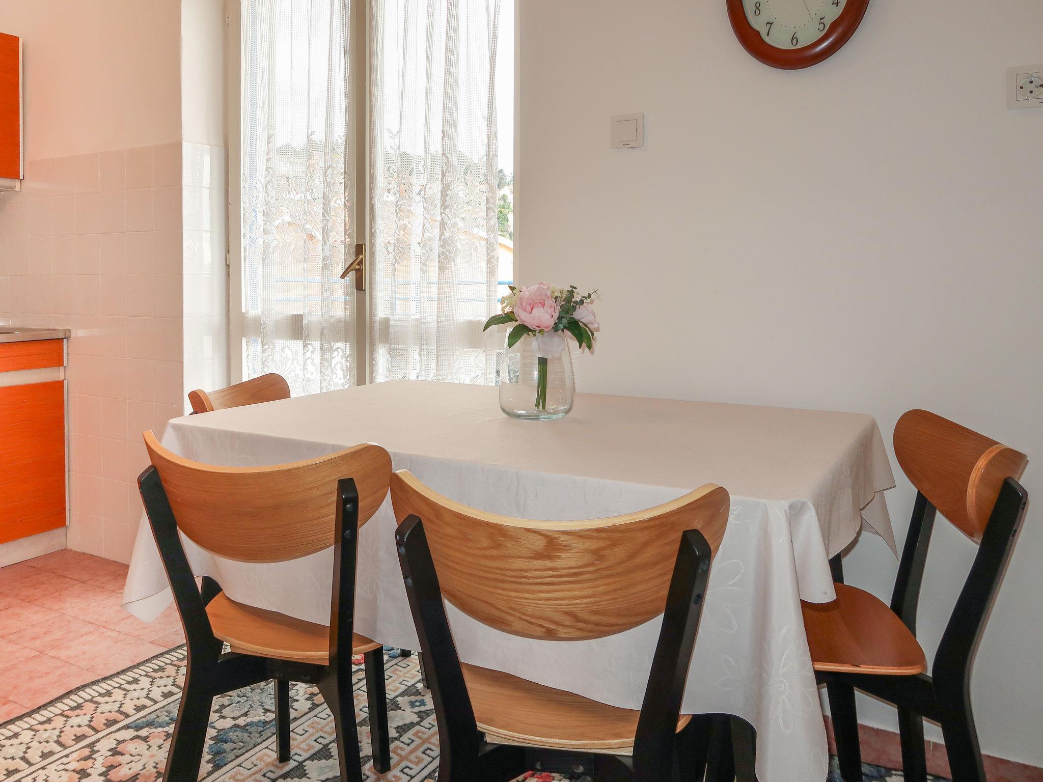 4-Zimmer-Wohnung 82 m2 im 1. Stock. Wohn-/Esszimmer mit Sat-TV und Klimaanlage. Ausgang zur Terrasse. 1 Zimmer mit 1 Bett (90 cm, Länge 200 cm), 1 franz. Bett (160 cm, Länge 200 cm). 1 Zimmer mit 1 Doppelbett (2 x 90 cm, Länge 200 cm). 1 Zimmer mit 2 Betten (90 cm, Länge 200 cm). Küche (1 Kochplatte, 3 Flammen, Toaster, Wasserkocher, Mikrowelle, Tiefkühler, elektrische Kaffeemaschine) mit Esstisch. Ausgang zur Terrasse. Bad/WC. Warmluftheizung. Grosse Terrasse 42 m2 teilweise überdacht Terrasse 10 m2 teilweise überdacht. Terrassenmöbel, Elektrogrill, Liegestühle. Sicht auf das Meer. Zur Verfügung: Haartrockner. Internet (Wireless LAN, gratis). Parkplatz (1 Auto) beim Haus. Bitte beachten: Nichtraucher-Haus. Maximal 1 Haustier/Hund erlaubt.