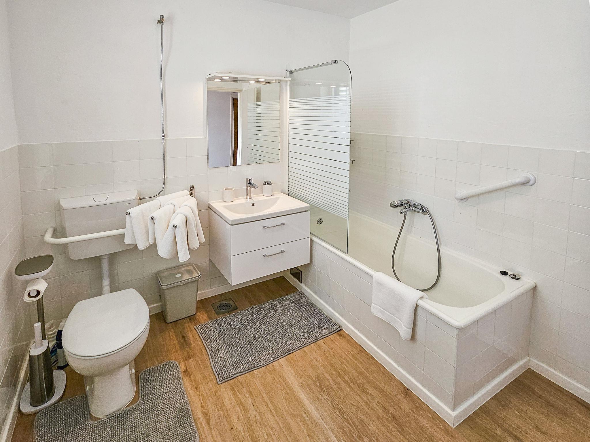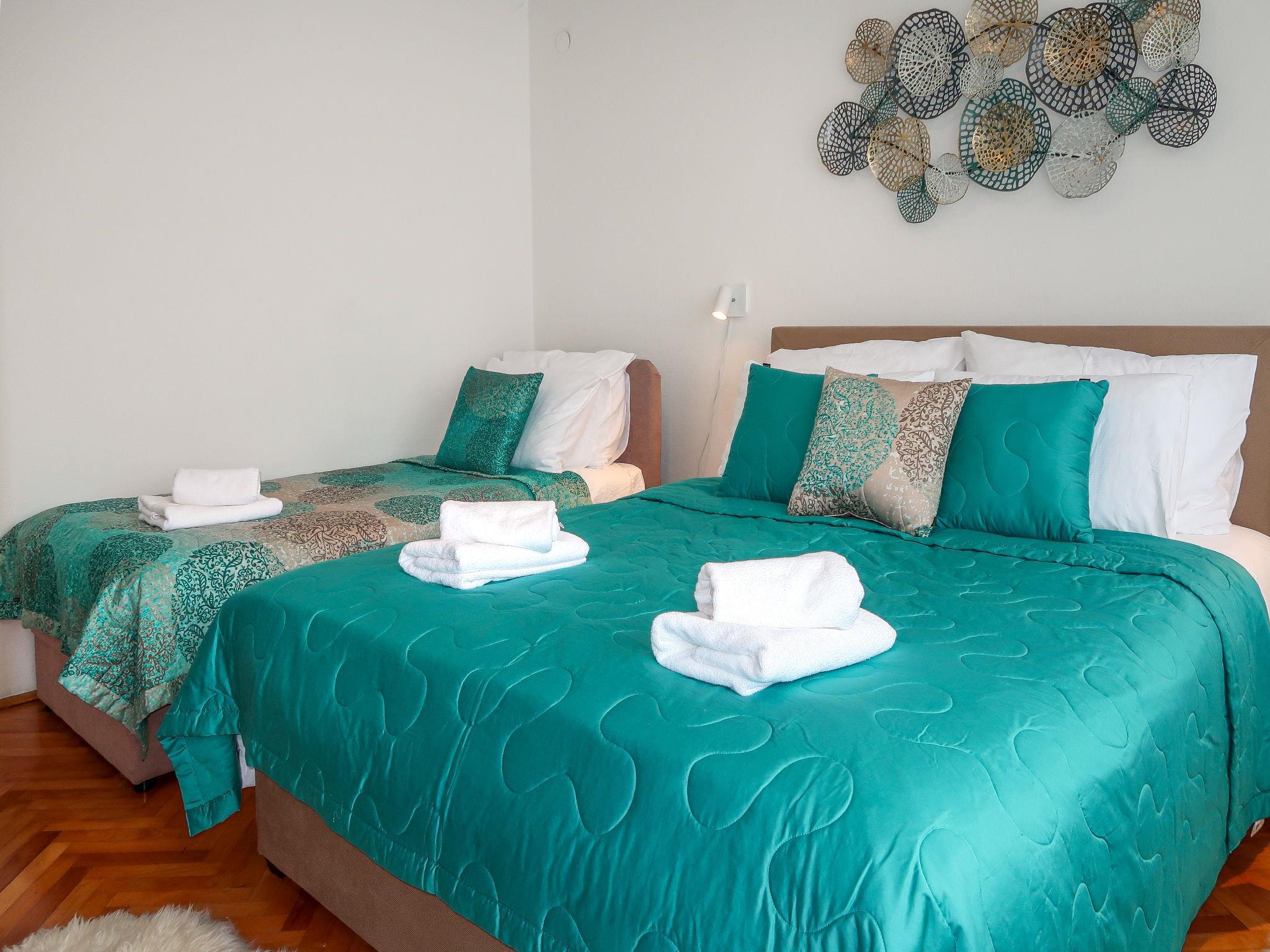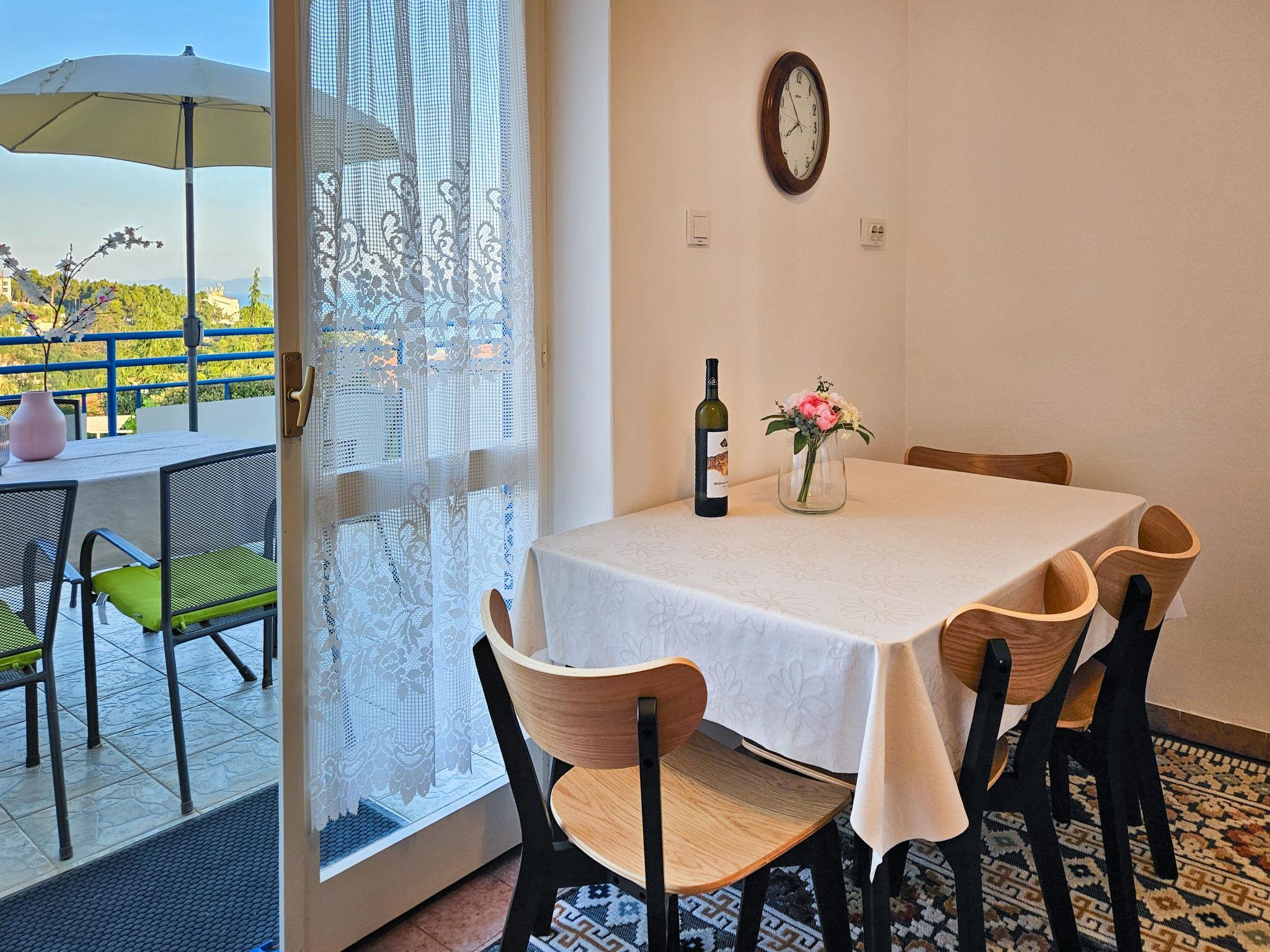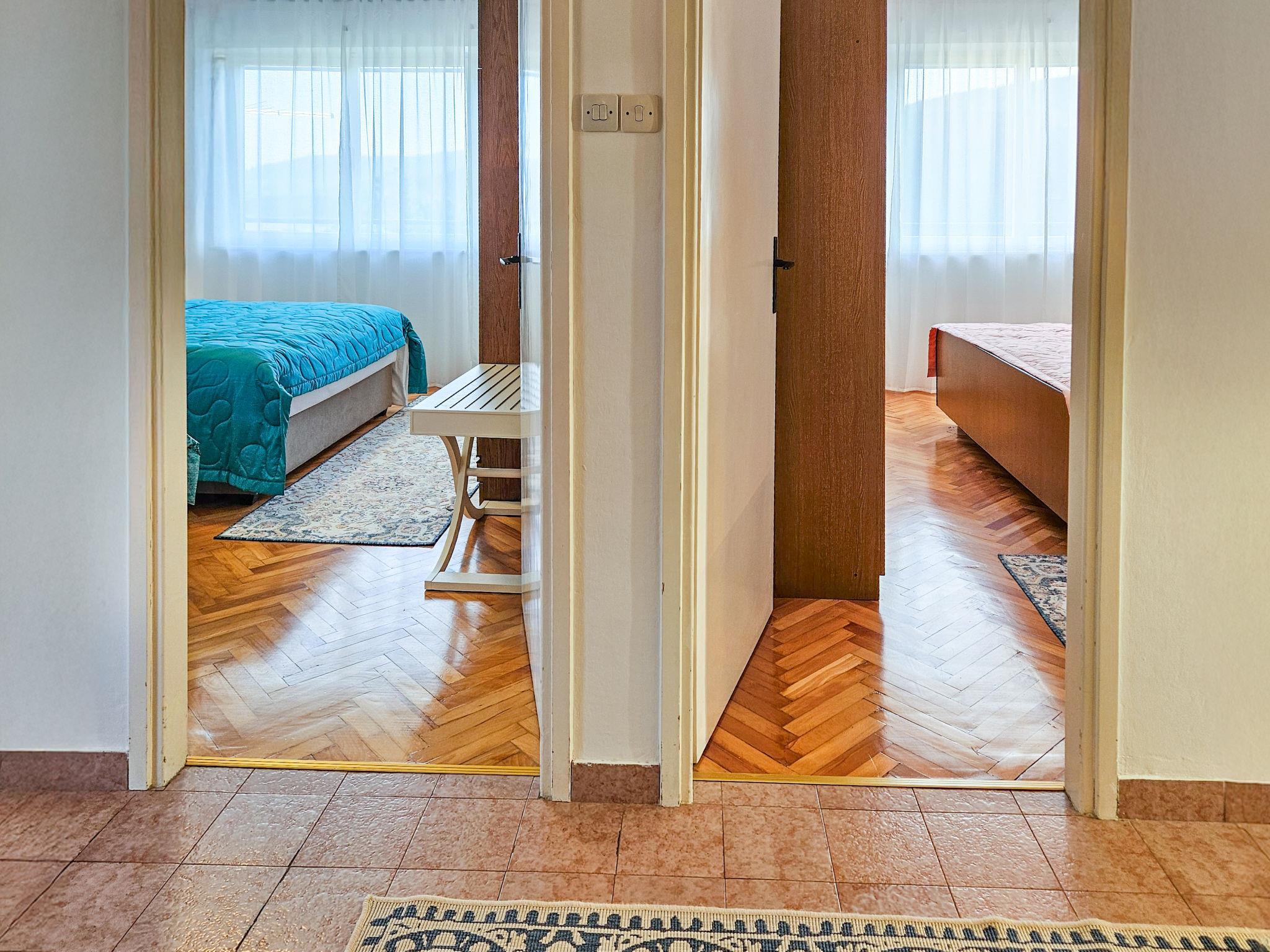 4-Zimmer-Wohnung 82 m2 im 1. Stock. Wohn-/Esszimmer mit Sat-TV und Klimaanlage. Ausgang zur Terrasse. 1 Zimmer mit 1 Bett (90 cm, Länge 200 cm), 1 franz. Bett (160 cm, Länge 200 cm). 1 Zimmer mit 1 Doppelbett (2 x 90 cm, Länge 200 cm). 1 Zimmer mit 2 Betten (90 cm, Länge 200 cm). Küche (1 Kochplatte, 3 Flammen, Toaster, Wasserkocher, Mikrowelle, Tiefkühler, elektrische Kaffeemaschine) mit Esstisch. Ausgang zur Terrasse. Bad/WC. Warmluftheizung. Grosse Terrasse 42 m2 teilweise überdacht Terrasse 10 m2 teilweise überdacht. Terrassenmöbel, Elektrogrill, Liegestühle. Sicht auf das Meer. Zur Verfügung: Haartrockner. Internet (Wireless LAN, gratis). Parkplatz (1 Auto) beim Haus. Bitte beachten: Nichtraucher-Haus. Maximal 1 Haustier/Hund erlaubt.