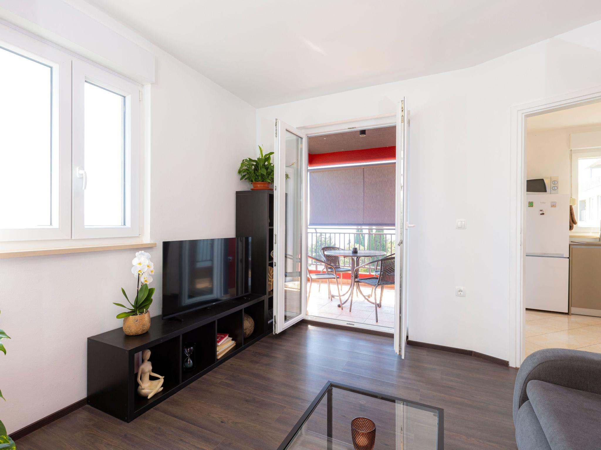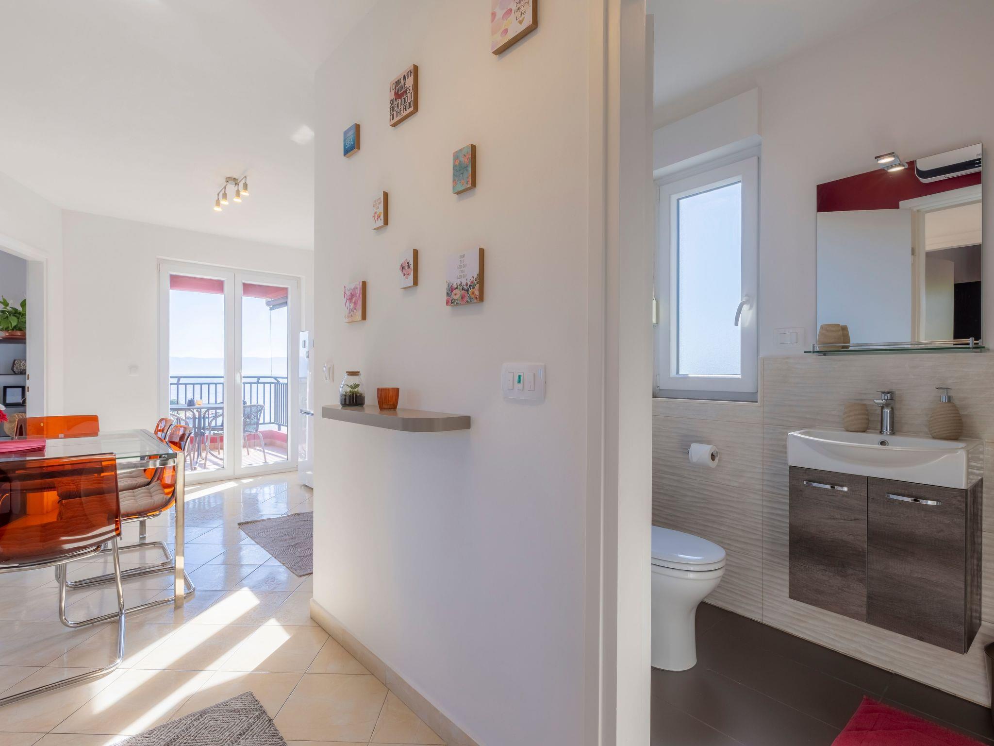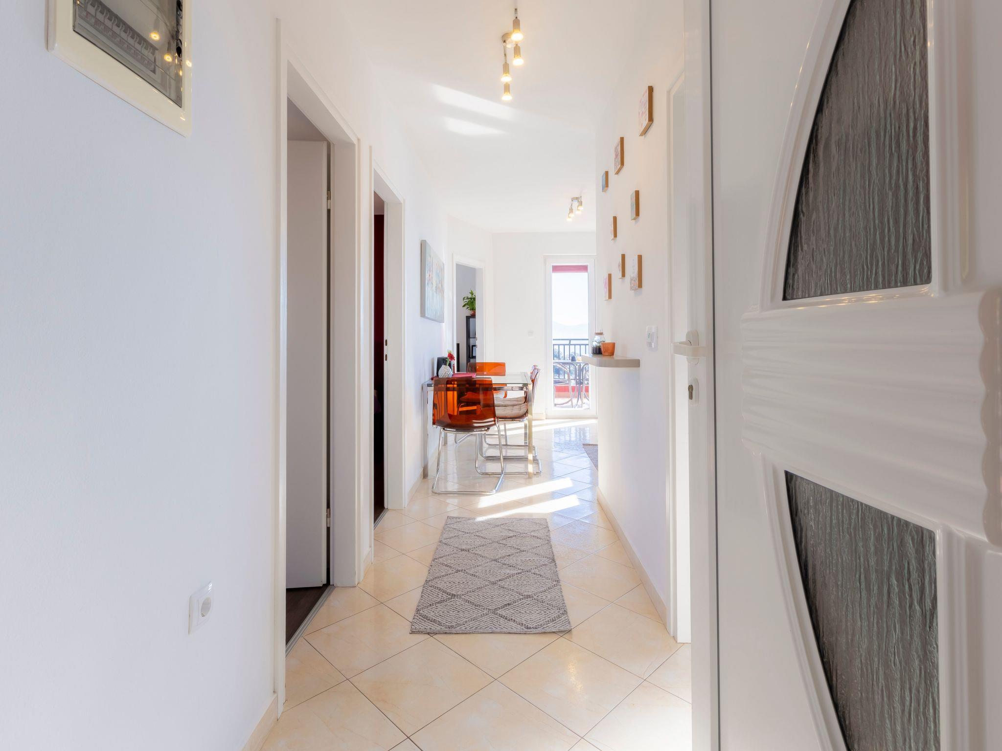 Der Balkon ist sowohl von der Küche als auch vom Wohnzimmer aus zugänglich. Hier kann man stundenlang sitzen und den herrlichen Ausblick auf das Meer und die Insel Cres genießen. Ein Sonnenschutz sorgt sowohl für den nötigen Schatten an heißen Tagen als auch für zusätzliche Privatsphäre.