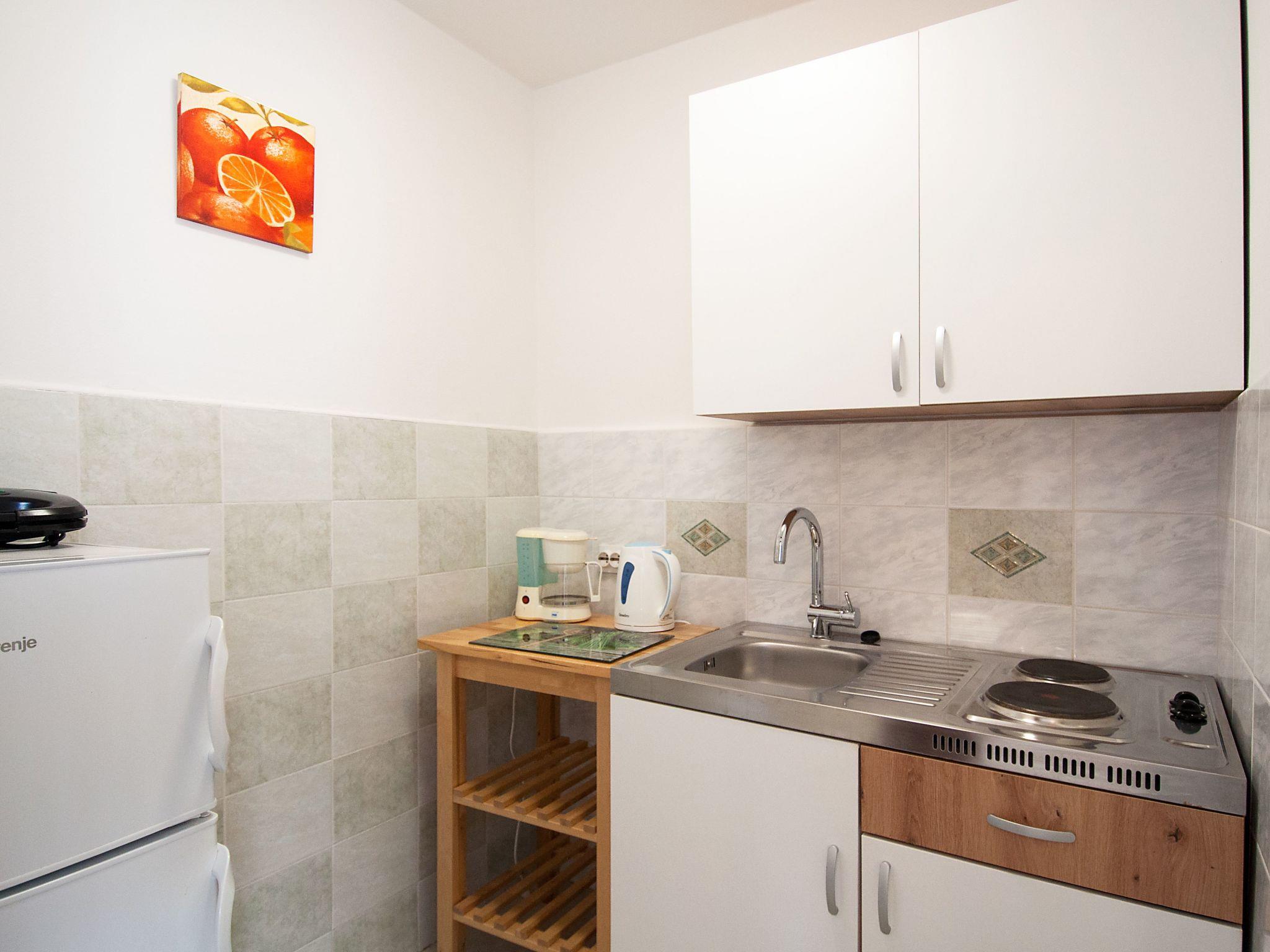 Inside, the apartment is equipped with essential amenities to ensure a comfortable stay. It features a practical kitchenette with a 2-plate stove, a filter coffee machine, and an electric kettle, ideal for preparing light meals or a morning coffee to start your day right. The accommodation includes one bathroom with a shower, ensuring privacy and convenience for guests. The partial air conditioning keeps the space at a pleasant temperature during warmer days.