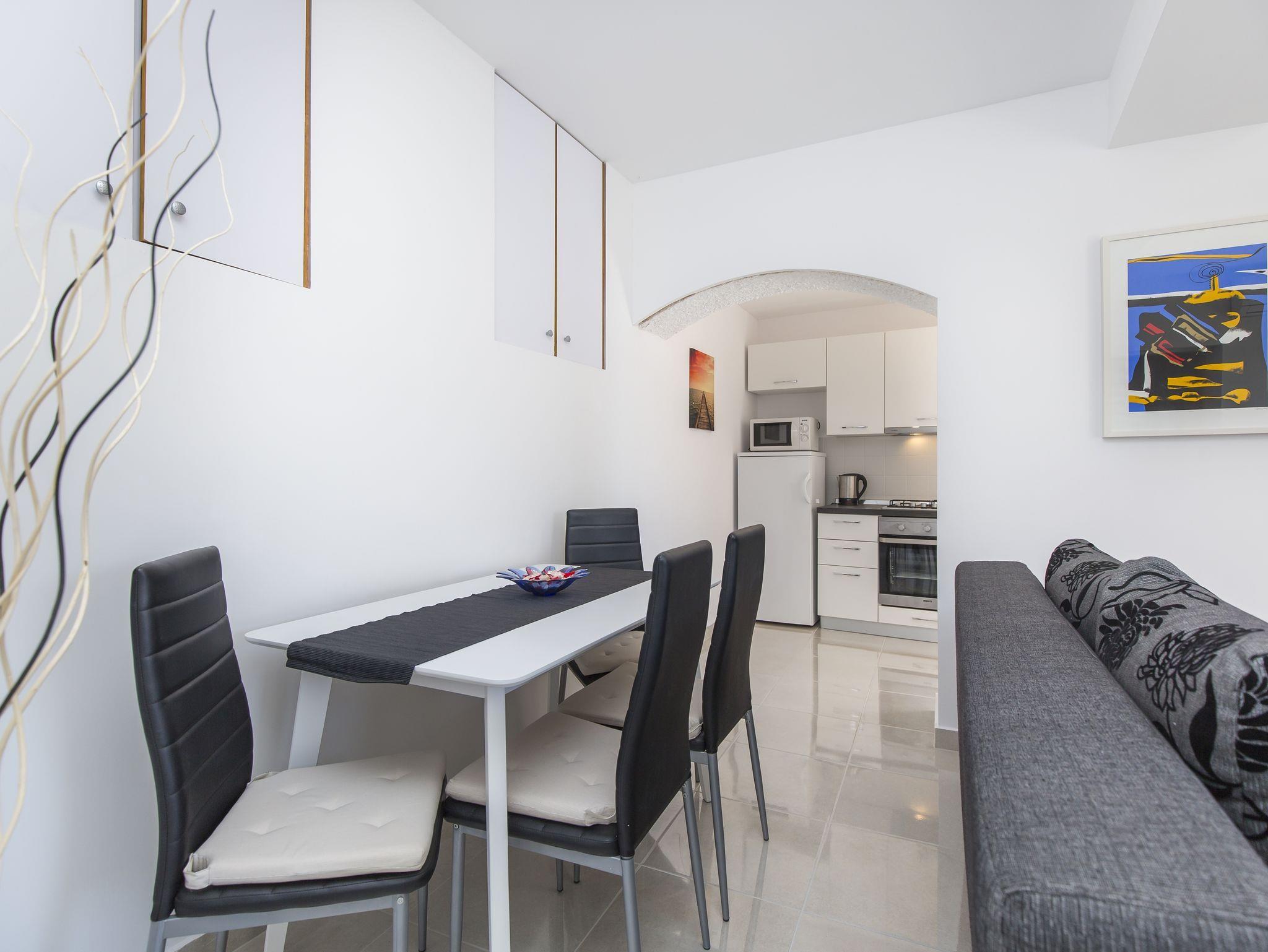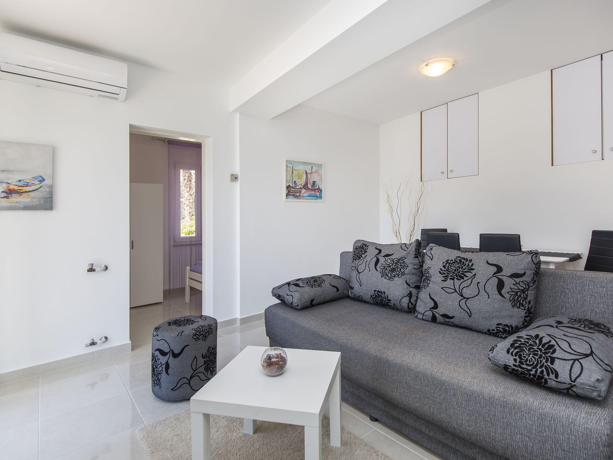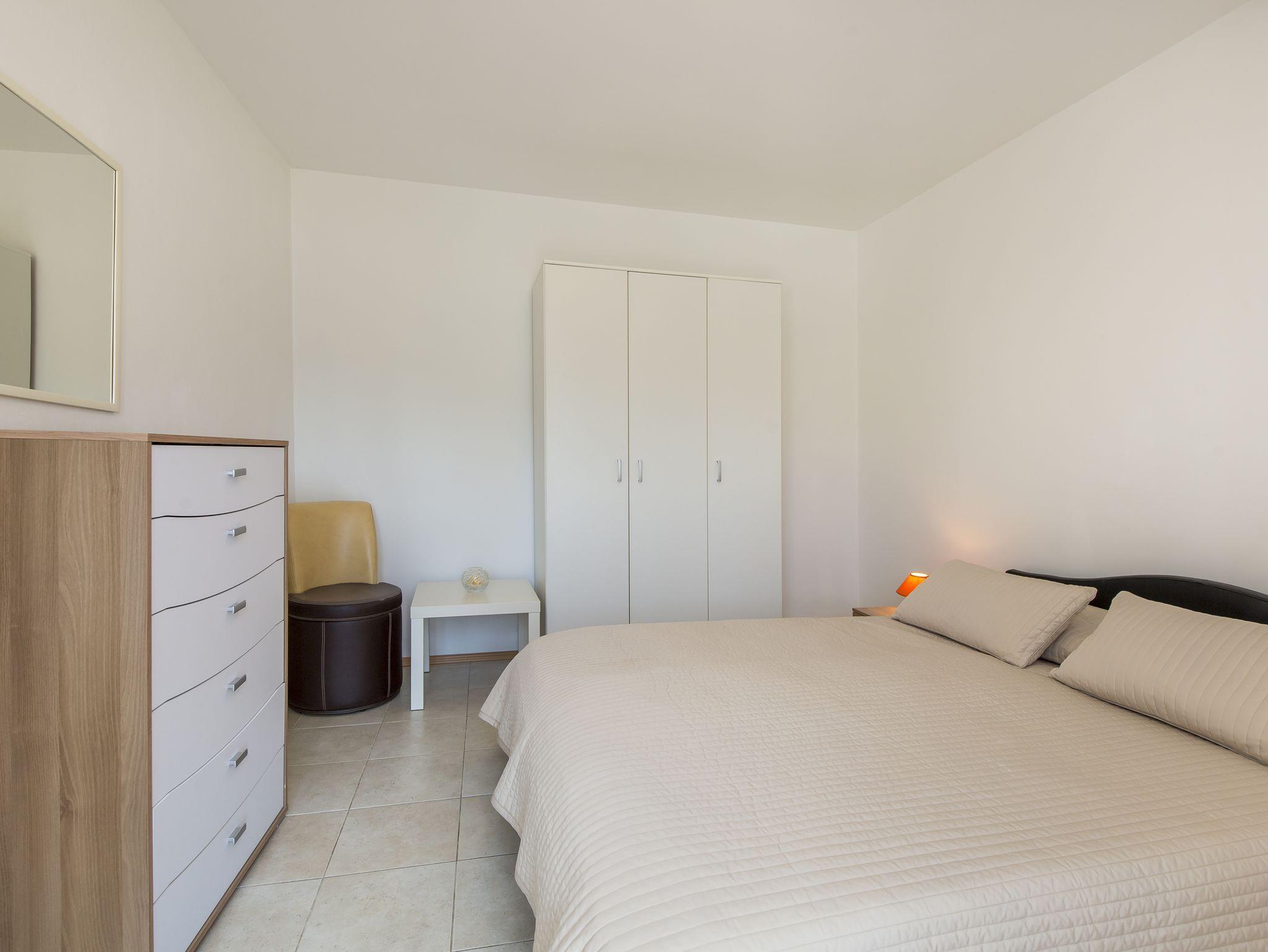 Ferienwohnung bietet Platz für 4 Gäste. Die Betten sind in Schlafzimmern, die es 2 gibt, und in Wohnzimmer, innerhalb einer Gesamtfläche von 50m2, angeordnet. Die Gäste haben eine eigene Terrasse zur Verfügung, auf der sie in warmen Sommernächten genießen können. Das Apartment bietet Meerblick. IM PREIS INBEGRIFFEN: Kurtaxe, Endreinigung, Klimatisierung, Parkplatz, Internet, Föhn. VERBINDLICHE ZUSÄTZLICHE KOSTEN: Aufzahlung für Kurzaufenthalte (prozentualer Zuschlag pro Nächtigungsanzahl: 30% - 1, 20% - 2, 10% - 3). Die Verfügbarkeit zusätzlicher Dienstleistungen in Ihrem reservierten Termin und die Preise derselben (falls nicht aufgeführt) müssen im Voraus überprüft werden. Zusätzliche Dienstleistungen die in der Zahlungsaufforderung nicht aufgeführt sind werden direkt beim Vermieter bezahlt, angenommen der Gast nutzt auch diese.