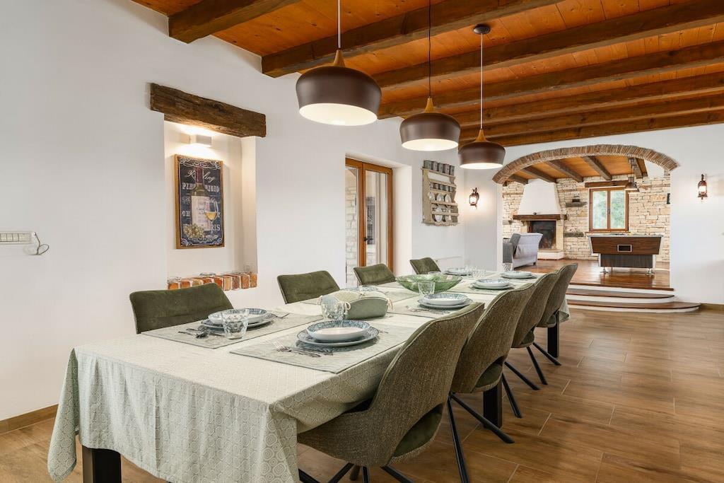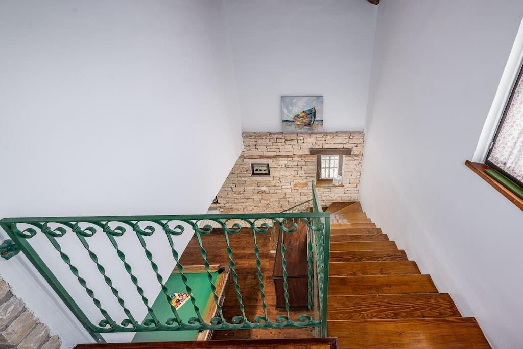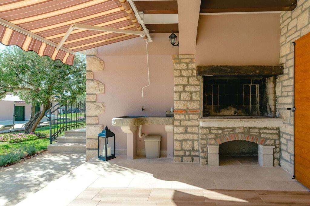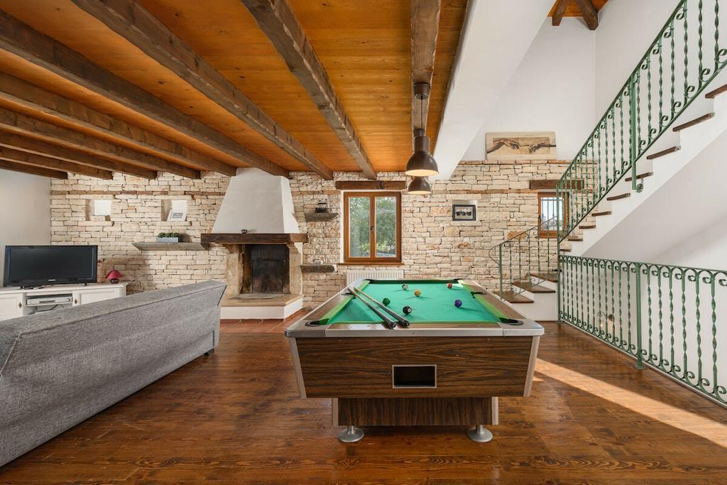 Charmante Villa Marijanin Vrt mit Pool und herrlichem Garten im Herzen von Istrien, Ribari, Tinjan. Die Villa Marijanin Vrt ist eine traditionelle istrische Villa mit Pool und einem sehr großen Garten Es besteht aus 3 Schlafzimmern mit jeweils Klimaanlage, zwei der Schlafzimmer mit eigenem Bad und einem separaten Bad im ersten Stock. Im Erdgeschoss befindet sich eine geräumige, voll ausgestattete Küche, ein großer Ess- und Wohnbereich, ein Abstellraum und eine Toilette. Es gibt auch eine Klimaanlage im Wohnbereich. Das Schlafsofa im Wohnbereich bietet Platz für zwei weitere Personen Im Wohnbereich befindet sich ein Billardtisch und im Untergeschoss befindet sich ein Fitnessraum. Wohn- und Essbereich öffnen sich zu einer überdachten Terrasse mit großem Tisch und Stühlen, Grill, Garten. Die Terrasse überblickt den Pool, den Spielplatz und die überdachte Außenküche mit einem weiteren größeren Grill, Tisch und Stühlen. Es gibt einen überdachten Parkplatz.