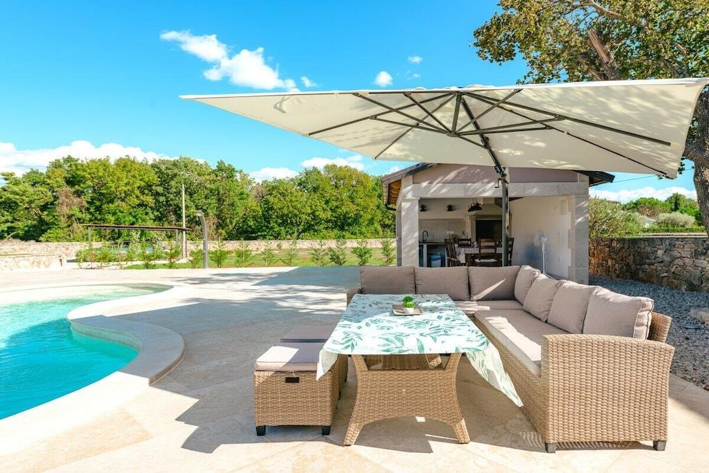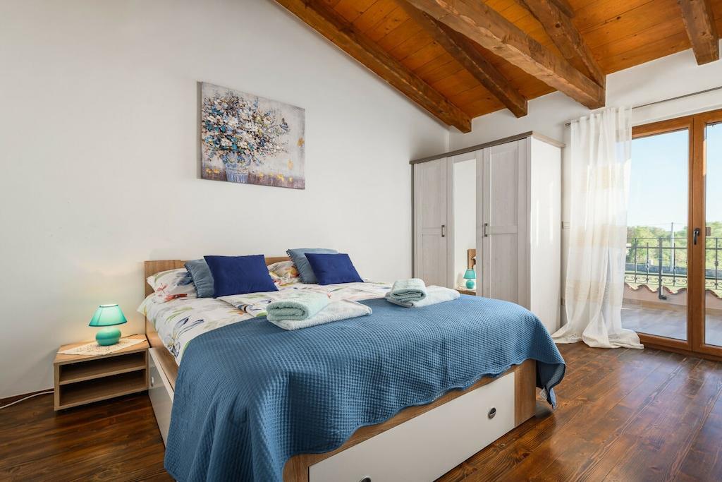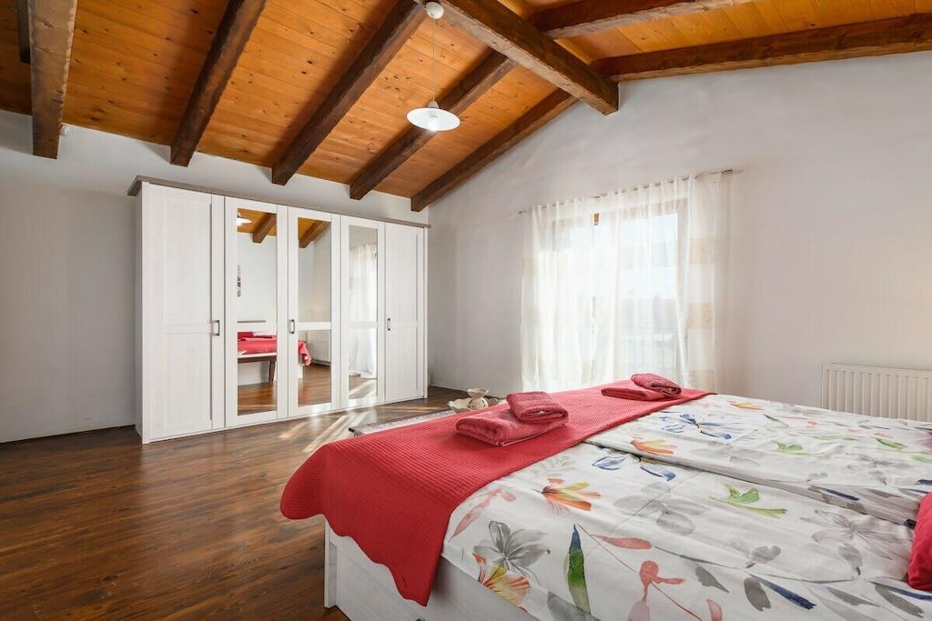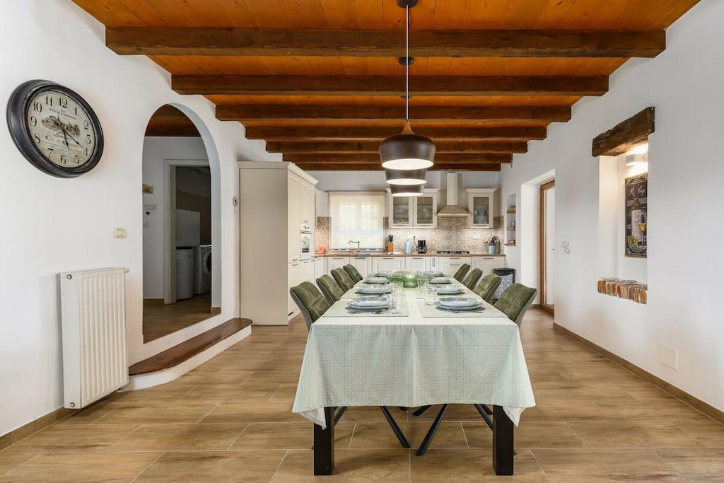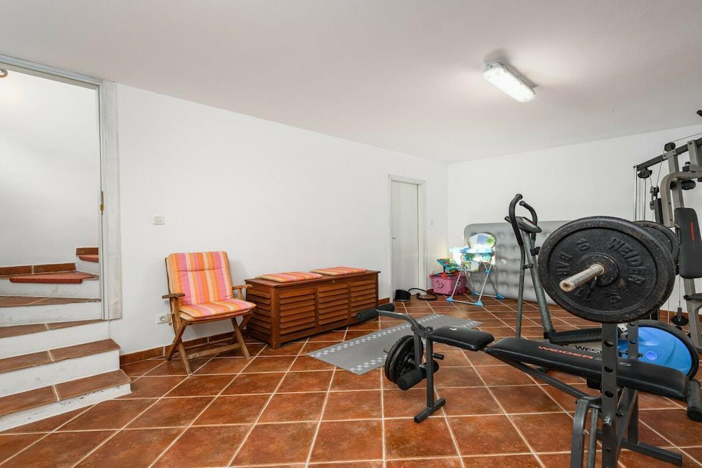 Charmante Villa Marijanin Vrt mit Pool und herrlichem Garten im Herzen von Istrien, Ribari, Tinjan. Die Villa Marijanin Vrt ist eine traditionelle istrische Villa mit Pool und einem sehr großen Garten Es besteht aus 3 Schlafzimmern mit jeweils Klimaanlage, zwei der Schlafzimmer mit eigenem Bad und einem separaten Bad im ersten Stock. Im Erdgeschoss befindet sich eine geräumige, voll ausgestattete Küche, ein großer Ess- und Wohnbereich, ein Abstellraum und eine Toilette. Es gibt auch eine Klimaanlage im Wohnbereich. Das Schlafsofa im Wohnbereich bietet Platz für zwei weitere Personen Im Wohnbereich befindet sich ein Billardtisch und im Untergeschoss befindet sich ein Fitnessraum. Wohn- und Essbereich öffnen sich zu einer überdachten Terrasse mit großem Tisch und Stühlen, Grill, Garten. Die Terrasse überblickt den Pool, den Spielplatz und die überdachte Außenküche mit einem weiteren größeren Grill, Tisch und Stühlen. Es gibt einen überdachten Parkplatz.