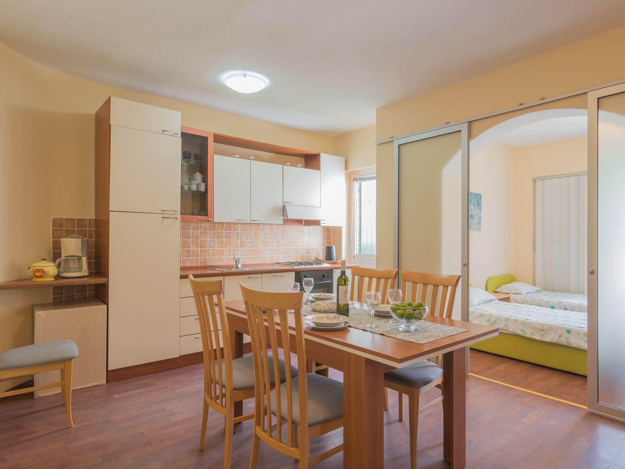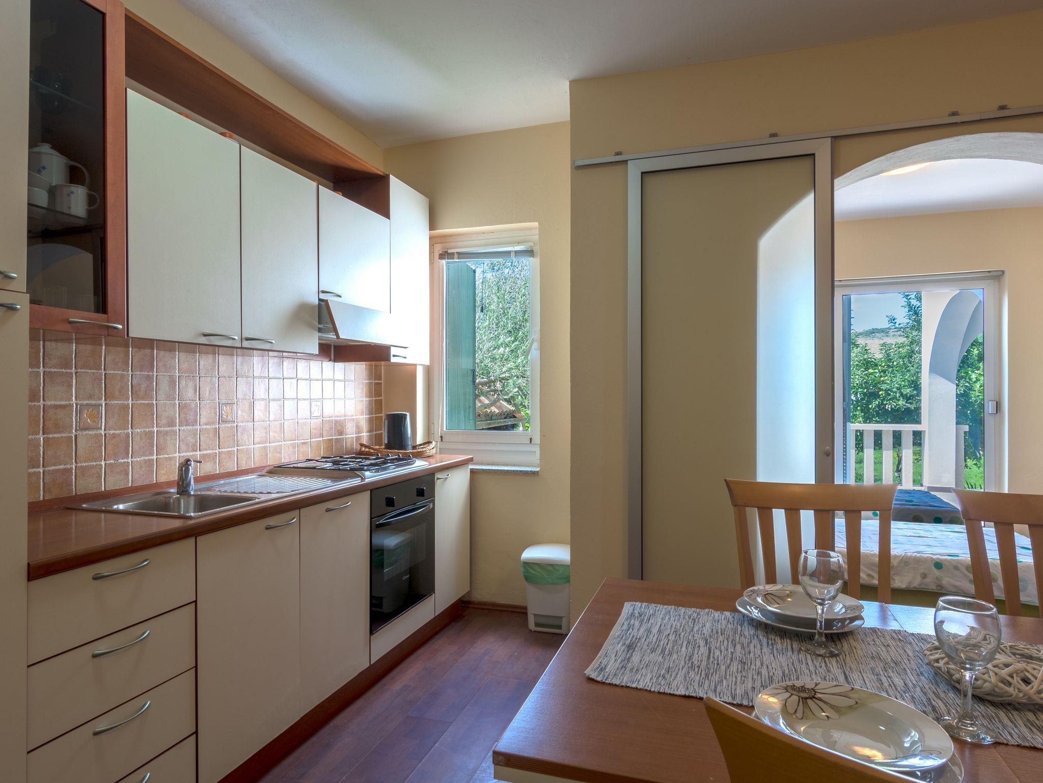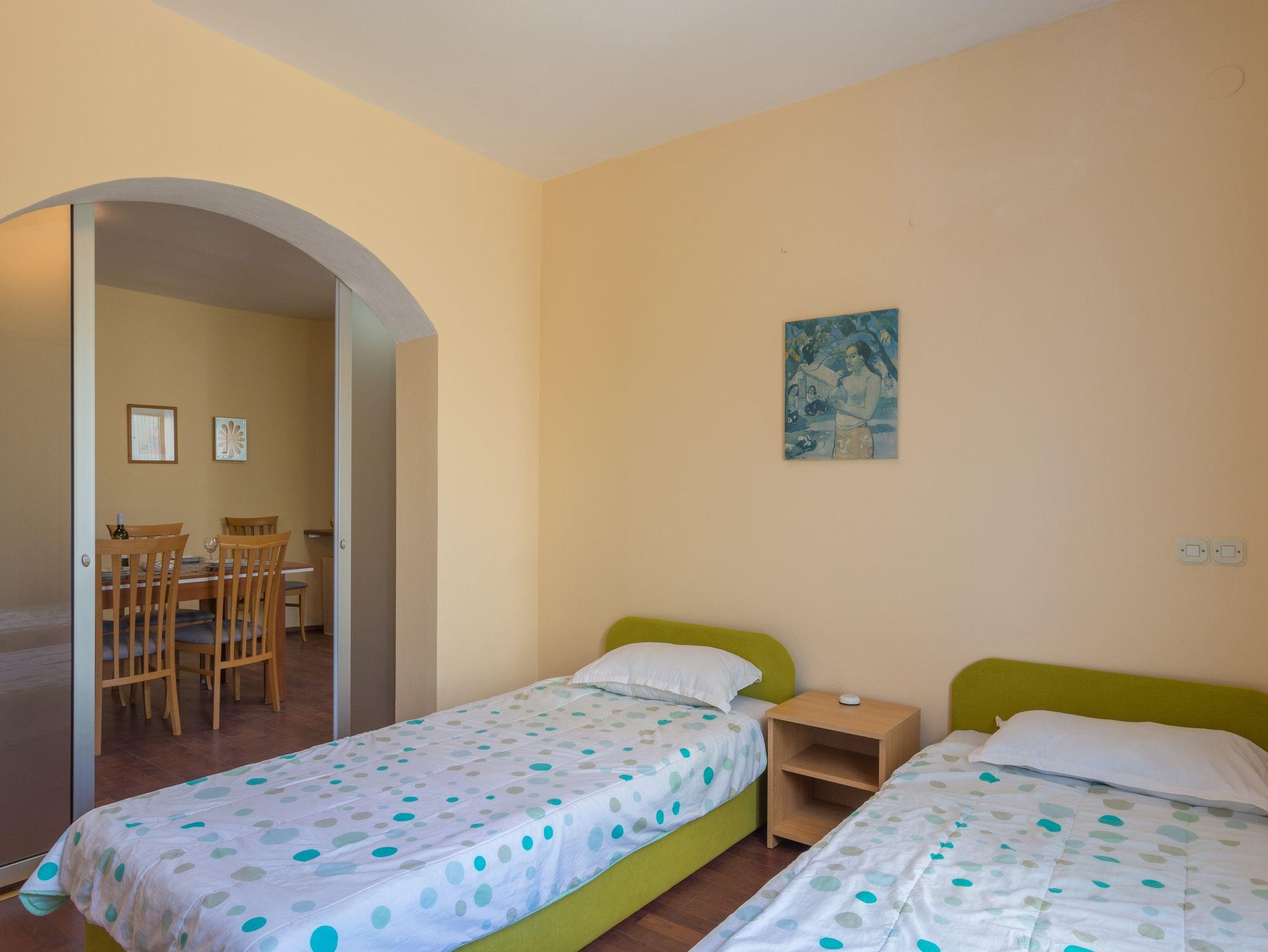 Ferienwohnung bietet Platz für 5 Gäste. Die Betten sind in Schlafzimmern, die es 2 gibt, und in Wohnzimmer, innerhalb einer Gesamtfläche von 59m2, angeordnet. Die Gäste haben eine eigene Terrasse zur Verfügung, auf der sie in warmen Sommernächten genießen können. Das Apartment bietet Meerblick. Es ist erlaubt, Speisen auf dem Gemeinschafts-Grill vorzubereiten. In der Unterkunftseinheit besteht die Möglichkeit des Mitbringens von Haustieren gegen Aufpreis. In der gebuchten Unterkunftseinheit zahlt man am Ort ein Depositum ( der Preis ist an der Internetseite angeführt ). IM PREIS INBEGRIFFEN: Kurtaxe, Endreinigung, Klimatisierung, Parkplatz, Internet, Kinderbett, Bügeleisen, Bügelbrett, Föhn. VERBINDLICHE ZUSÄTZLICHE KOSTEN: Kaution (100,00 € Einmalzahlung). UNVERBINDLICHE ZUSÄTZLICHE KOSTEN: Wäschewaschen (5,00 € Waschen), Bootsanlegeplatz (20,00 € pro Nacht), Haustiere (10,00 € pro Nacht), Fahrrad (7,00 € täglich (pro Stück)). Die Verfügbarkeit zusätzlicher Dienstleistungen in Ihrem reservierten Termin und die Preise derselben (falls nicht aufgeführt) müssen im Voraus überprüft werden. Zusätzliche Dienstleistungen die in der Zahlungsaufforderung nicht aufgeführt sind werden direkt beim Vermieter bezahlt, angenommen der Gast nutzt auch diese.