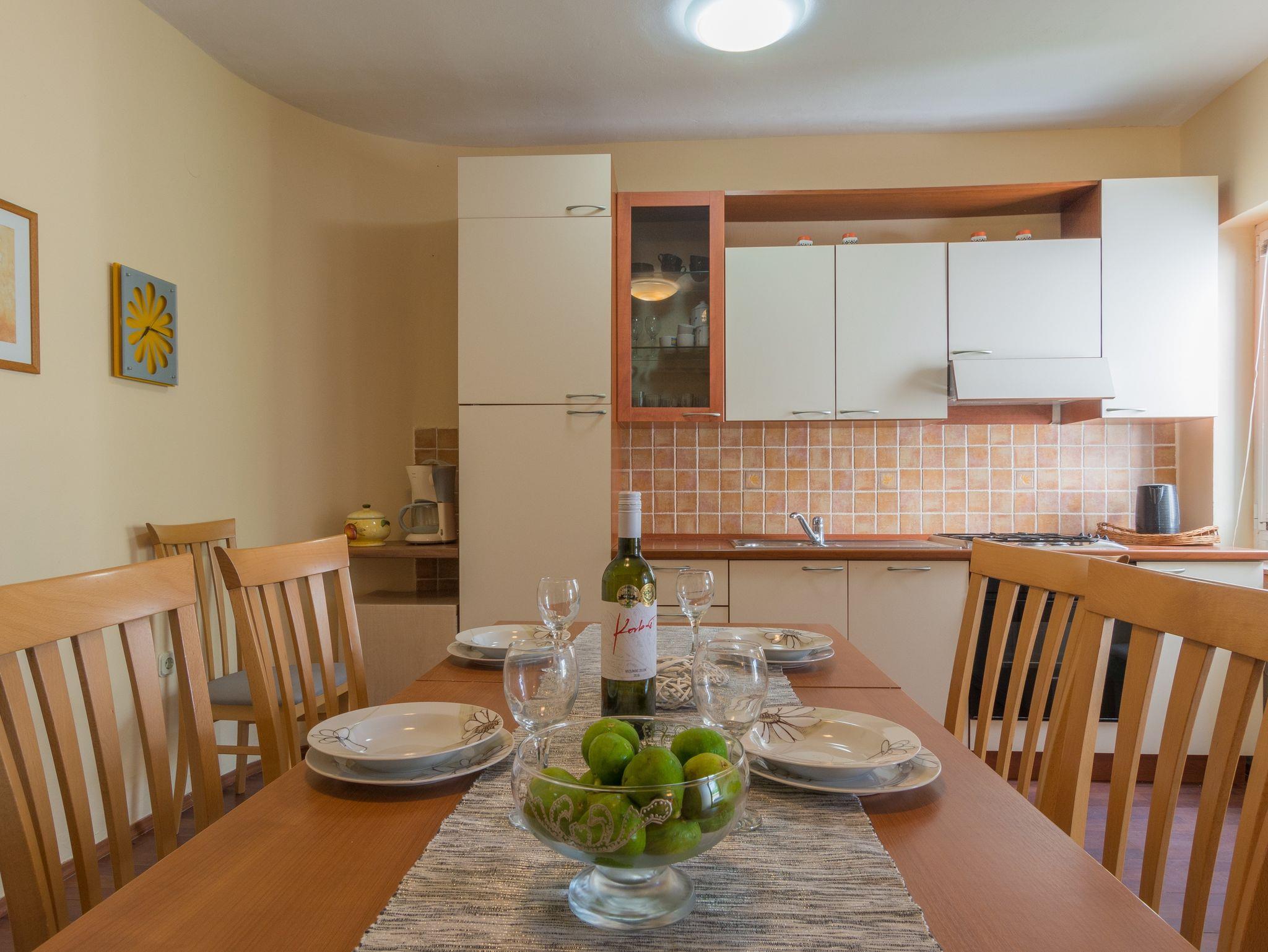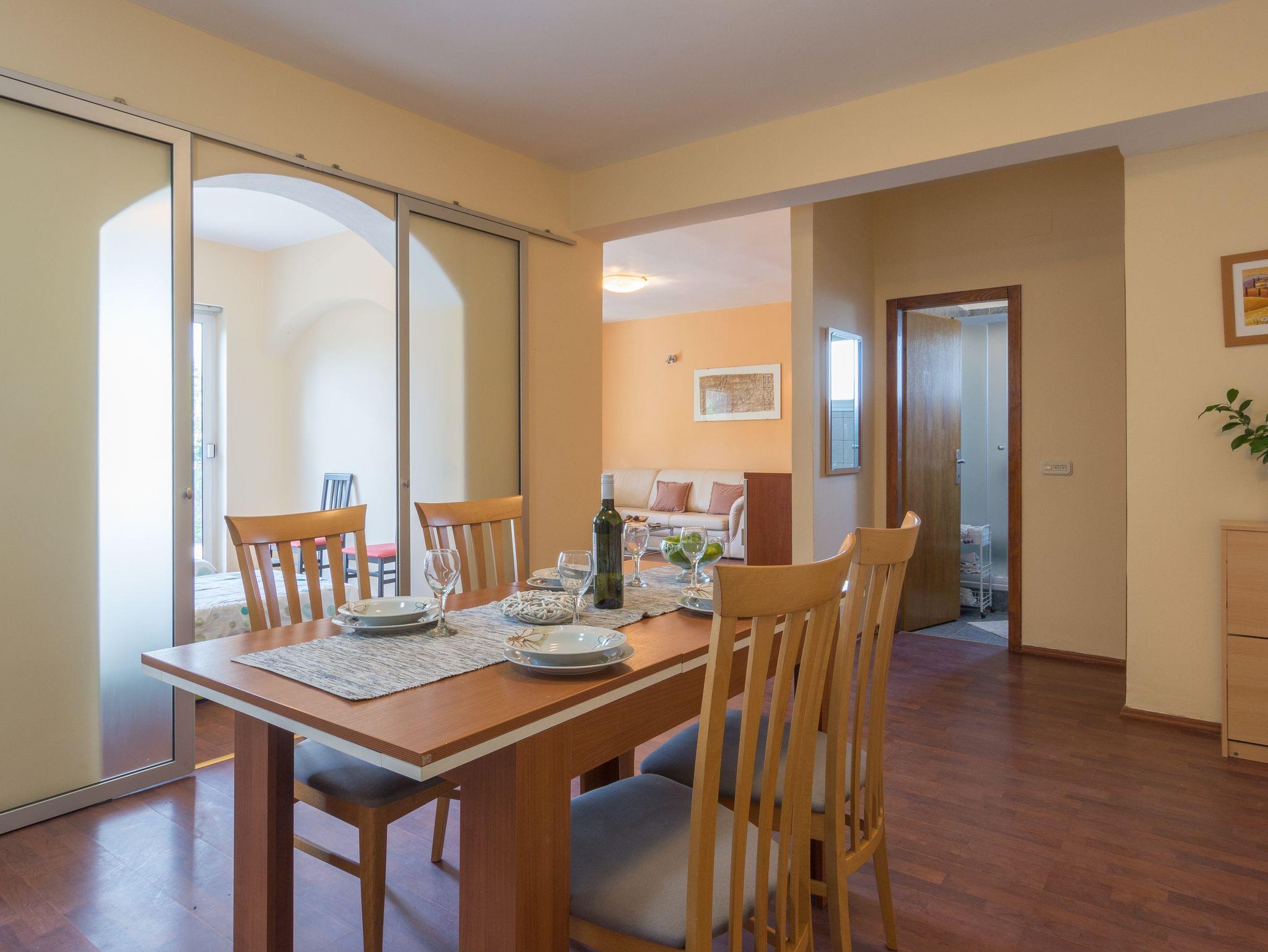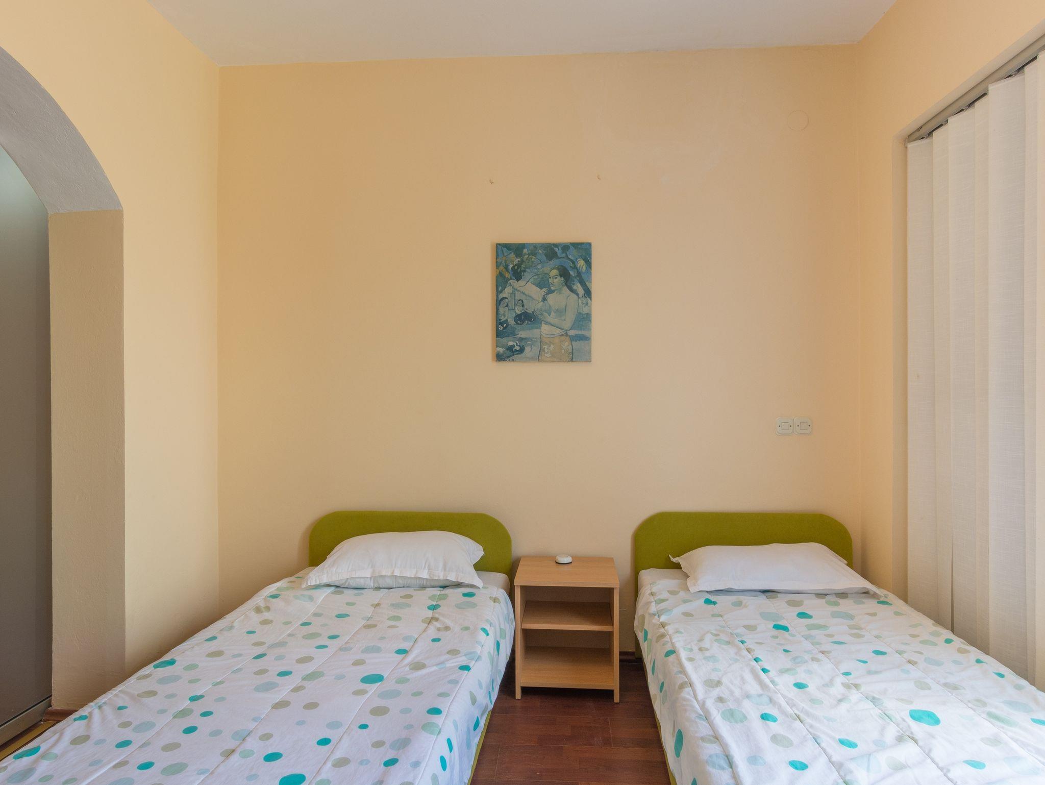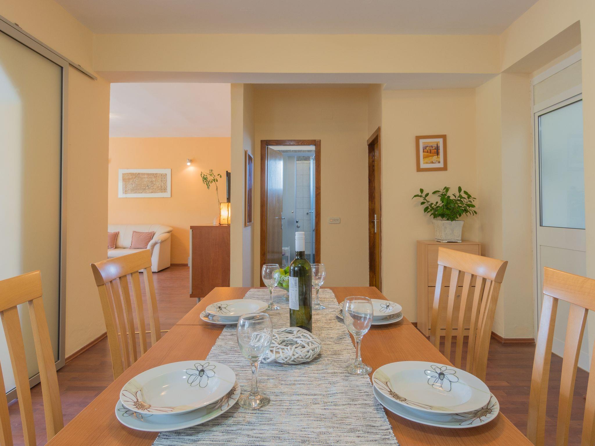 Ferienwohnung bietet Platz für 5 Gäste. Die Betten sind in Schlafzimmern, die es 2 gibt, und in Wohnzimmer, innerhalb einer Gesamtfläche von 59m2, angeordnet. Die Gäste haben eine eigene Terrasse zur Verfügung, auf der sie in warmen Sommernächten genießen können. Das Apartment bietet Meerblick. Es ist erlaubt, Speisen auf dem Gemeinschafts-Grill vorzubereiten. In der Unterkunftseinheit besteht die Möglichkeit des Mitbringens von Haustieren gegen Aufpreis. In der gebuchten Unterkunftseinheit zahlt man am Ort ein Depositum ( der Preis ist an der Internetseite angeführt ). IM PREIS INBEGRIFFEN: Kurtaxe, Endreinigung, Klimatisierung, Parkplatz, Internet, Kinderbett, Bügeleisen, Bügelbrett, Föhn. VERBINDLICHE ZUSÄTZLICHE KOSTEN: Kaution (100,00 € Einmalzahlung). UNVERBINDLICHE ZUSÄTZLICHE KOSTEN: Wäschewaschen (5,00 € Waschen), Bootsanlegeplatz (20,00 € pro Nacht), Haustiere (10,00 € pro Nacht), Fahrrad (7,00 € täglich (pro Stück)). Die Verfügbarkeit zusätzlicher Dienstleistungen in Ihrem reservierten Termin und die Preise derselben (falls nicht aufgeführt) müssen im Voraus überprüft werden. Zusätzliche Dienstleistungen die in der Zahlungsaufforderung nicht aufgeführt sind werden direkt beim Vermieter bezahlt, angenommen der Gast nutzt auch diese.