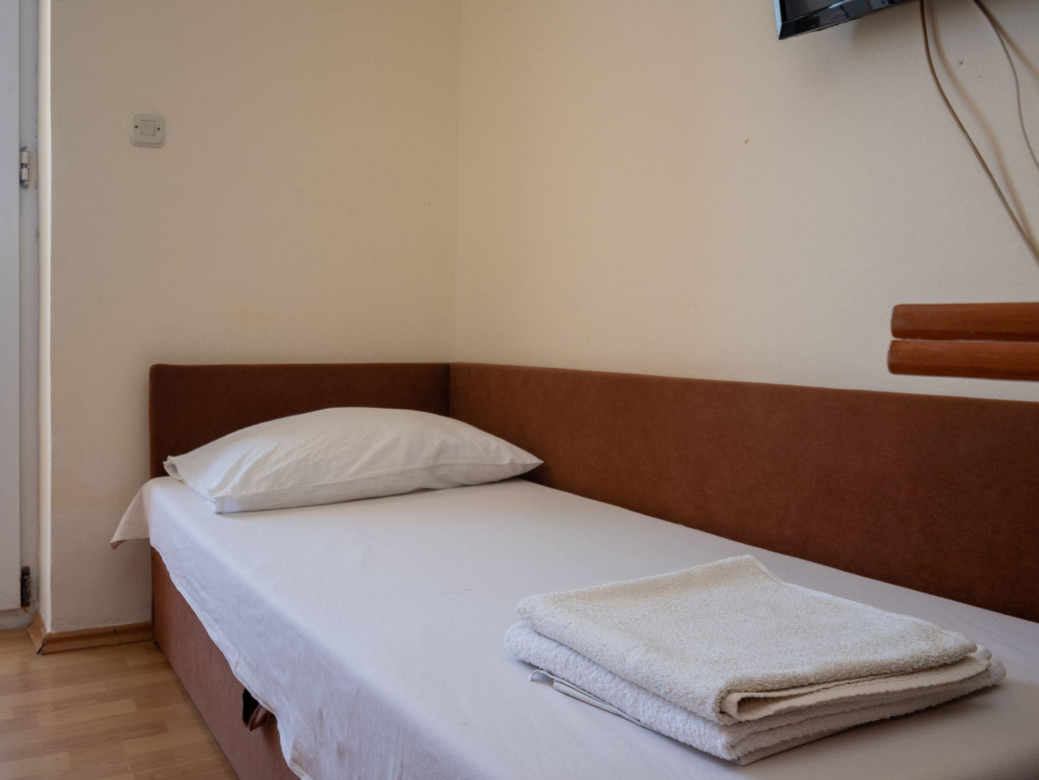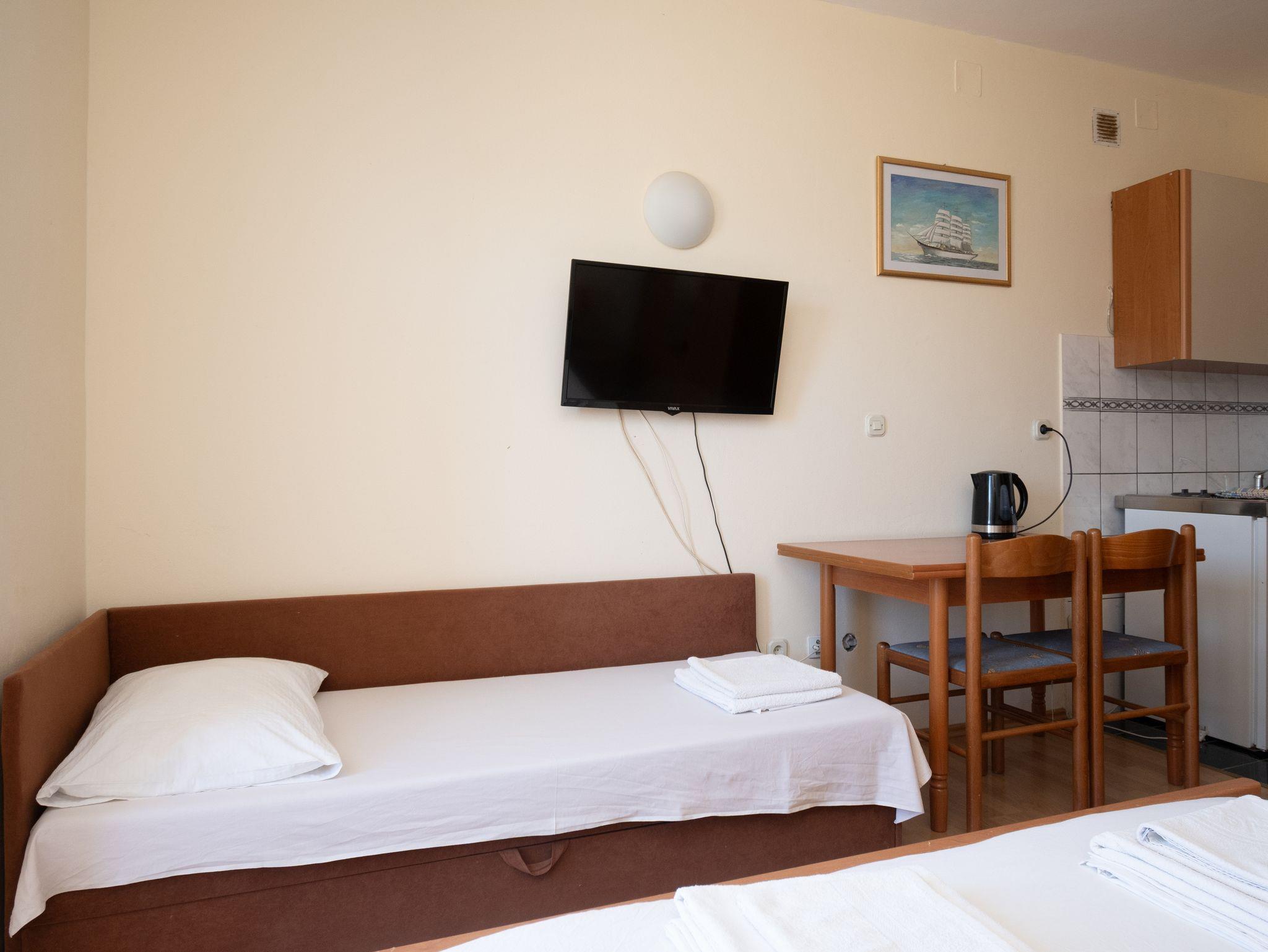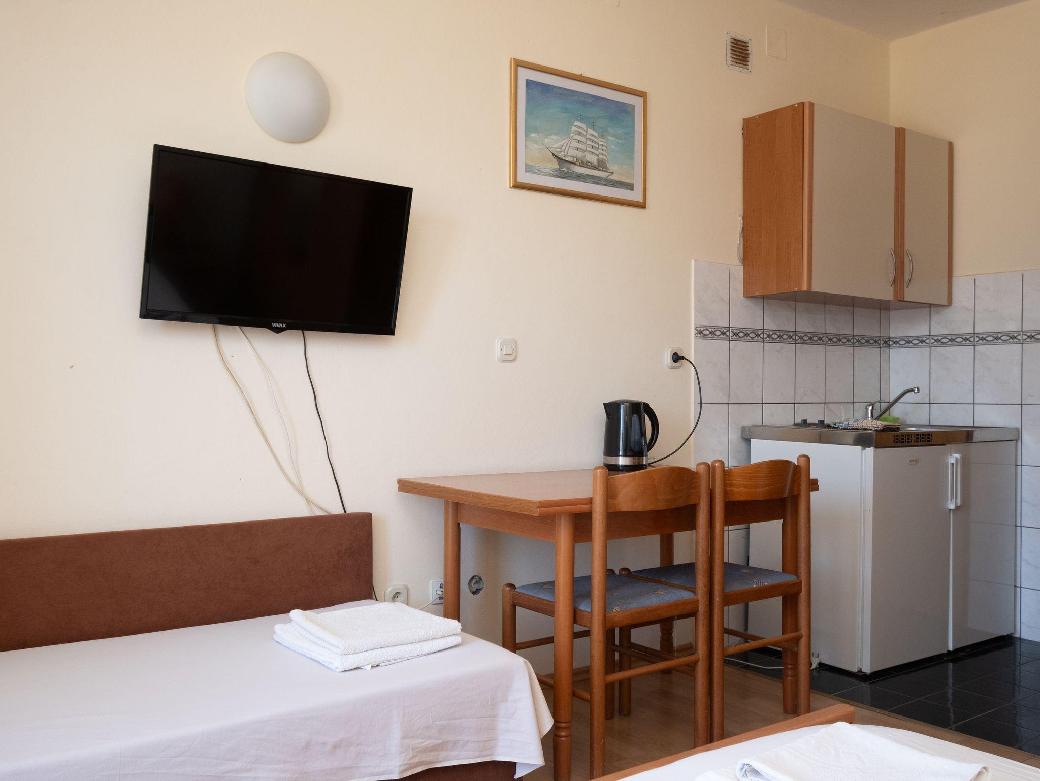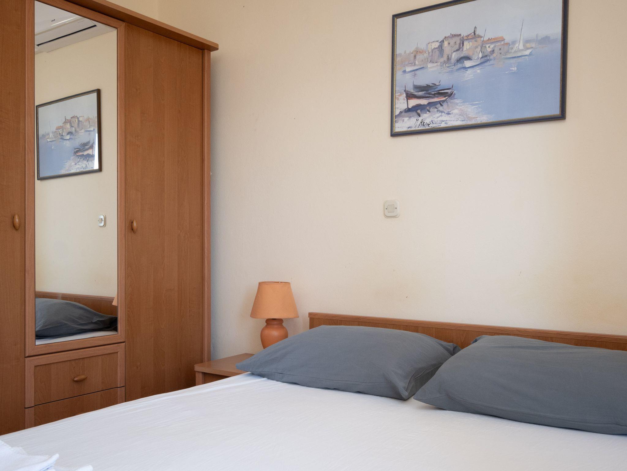 Studio bietet Platz für 2 Gäste. Die Betten sind in Schlafzimmern, die es 1 gibt, innerhalb einer Gesamtfläche von 17m2, angeordnet. Die Gäste haben einen eigenen Balkon zur Verfügung, auf der sie in warmen Sommernächten genießen können. Das Studio-Apartment bietet Meerblick. Es ist erlaubt, Speisen auf dem Gemeinschafts-Grill vorzubereiten. In der Unterkunftseinheit besteht die Möglichkeit des Mitbringens von Haustieren gegen Aufpreis. IM PREIS INBEGRIFFEN: Kurtaxe, Endreinigung, Parkplatz, Internet. VERBINDLICHE ZUSÄTZLICHE KOSTEN: Aufzahlung für Kurzaufenthalte (prozentualer Zuschlag pro Nächtigungsanzahl: 30% - 1, 20% - 2, 10% - 3). UNVERBINDLICHE ZUSÄTZLICHE KOSTEN: Klimatisierung (6,00 € pro Nacht), Haustiere (10,00 € pro Nacht), Zusatzbett (10,00 € pro Nacht). Die Verfügbarkeit zusätzlicher Dienstleistungen in Ihrem reservierten Termin und die Preise derselben (falls nicht aufgeführt) müssen im Voraus überprüft werden. Zusätzliche Dienstleistungen die in der Zahlungsaufforderung nicht aufgeführt sind werden direkt beim Vermieter bezahlt, angenommen der Gast nutzt auch diese. Ermäßigung auf den Grundpreis: Gratistag 14=13 (bei einem Aufenthalt von 14 Tagen oder mehr erhalten Sie einen Gratistag für den Aufenthalt bis 31.12.26).