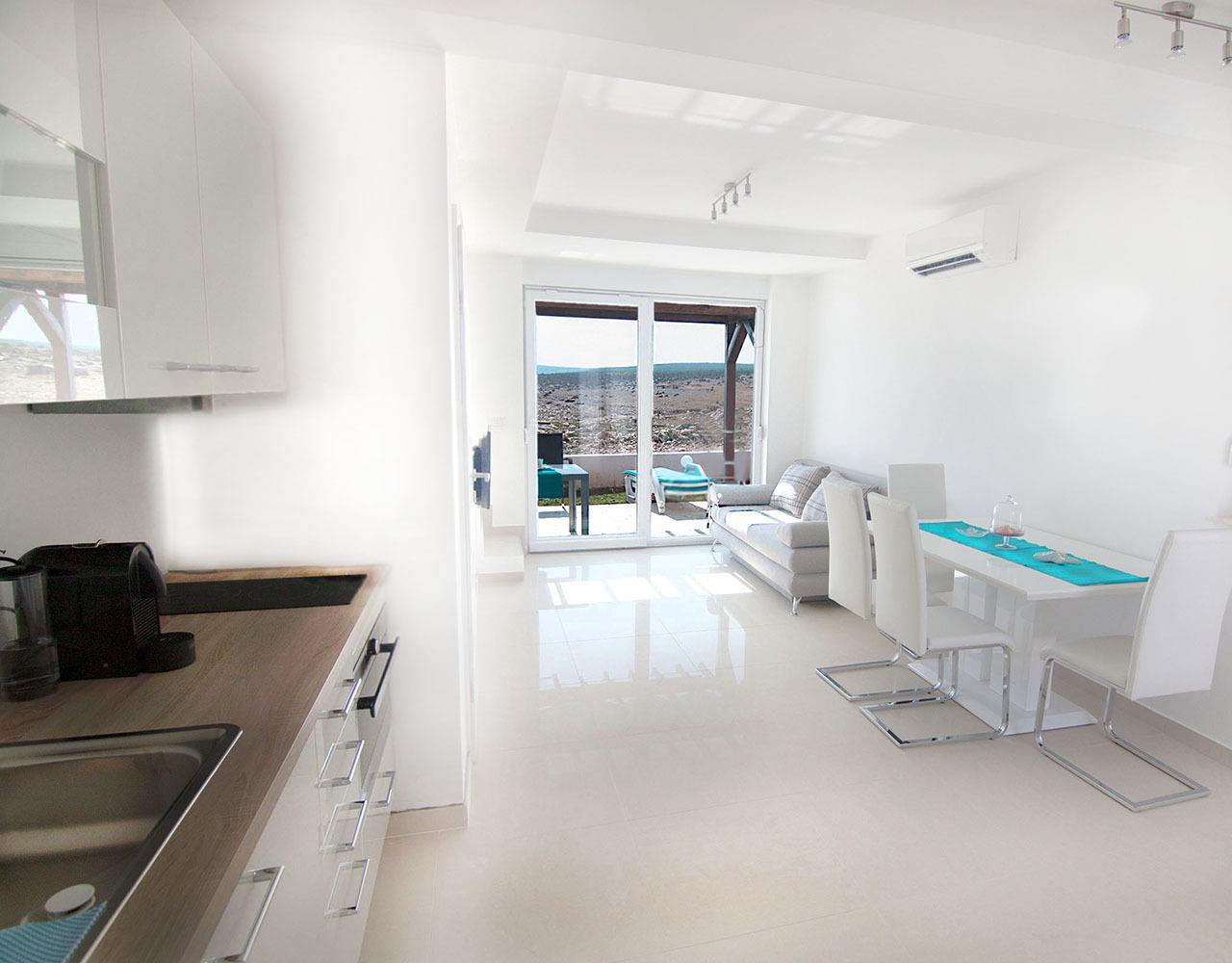 Die Terrasse im kleinen Garten erwartet dich mit wunderschönem Natursteinboden und atemberaubendem, unendlichen Blick auf das Meer und das Gebirge. Hier kannst du entweder auf den Liegen chillen oder am Tisch mit 4 Stühlen deinen Kaffee genießen oder mit der Familie essen. Auf dem Dach wird es sogar noch spektakulärer. Dein Reihenhaus hat eine volle Dachterrasse mit 2 Sonnenliegen und einen noch spektakuläreren Blick auf die endlose Weite. Ganz besonders präsentiert sich nachts der Sternenhimmel, ohne störende Lichtquellen wie wir es von zu Hause kennen. Du wirst überrascht sein, wie viel mehr Sterne zu sehen wirst. Vor deiner eigenen Haustür hast du einen kleinen regengeschützten Windfang in welchem du zum Beispiel dein Badespielzeug abstellen kannst.