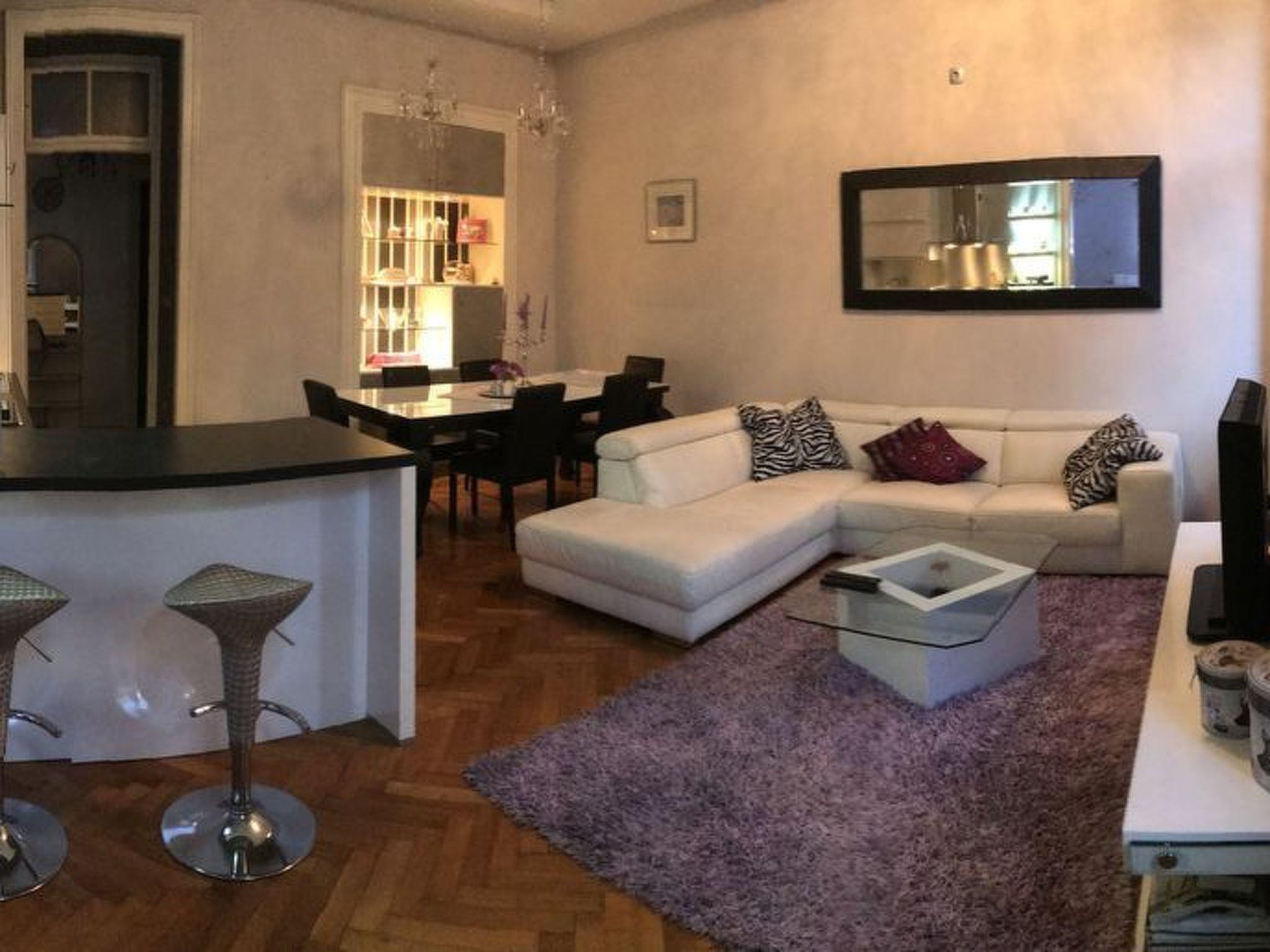 WOHNZIMMER UND KÜCHE mit Ledersofa, großem Esstisch für 6 Personen, IPTV-LCD-Flachbildschirm-TV- Voll ausgestattete Küche mit allen notwendigen Utensilien, Kühlschrank mit Gefrierfach, Elektroherd, 4-Platten-Herd, Wasserkocher für Tee und Kaffee, Dunstabzugshaube, elektrischer Geschirrspüler, Mikrowelle... KOSTENLOSER WI-FI-Anschluss. Öffentliche Parkplätze unter der Wohnung. Die Wohnung befindet sich im zweiten Stock (kein Aufzug) eines schönen alten Sezessionsgebäudes, das zu den geschützten historischen Bauwerken der Stadt gehört.