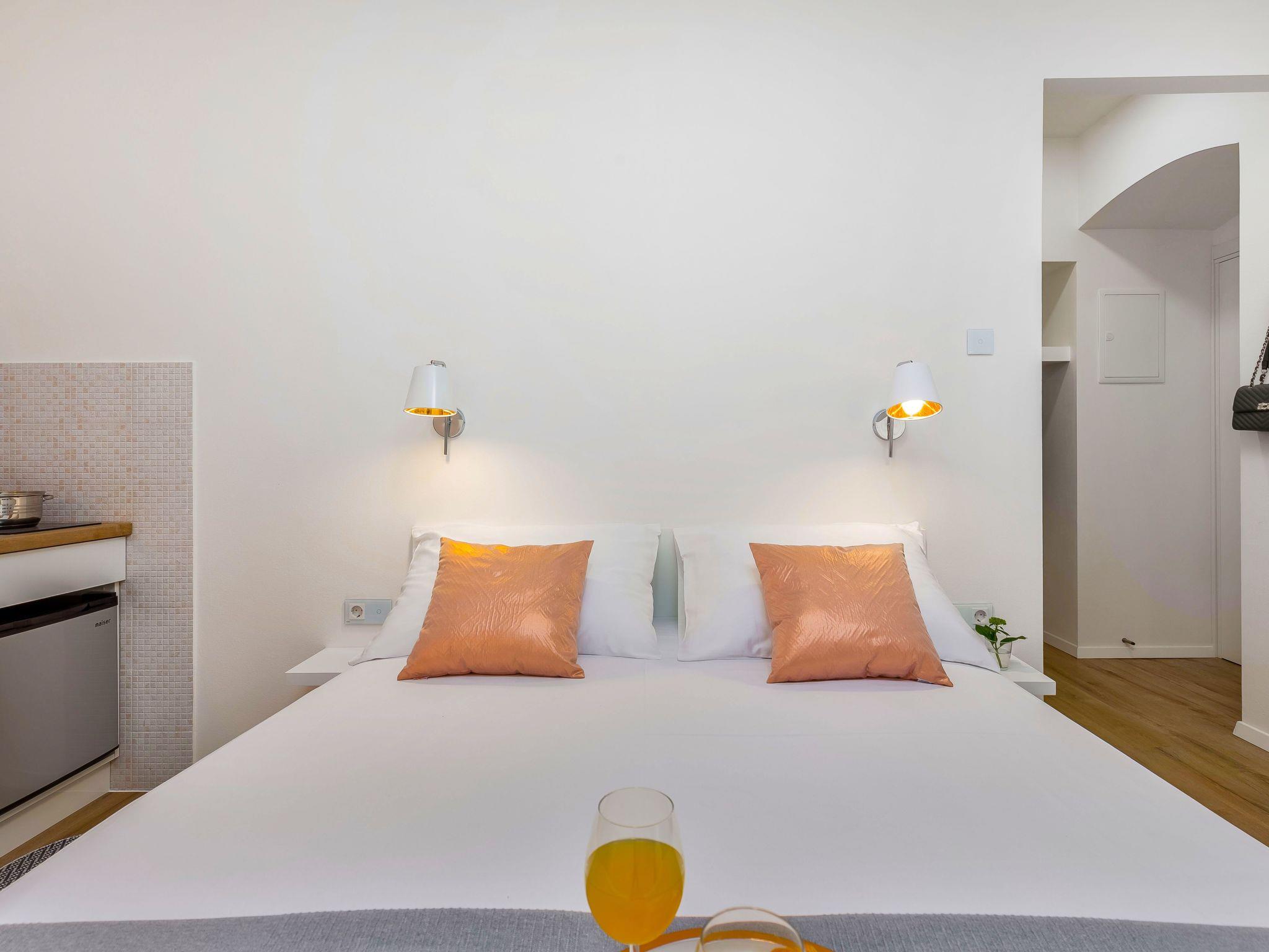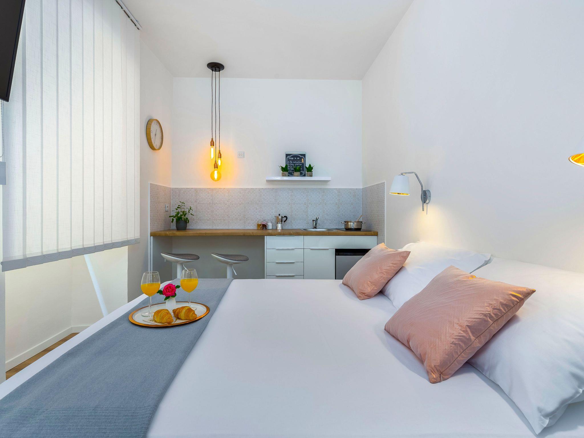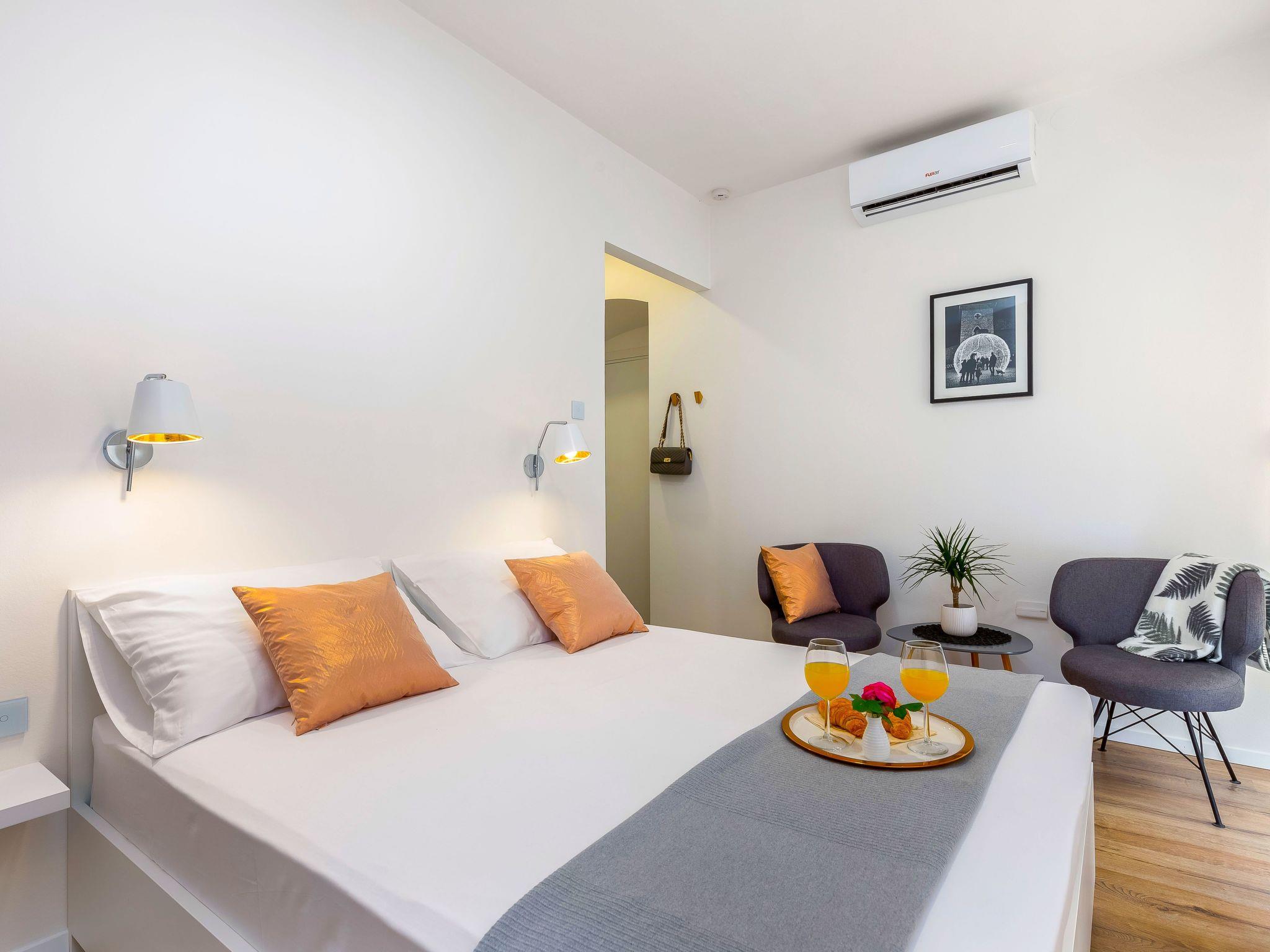 Betreten Sie dieses 22 m2 große Studio-Apartment, in dem minimalistische Tradition auf moderne Eleganz trifft und einen stilvollen und komfortablen Lebensraum schafft. Das Apartment verfügt über ein Kingsize-Bett, eine Küchenzeile mit Geschirr, eine gemütliche Essecke für zwei Personen, einen geräumigen Kleiderschrank, einladende Sessel mit einem Teetisch und ein schickes Bad. Die durchdachte Raumaufteilung verbindet die Küchenzeile mit dem Essbereich und dem Schlafzimmer und sorgt so für Komfort und Bequemlichkeit. Die komplette technische Ausstattung mit neuen Geräten und Möbeln, intelligentem Zugang per PIN für schnelles Ein- und Auschecken, Klimaanlage, kostenlosem WLAN und unbegrenztem Internetzugang, einer Smart-TV-Box mit Netflix, Touch-Switches, einer begehbaren digitalen Dusche und einem Handtuchwärmer verleiht Ihrem Aufenthalt einen besonderen Wert.