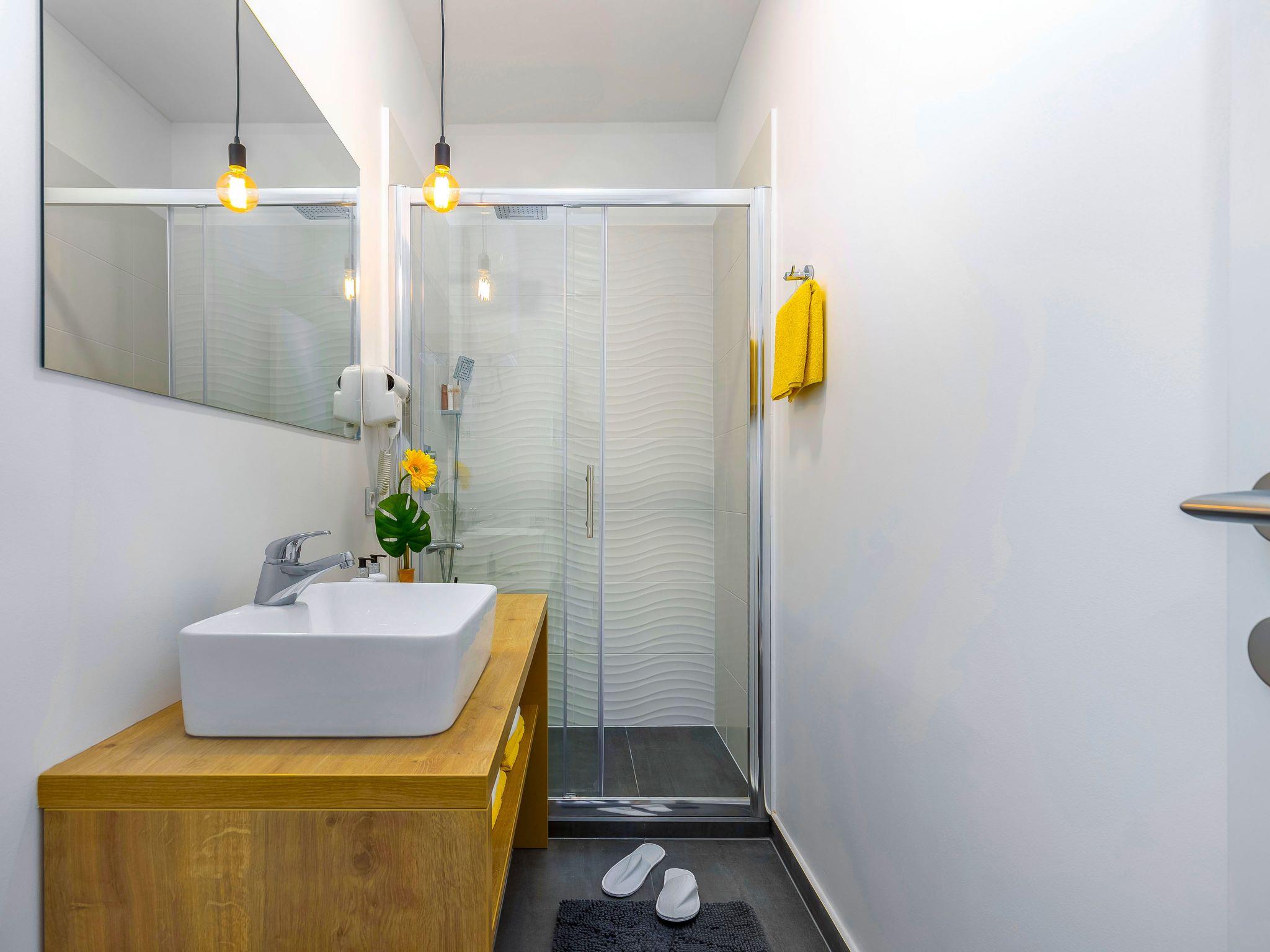 Im Inneren ist das Apartment TERRA I 33 m2 groß und befindet sich im 2. Stock eines Wohngebäudes. Es ist modern und attraktiv eingerichtet und bietet Komfort und Stil. Die Gäste werden das Kingsize-Bett, das zusätzliche Schlafsofa, den Kleiderschrank, den Sessel und den Schreibtisch mit Stuhl zu schätzen wissen. Eine voll ausgestattete Küchenzeile mit Geschirr, eine Essecke für vier Personen und ein stilvolles Bad sorgen für einen angenehmen und entspannten Aufenthalt. Technische Annehmlichkeiten wie ein intelligenter PIN-Zugang, eine Klimaanlage, kostenloses WLAN mit unbegrenztem Internetzugang, eine Smart-TV-Box mit Netflix, Touch-Switches, eine begehbare Digitaldusche, ein Handtuchwärmer, ein Luftbefeuchter und vieles mehr sorgen für einen angenehmen Aufenthalt. Geschäftsreisende werden die kabellose Maus und Tastatur zu schätzen wissen, während jüngere Besucher sich über ein Gamepad mit vorinstallierten Spielen freuen können, das Unterhaltung für alle garantiert.
