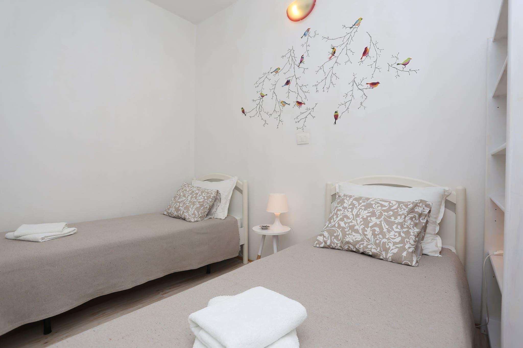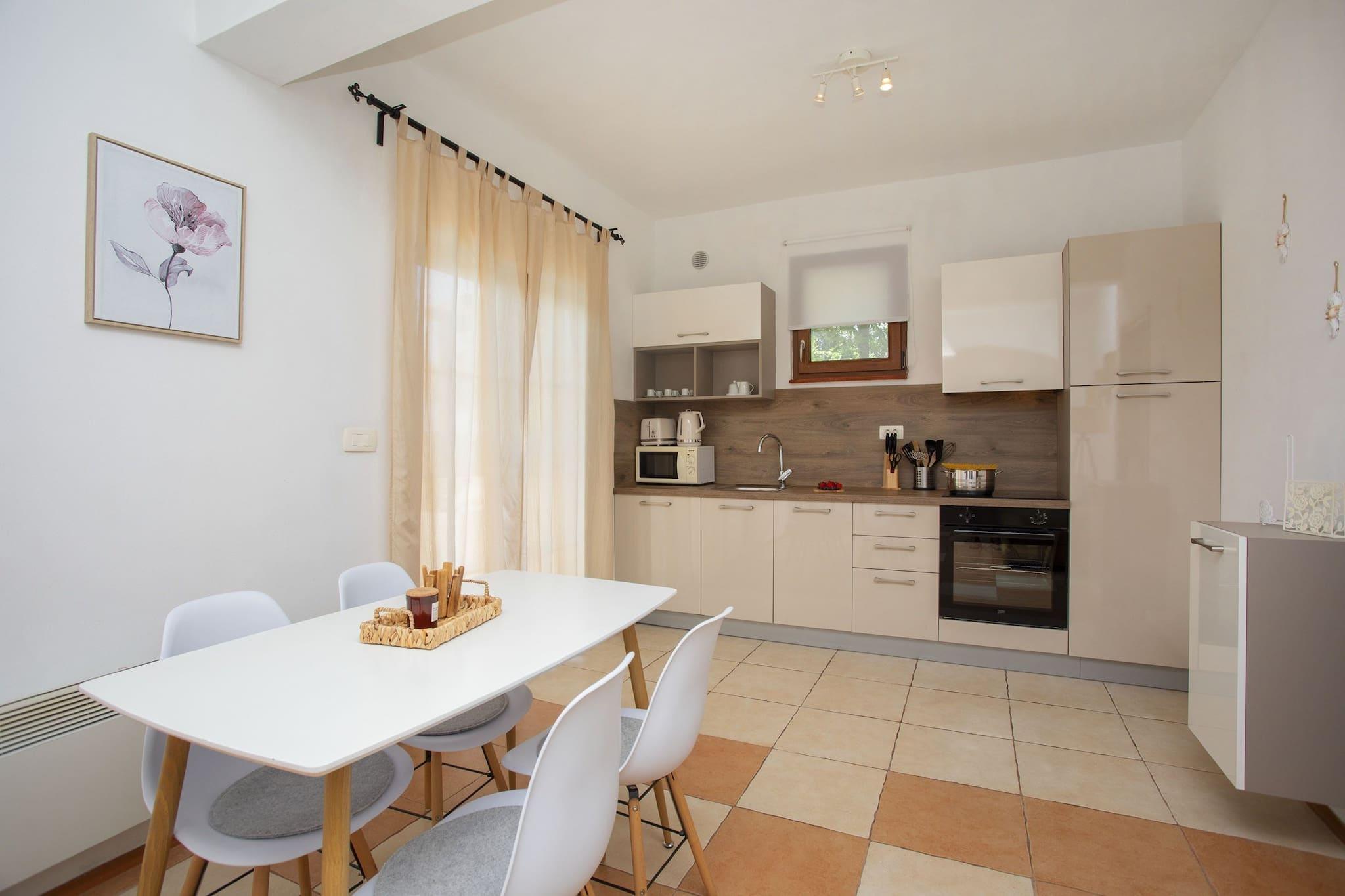 Dieses einladende Ferienhaus verfügt über zwei komfortable Schlafzimmer: eines mit einem Queensize-Bett und das andere mit zwei Einzelbetten. So finden Familien oder kleine Gruppen ausreichend Platz. Bis zu vier Personen finden hier Platz. Zusätzliche Annehmlichkeiten wie ein Babybett und ein Hochstuhl sind auf Anfrage erhältlich. Der private Pool lädt an wärmeren Tagen zum Abkühlen ein. Haustiere sind gegen Aufpreis erlaubt. Die voll ausgestattete Küche mit Cerankochfeld, Kühlschrank, Mikrowelle, Backofen und Geschirrspüler erleichtert die Zubereitung von Mahlzeiten. Entspannen Sie auf der Terrasse, genießen Sie Ihre Grillgerichte oder entspannen Sie im ruhigen Garten. WLAN, Klimaanlage und ein Parkplatz stehen Ihnen kostenlos zur Verfügung. Das Ferienhaus befindet sich in Ripenda Verbanci, einer ruhigen Gegend abseits des Stadtlärms und bietet einen idealen Rückzugsort. In der Nähe können Sie die charmanten Städte Labin und Rabac erkunden. Die Altstadt von Labin ist reich an Geschichte und bietet Museen und Galerien, die das lokale Kulturerbe präsentieren, darunter auch für die Region einzigartige Modelle alter Bergwerke. Rabac, nur 5 km entfernt, beherbergt mit der Blauen Flagge ausgezeichnete Strände wie Maslinica, Sv. Andrea und Lanterna und bietet sauberes Meer und vielfältige Aktivitäten. Das Haus verfügt über eine geräumige offene Küche mit modernen Geräten wie Kühlschrank, Mikrowelle, Backofen und Kaffeemaschine. Das Badezimmer ist mit Dusche und Haartrockner ausgestattet und bietet zusätzlichen Komfort. Satellitenfernsehen sorgt für Unterhaltung, und ein gemütlicher Kamin verleiht dem Wohnbereich eine besondere Atmosphäre.