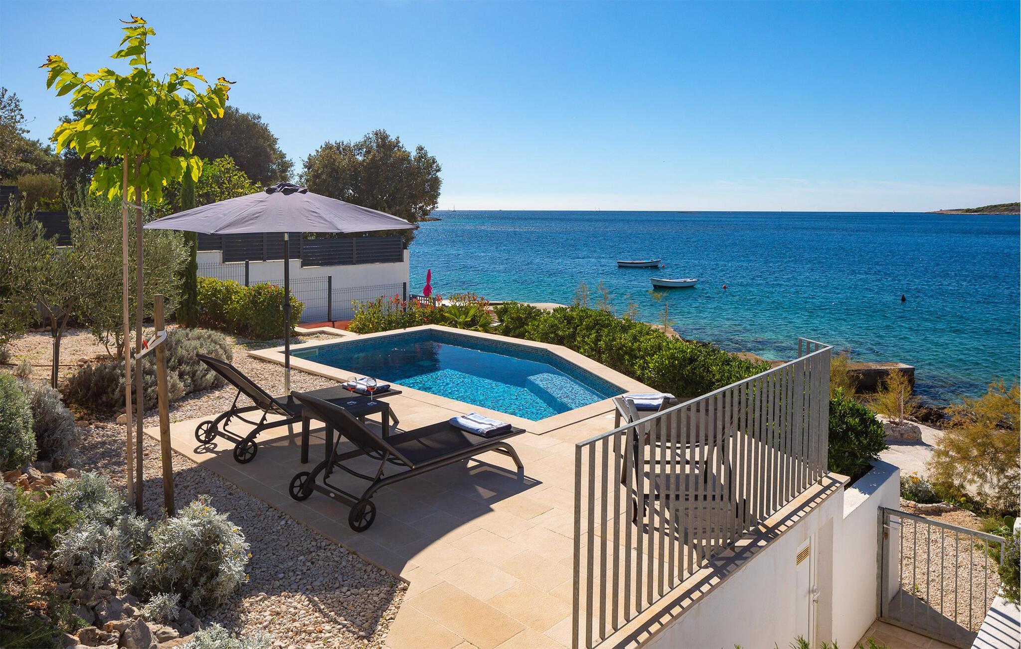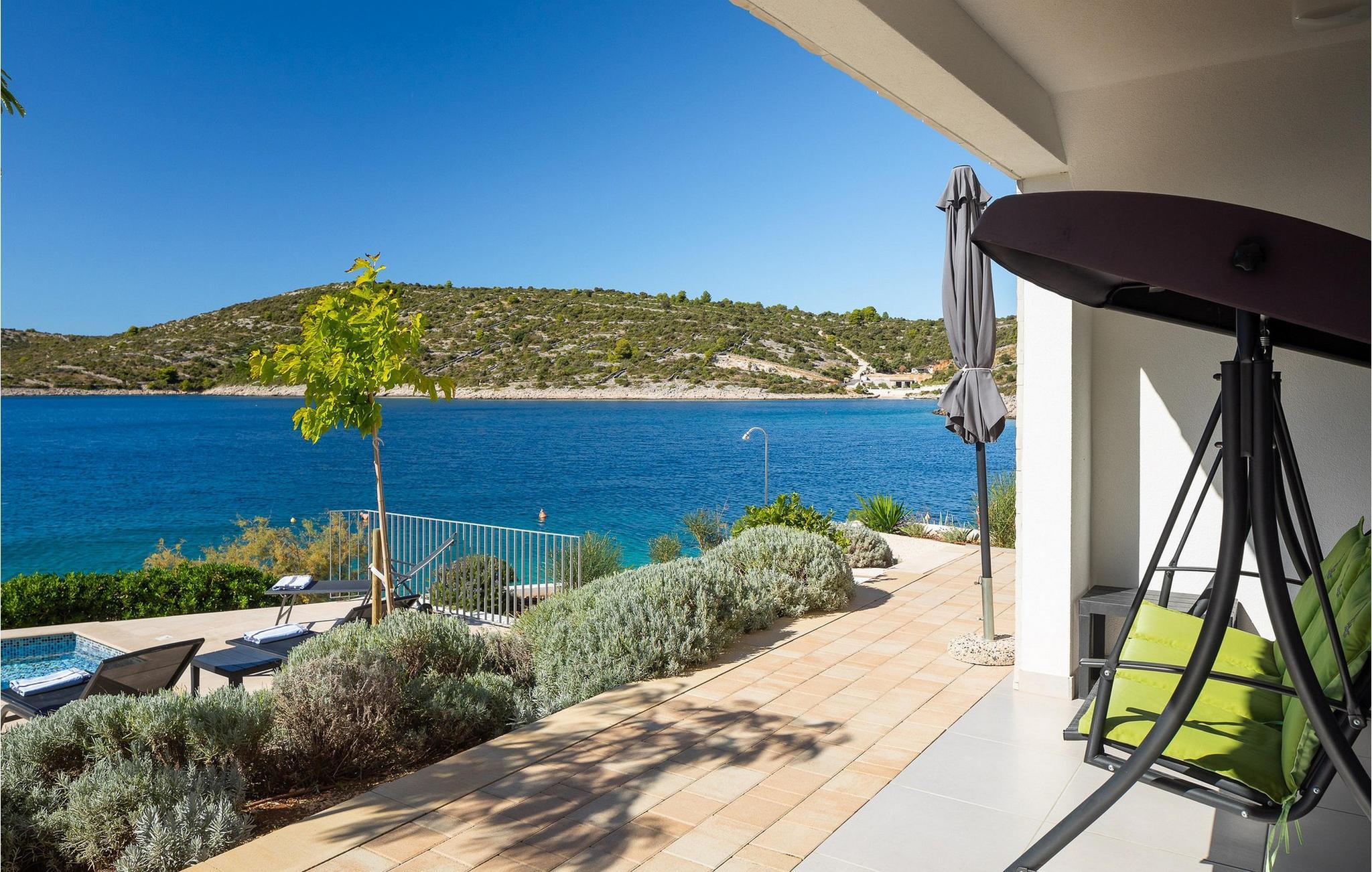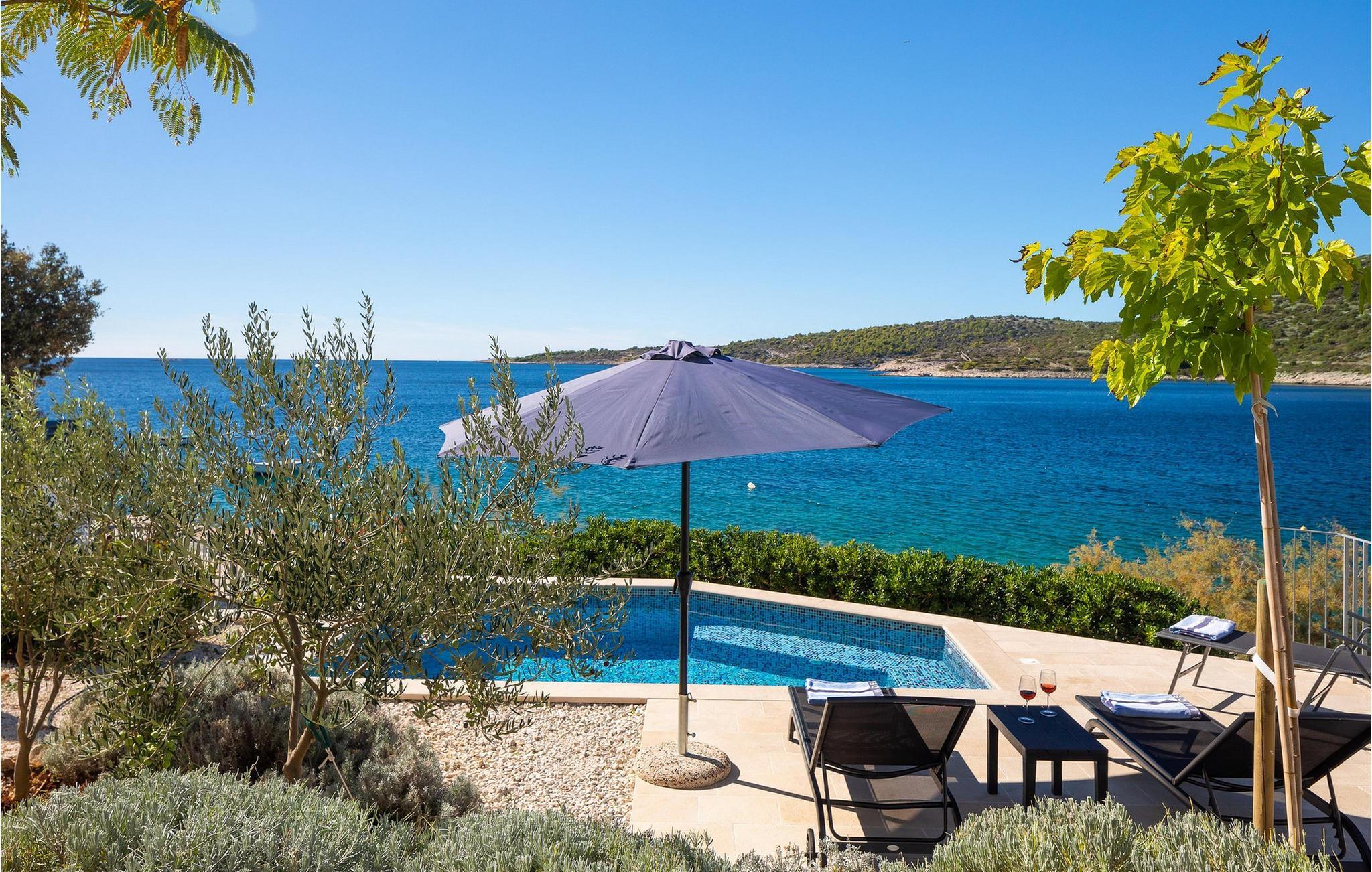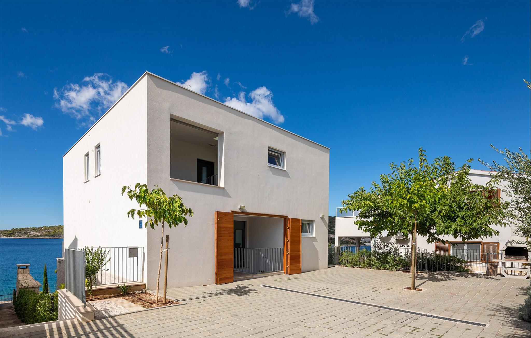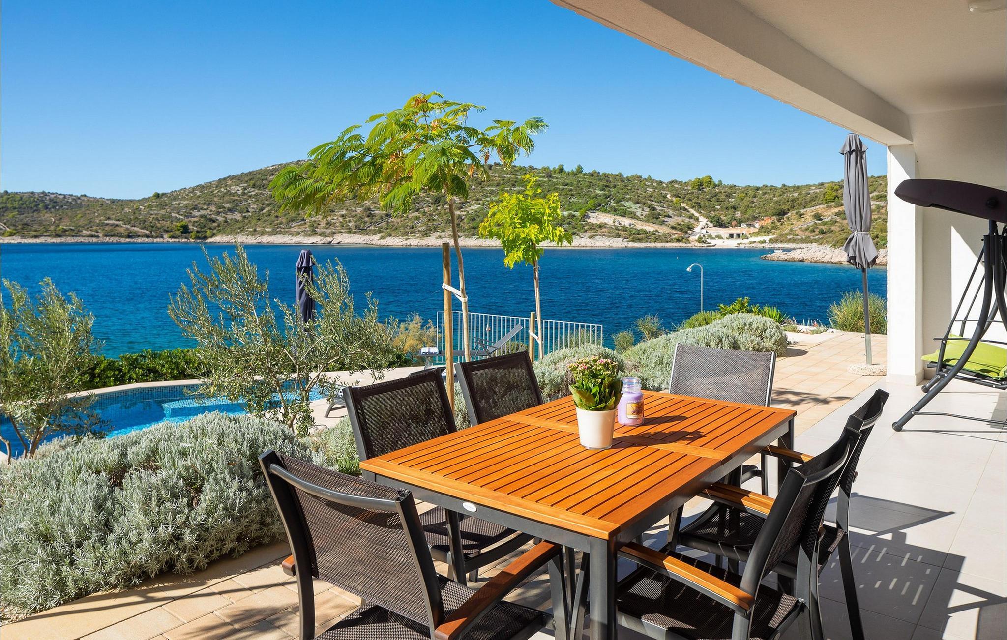 Die moderne Villa Karolina in Kanica, einem idyllischen Fischer- und Touristendorf, lädt Sie mit stilvoller Eleganz und klarem Design zu einem unvergesslichen Aufenthalt ein. Lichtdurchflutete Räume, hochwertig eingerichtete Wohnbereiche und mehrere Terrassen bieten Ihnen eine komfortable Wohlfühlatmosphäre. Ob gemeinsame Mahlzeiten in der voll ausgestatteten Küche oder entspannte Stunden auf den Sonnenliegen am Pool – hier erleben Sie pure Erholung. Erleben Sie den traumhaften Panoramablick auf das glitzernde Meer direkt von Ihrer großzügigen Terrasse aus oder gehen die Stufen hinab zur Badeplattform, wo Sie auch ein kleineres Boot anlegen können.
