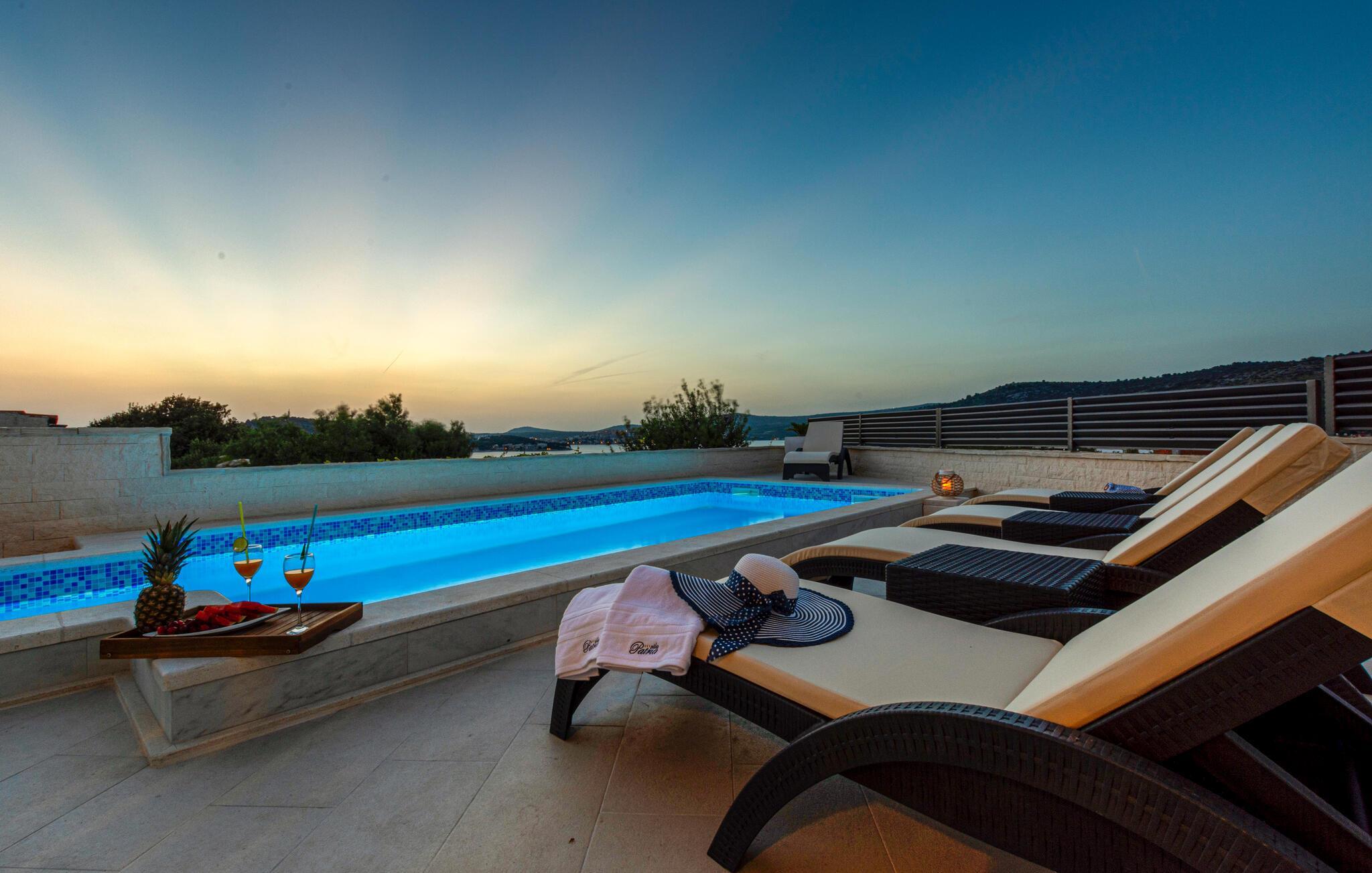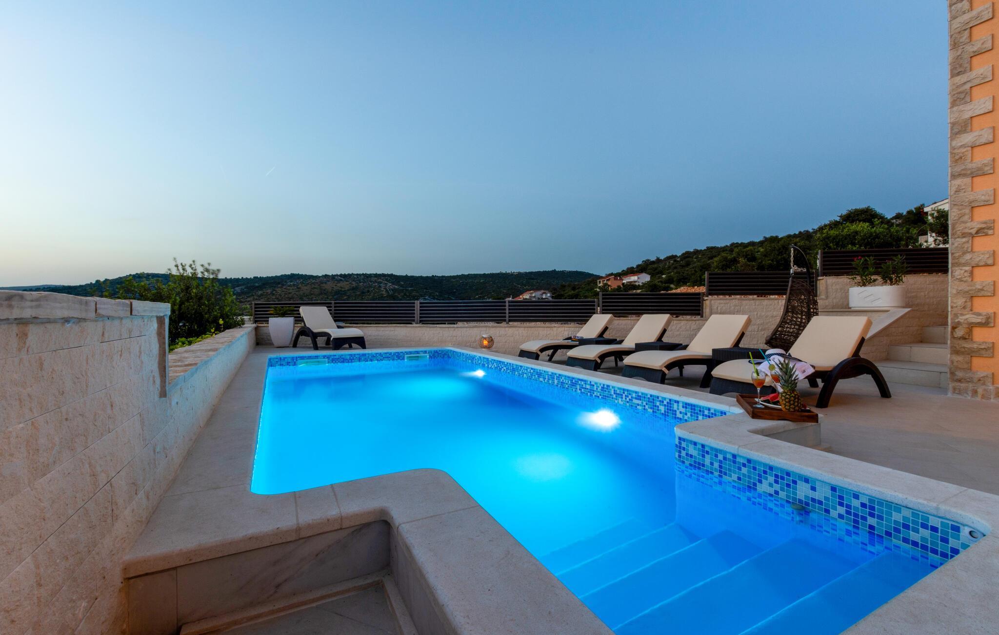 Genießen Sie von diesem einladenden Ferienhaus mit Pool einen hervorragenden Ausblick auf die Bucht.