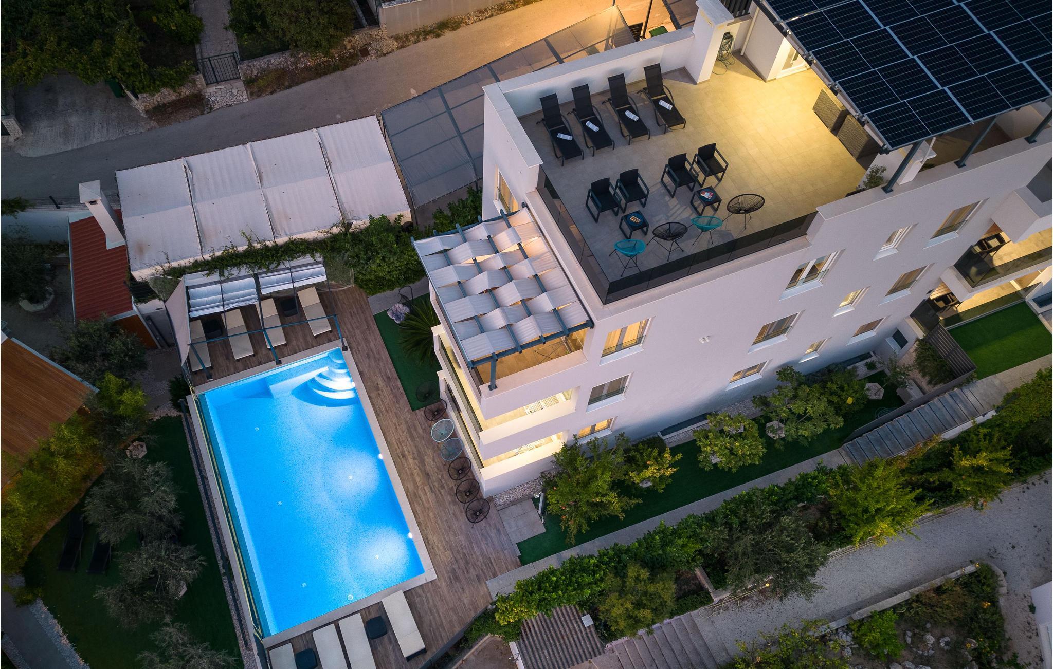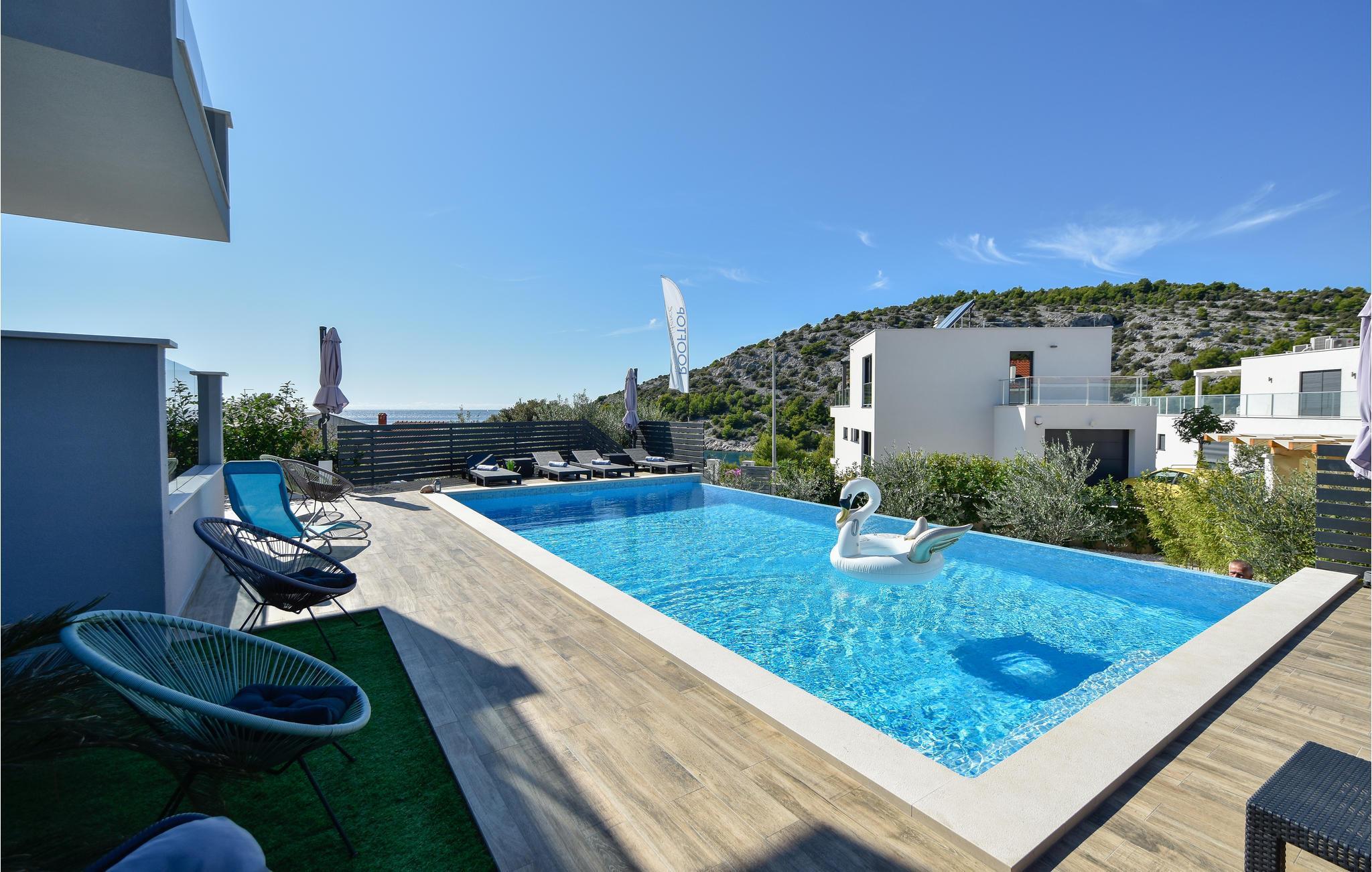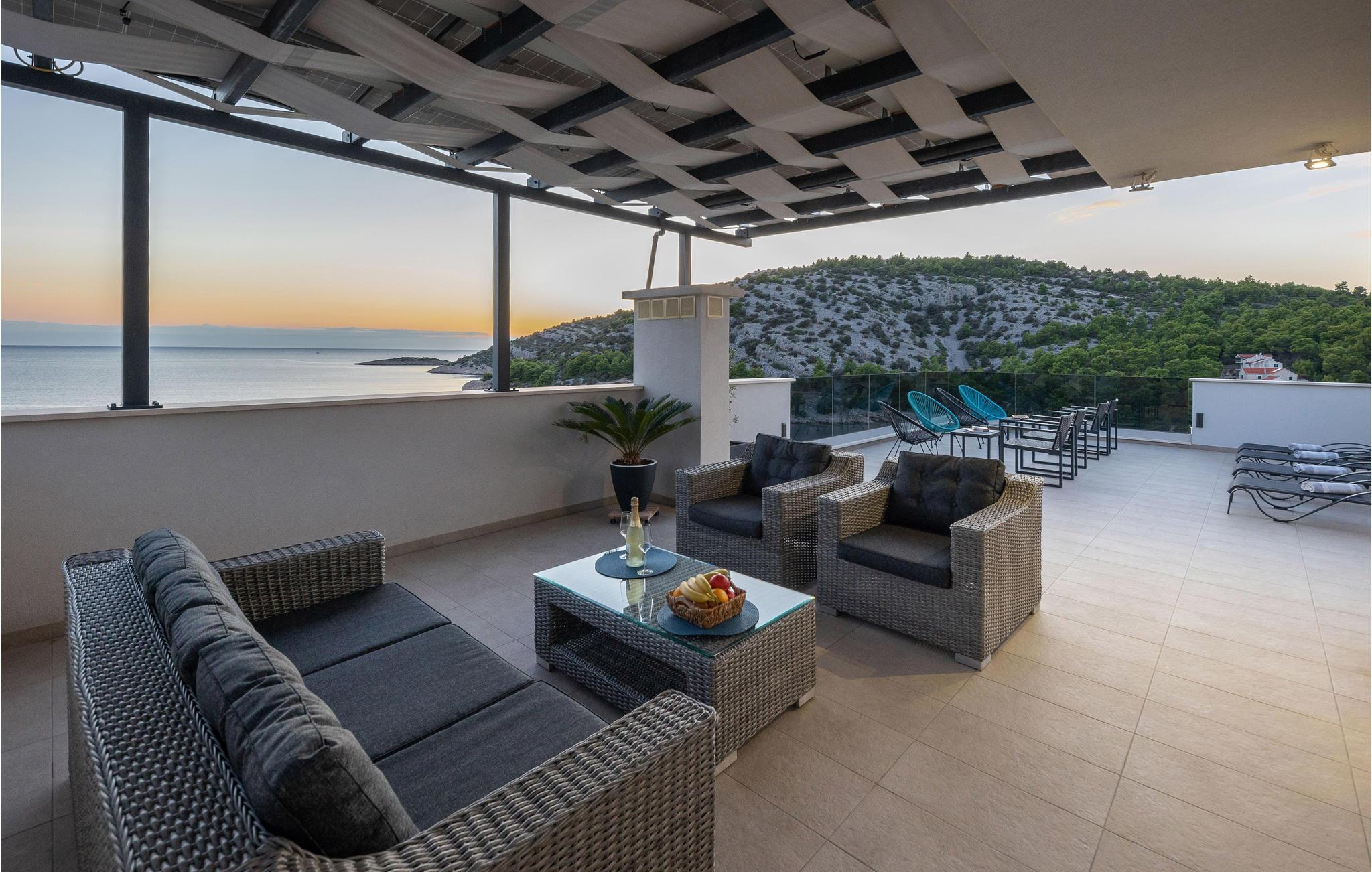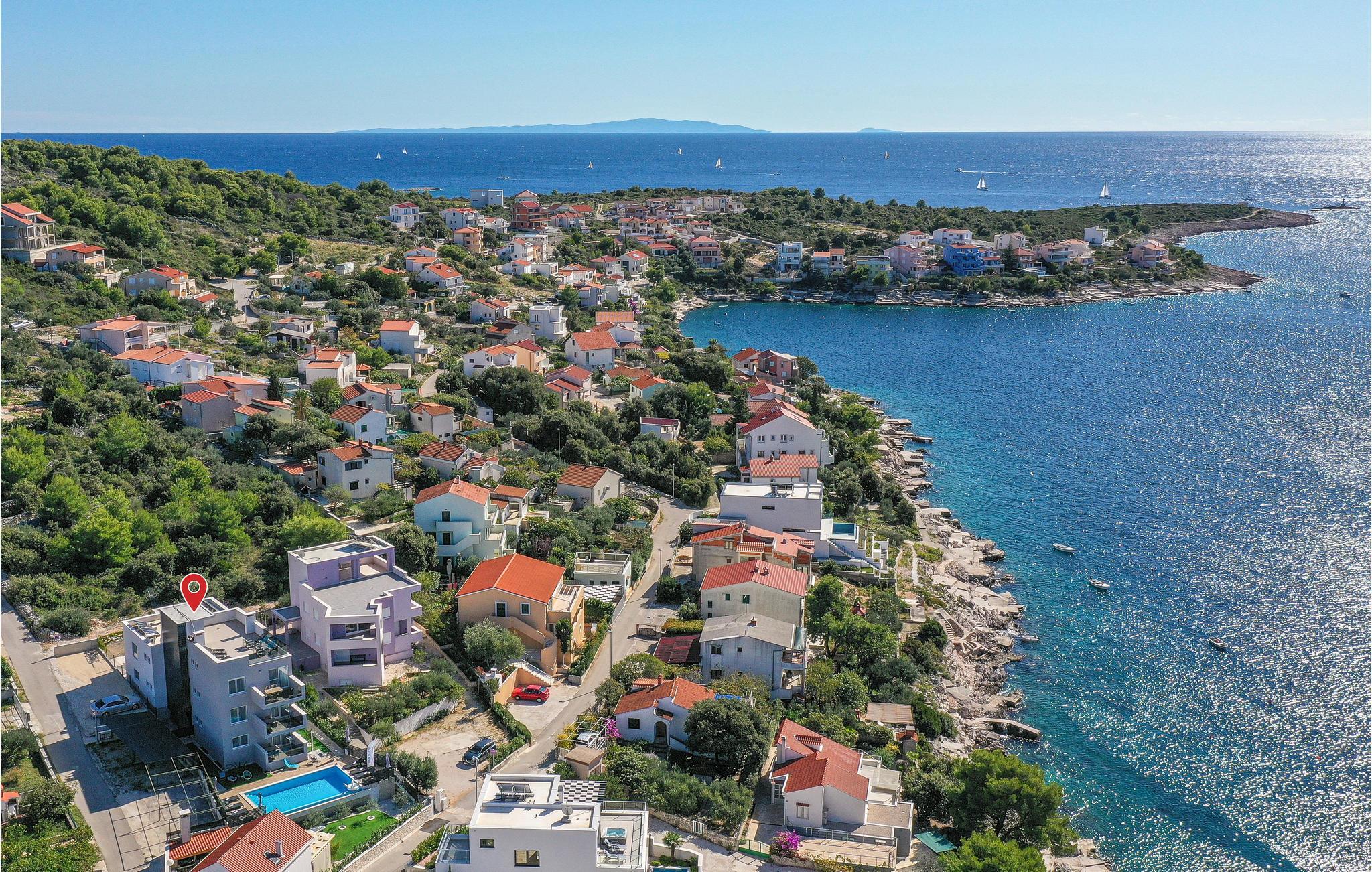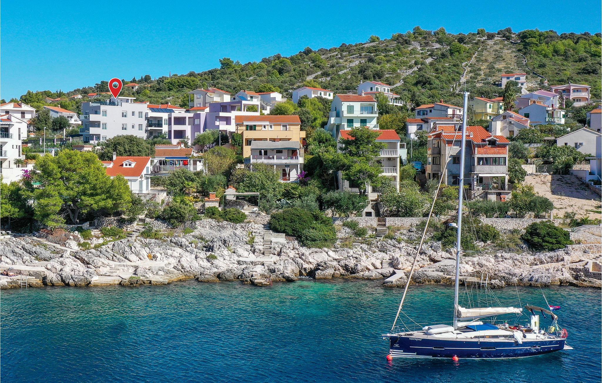 Nur ca. 60 m vom Meer entfernt befindet sich dieses luxuriöse Haus mit Pool. Das Haus verfügt über 5 Ferienwohnungen mit Meerblick. Jede Wohneinheit besteht aus 2 geräumigen Zimmern mit eigenem Bad und zusätzlicher Toilette, Küche, Esszimmer, Wohnzimmer und großem Balkon mit Meerblick. Im Souterrain befinden sich die Sauna und der Fitnessbereich sowie das Badezimmer und ein großes Esszimmer mit Küche. Das Haus liegt in einer ruhigen Bucht und wurde für den Familientourismus umgebaut. Nur 15 Autominuten entfernt befinden sich die unter dem Schutz der UNESCO stehenden Städte Trogir und Primosten. Wir empfehlen außerdem, die nahe gelegenen Nationalparks Krk und Kornati zu besuchen.