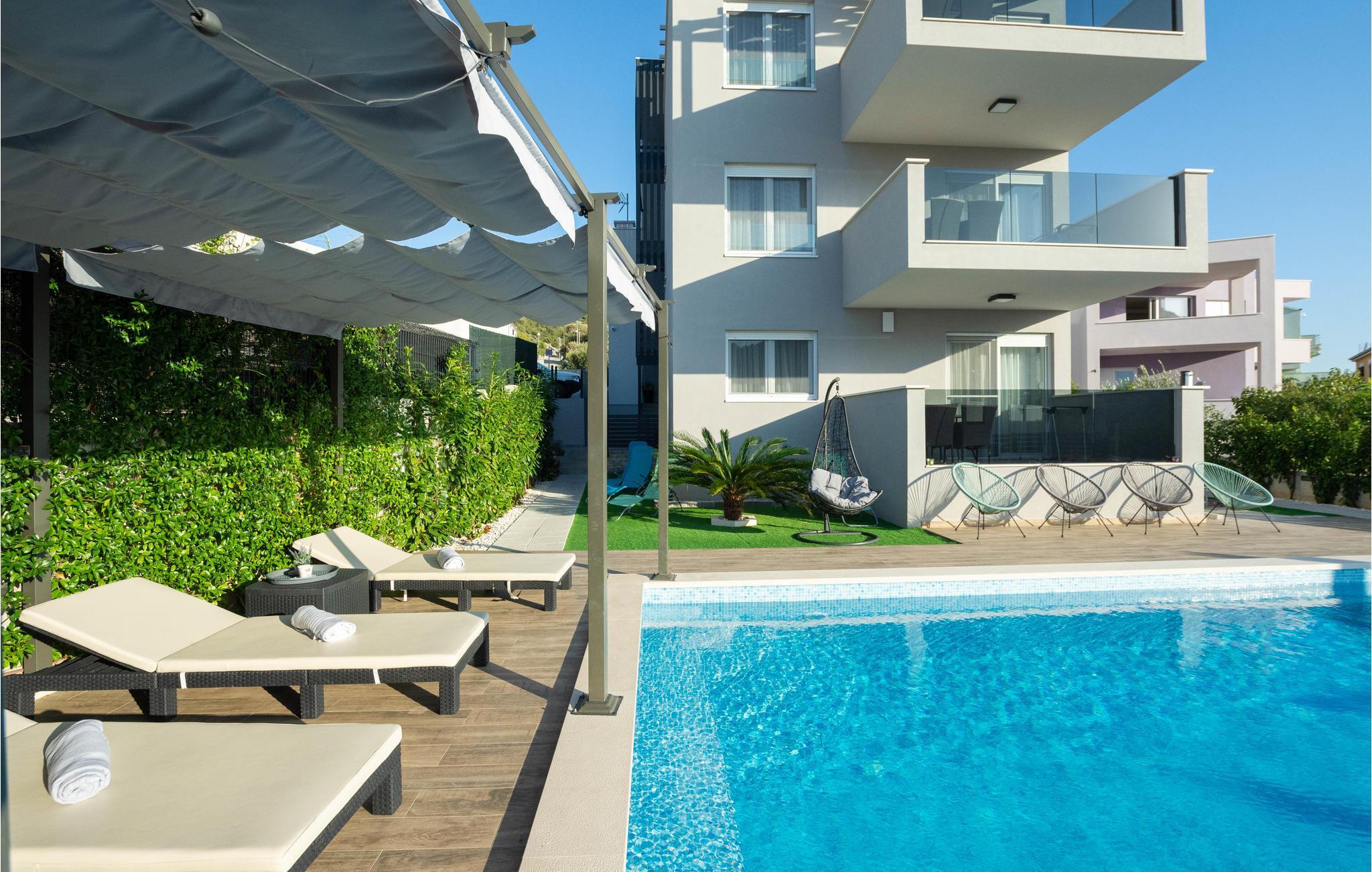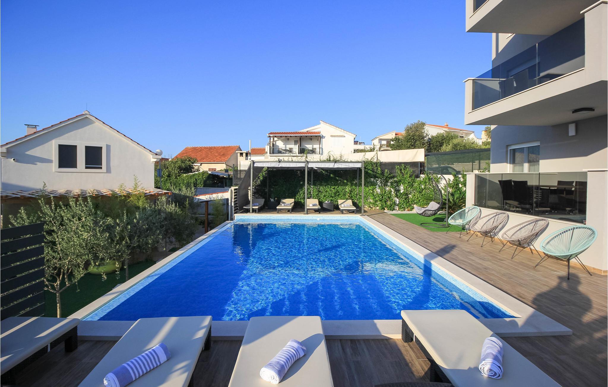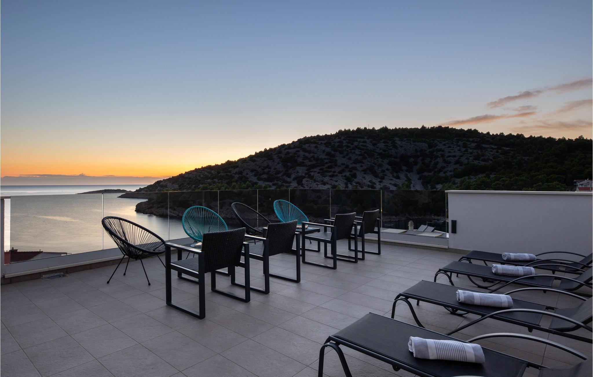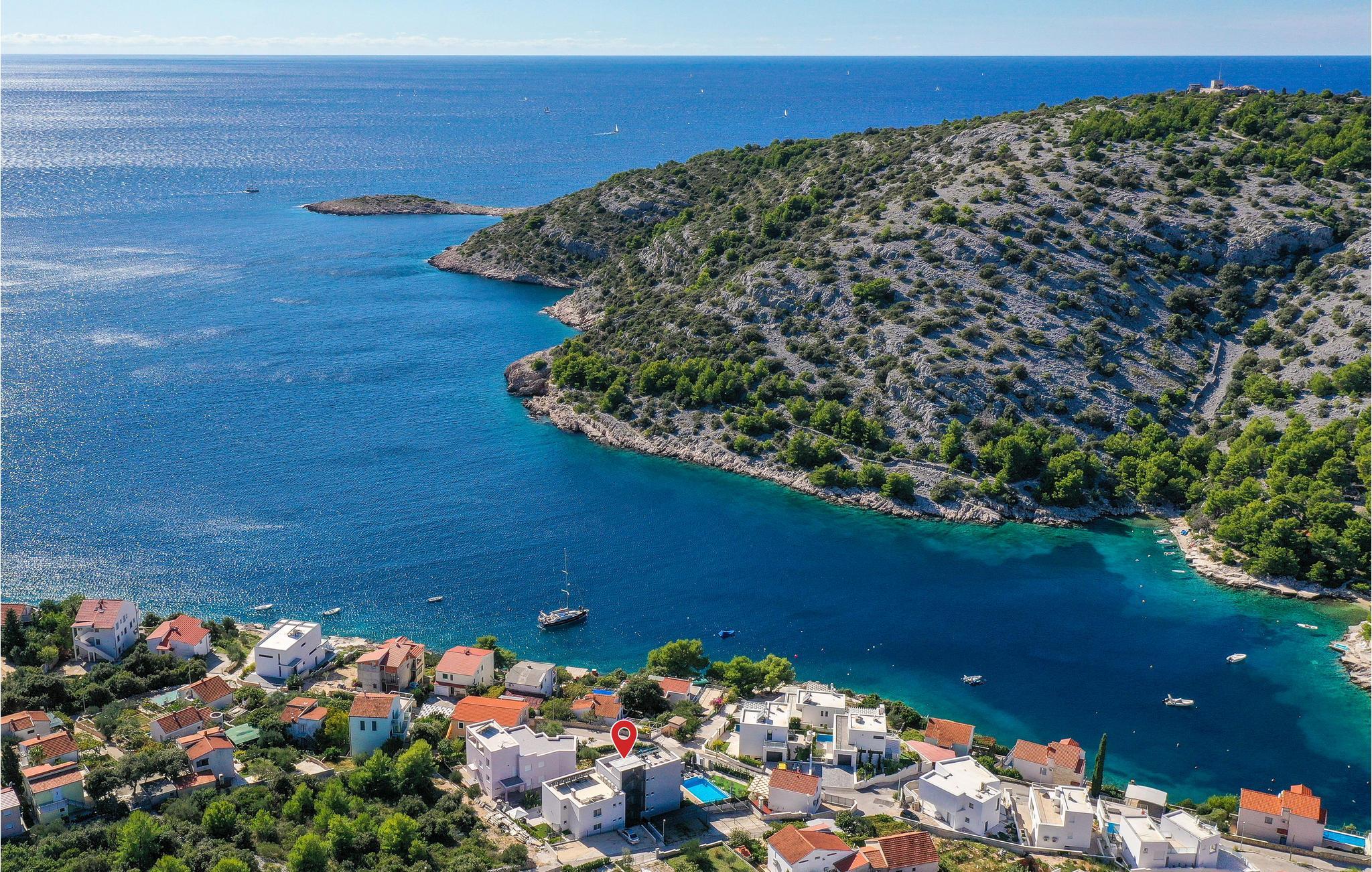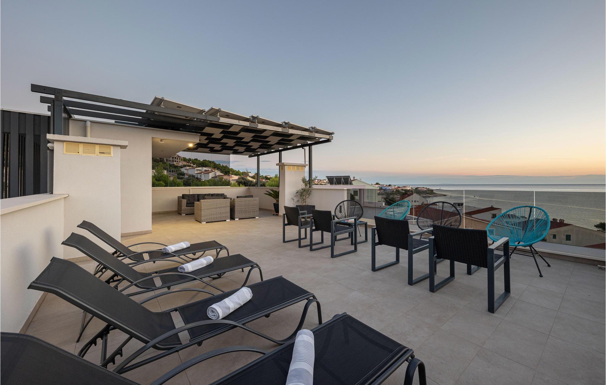 Nur ca. 60 m vom Meer entfernt befindet sich dieses luxuriöse Haus mit Pool. Das Haus verfügt über 5 Ferienwohnungen mit Meerblick. Jede Wohneinheit besteht aus 2 geräumigen Zimmern mit eigenem Bad und zusätzlicher Toilette, Küche, Esszimmer, Wohnzimmer und großem Balkon mit Meerblick. Im Souterrain befinden sich die Sauna und der Fitnessbereich sowie das Badezimmer und ein großes Esszimmer mit Küche. Das Haus liegt in einer ruhigen Bucht und wurde für den Familientourismus umgebaut. Nur 15 Autominuten entfernt befinden sich die unter dem Schutz der UNESCO stehenden Städte Trogir und Primosten. Wir empfehlen außerdem, die nahe gelegenen Nationalparks Krk und Kornati zu besuchen.
