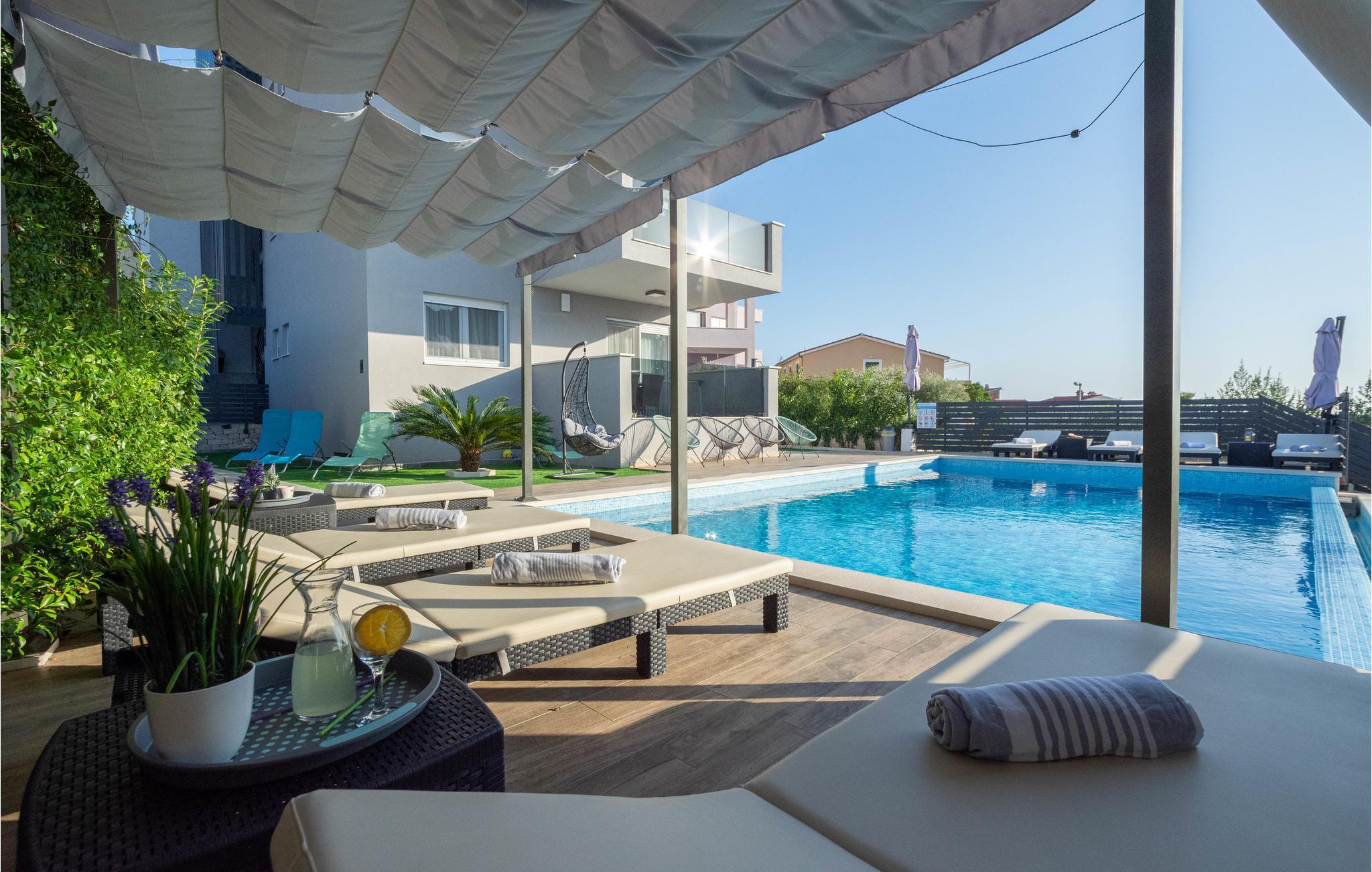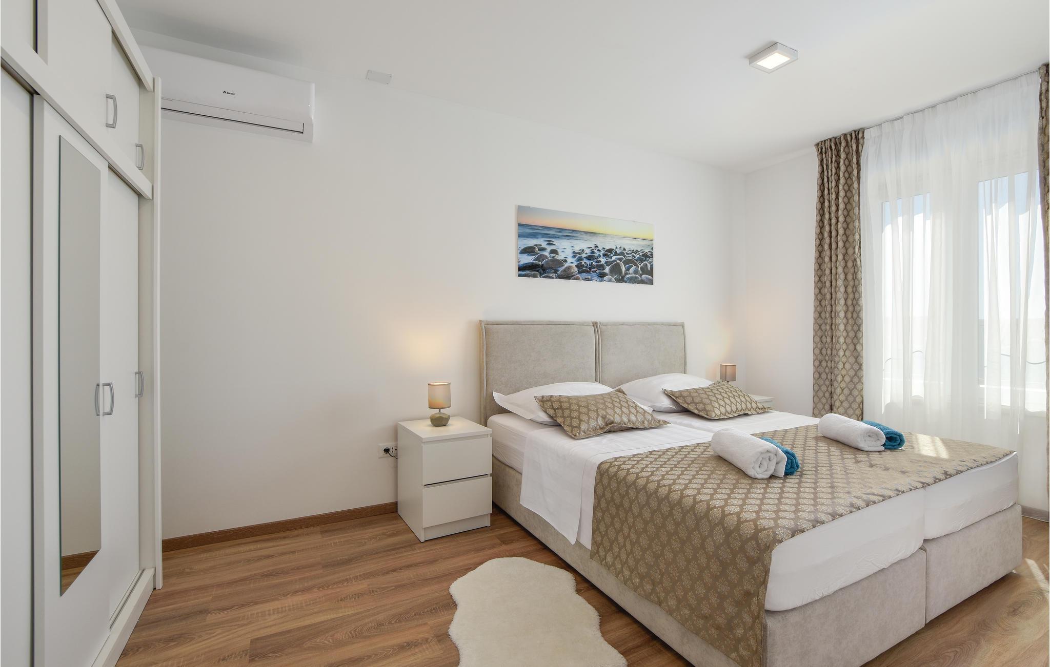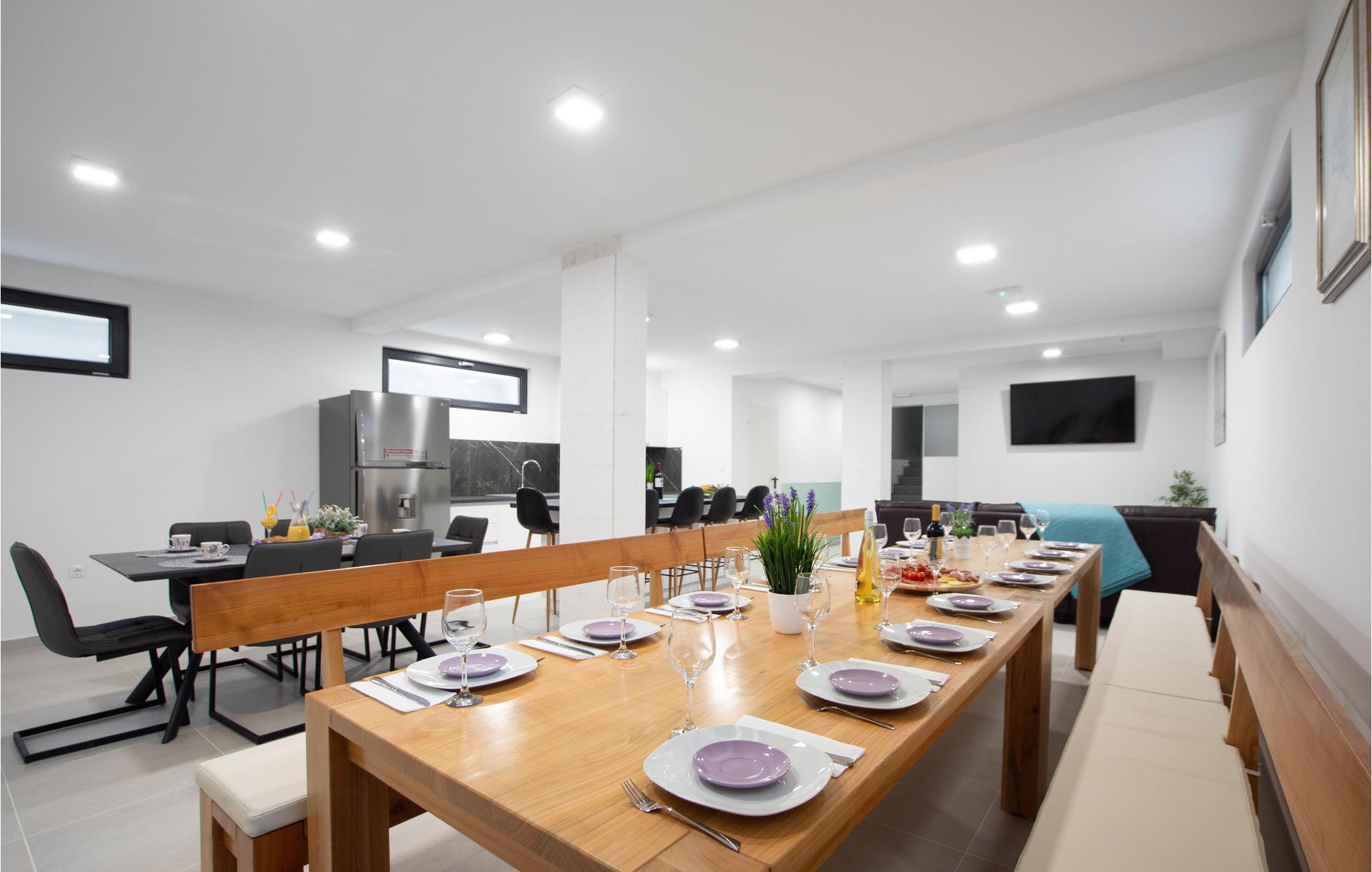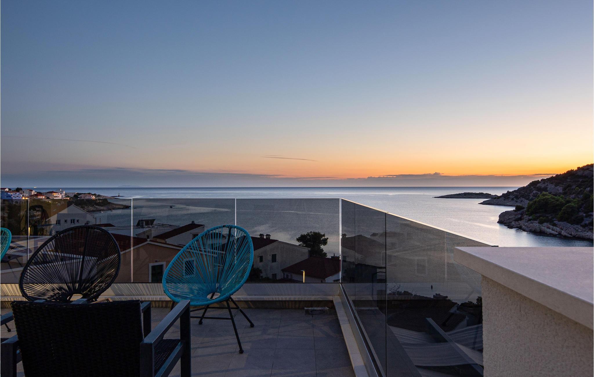 Nur ca. 60 m vom Meer entfernt befindet sich dieses luxuriöse Haus mit Pool. Das Haus verfügt über 5 Ferienwohnungen mit Meerblick. Jede Wohneinheit besteht aus 2 geräumigen Zimmern mit eigenem Bad und zusätzlicher Toilette, Küche, Esszimmer, Wohnzimmer und großem Balkon mit Meerblick. Im Souterrain befinden sich die Sauna und der Fitnessbereich sowie das Badezimmer und ein großes Esszimmer mit Küche. Das Haus liegt in einer ruhigen Bucht und wurde für den Familientourismus umgebaut. Nur 15 Autominuten entfernt befinden sich die unter dem Schutz der UNESCO stehenden Städte Trogir und Primosten. Wir empfehlen außerdem, die nahe gelegenen Nationalparks Krk und Kornati zu besuchen.