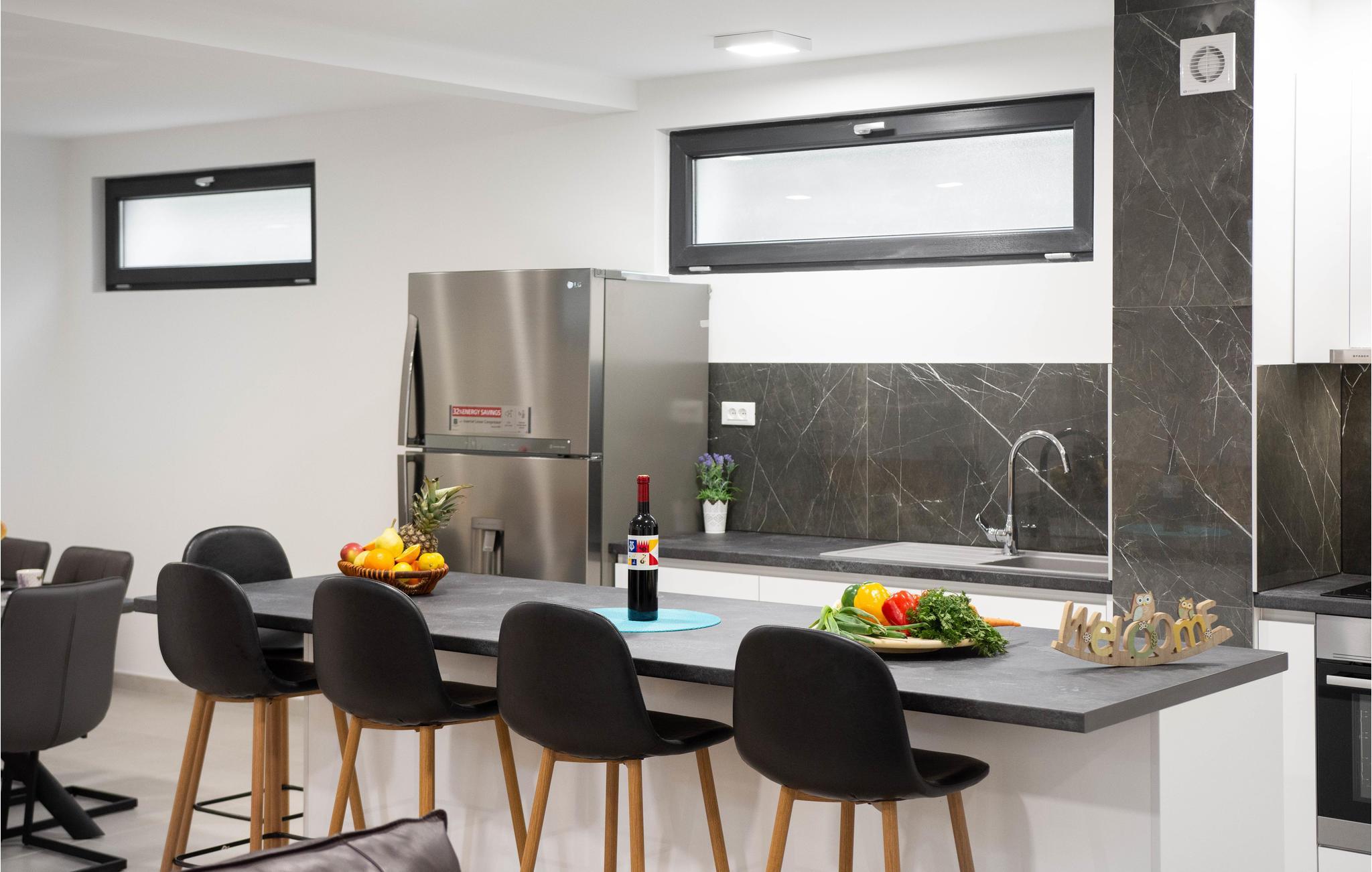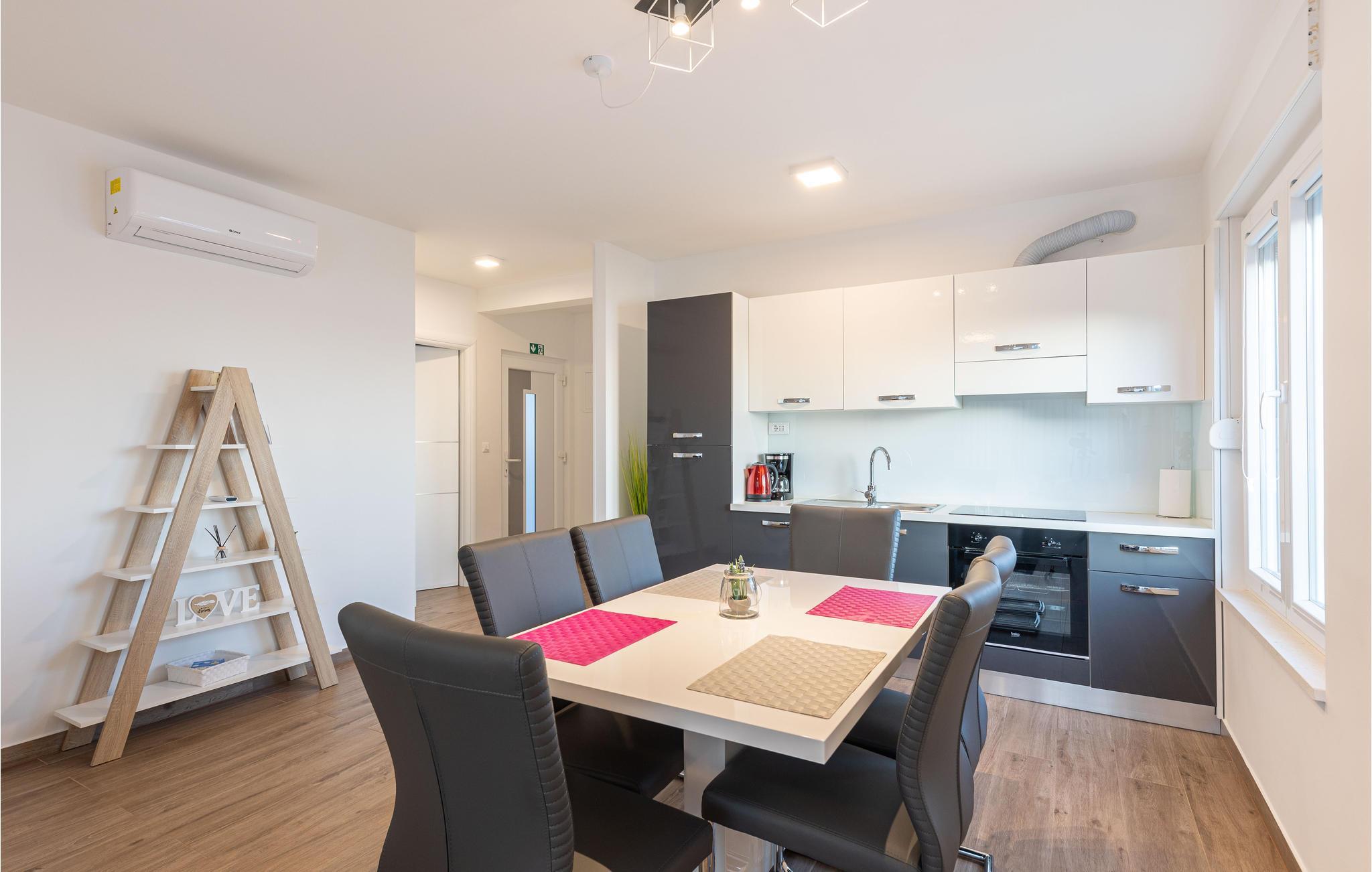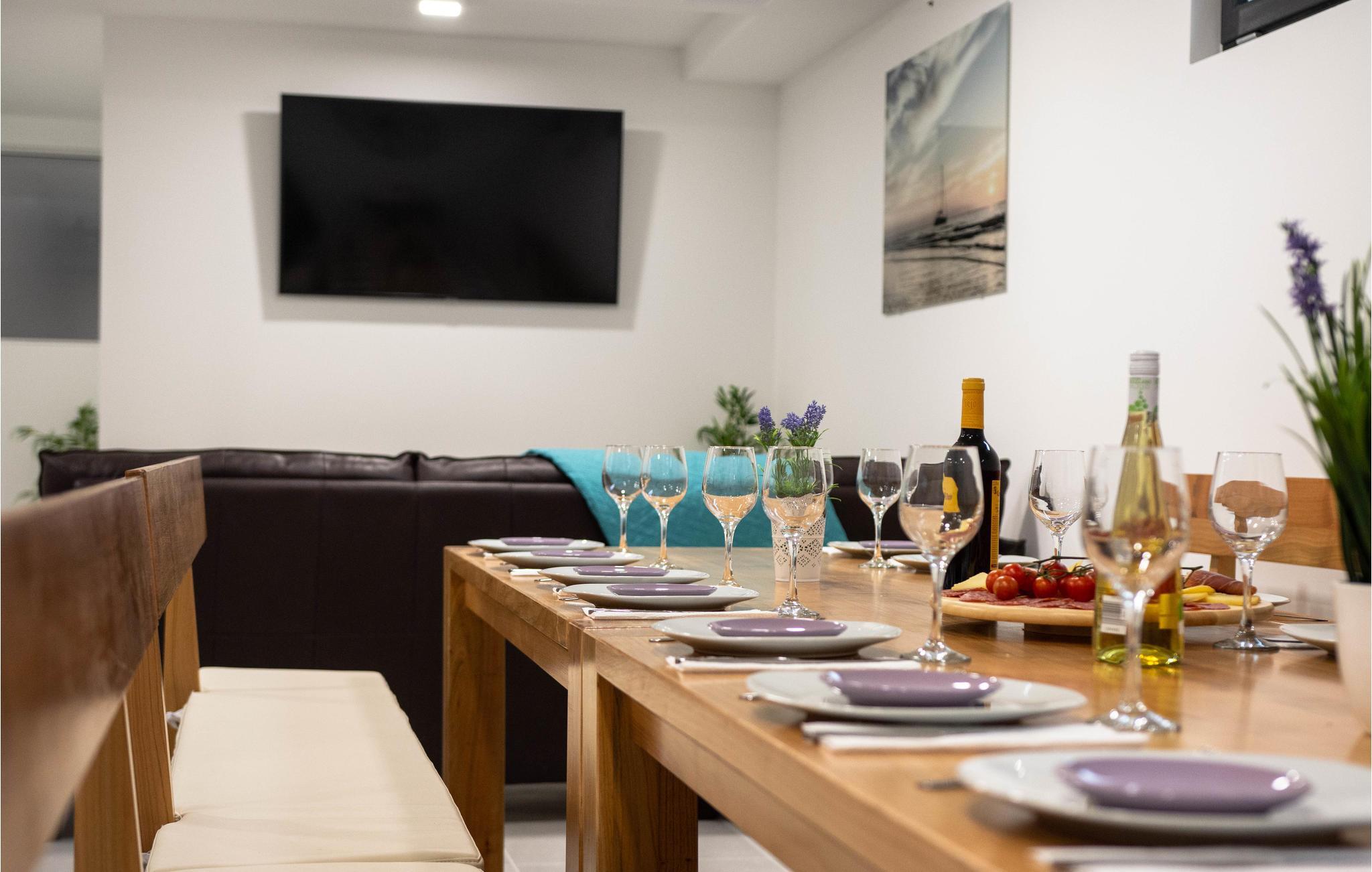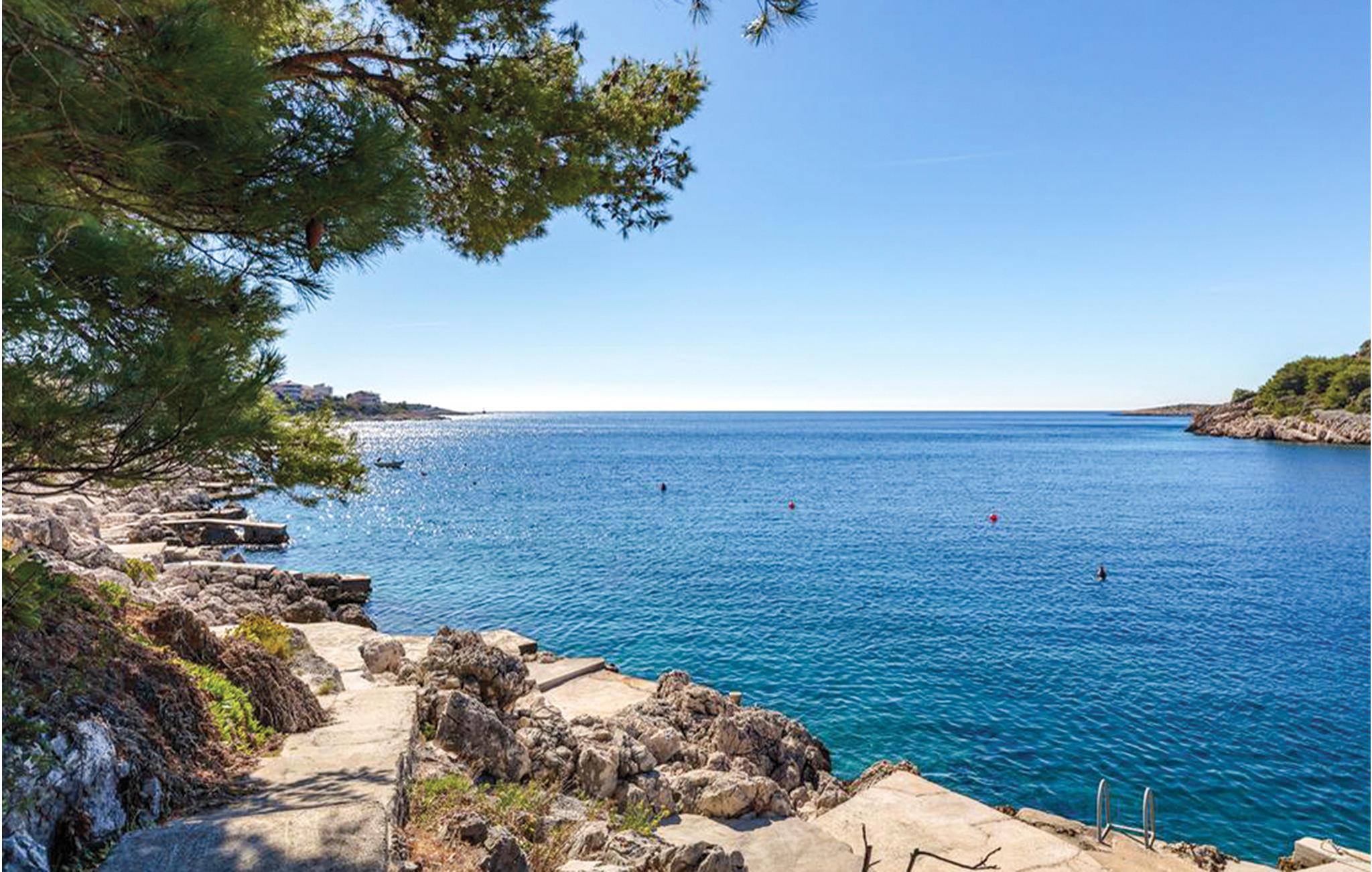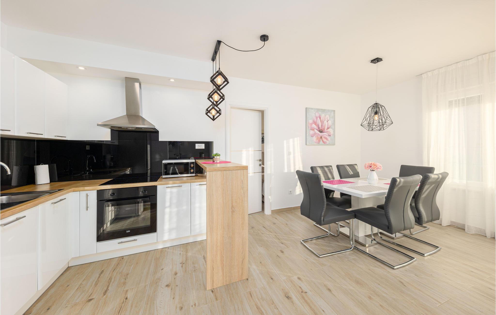 Nur ca. 60 m vom Meer entfernt befindet sich dieses luxuriöse Haus mit Pool. Das Haus verfügt über 5 Ferienwohnungen mit Meerblick. Jede Wohneinheit besteht aus 2 geräumigen Zimmern mit eigenem Bad und zusätzlicher Toilette, Küche, Esszimmer, Wohnzimmer und großem Balkon mit Meerblick. Im Souterrain befinden sich die Sauna und der Fitnessbereich sowie das Badezimmer und ein großes Esszimmer mit Küche. Das Haus liegt in einer ruhigen Bucht und wurde für den Familientourismus umgebaut. Nur 15 Autominuten entfernt befinden sich die unter dem Schutz der UNESCO stehenden Städte Trogir und Primosten. Wir empfehlen außerdem, die nahe gelegenen Nationalparks Krk und Kornati zu besuchen.