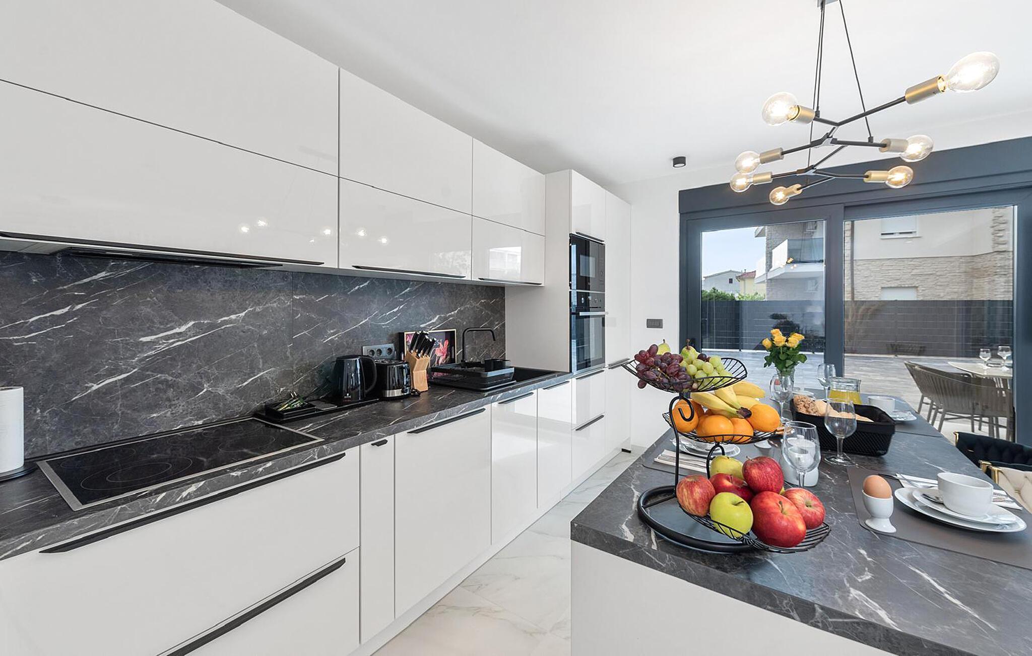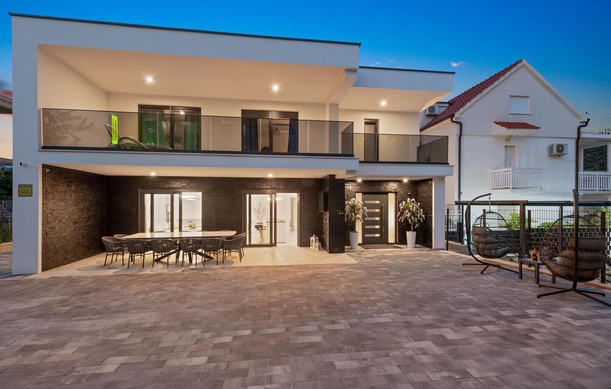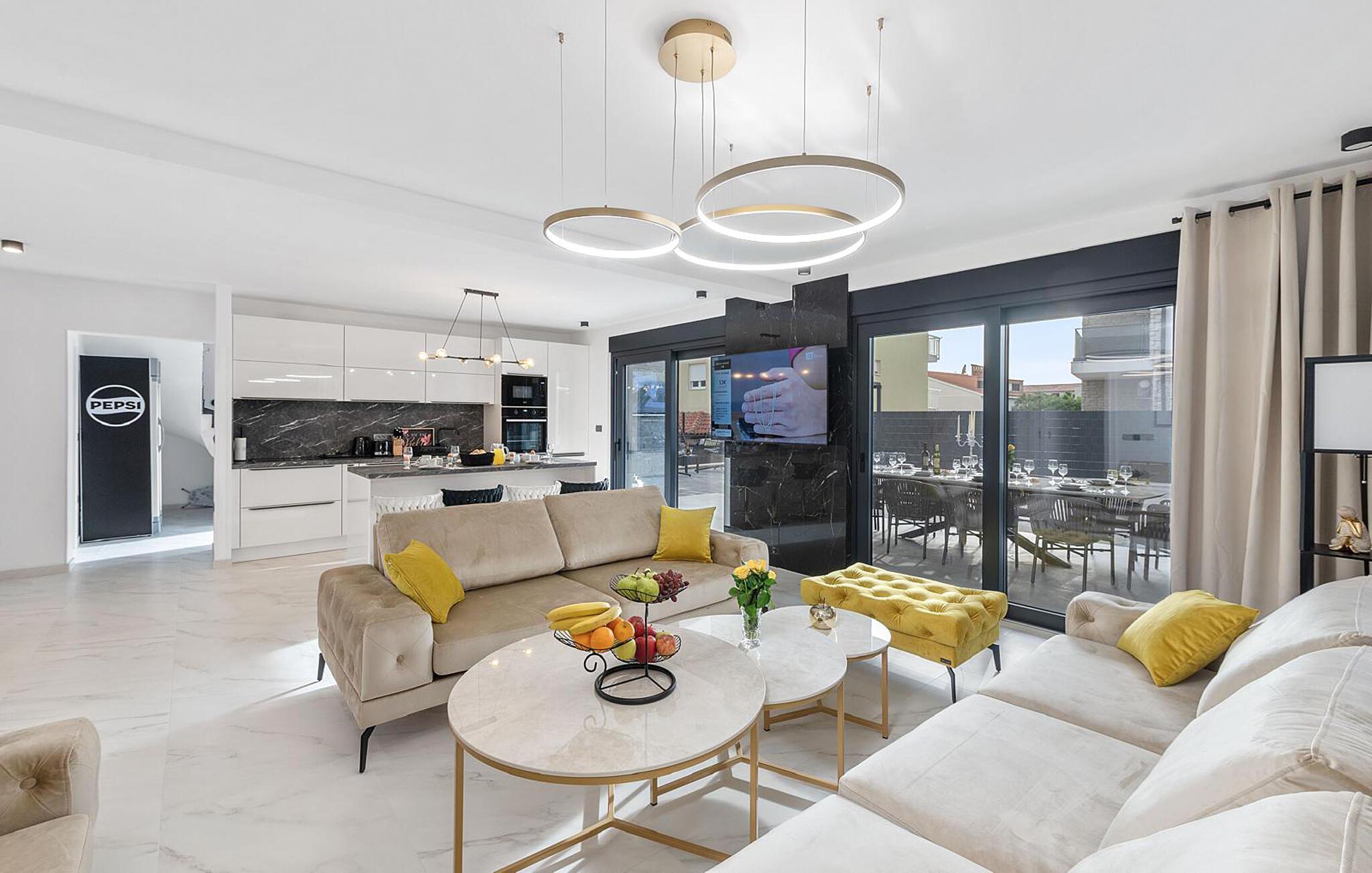 Draußen erwartet Sie eine großzügige Terrasse mit Essbereich und hochwertigen Lounge-Möbeln. Der einladende Pool mit Wasserspielen und die gemütlichen Liegen sorgen für entspannte Stunden unter der kroatischen Sonne. Die überdachte Grillstation ermöglicht gesellige Grillabende mit Familie und Freunden.