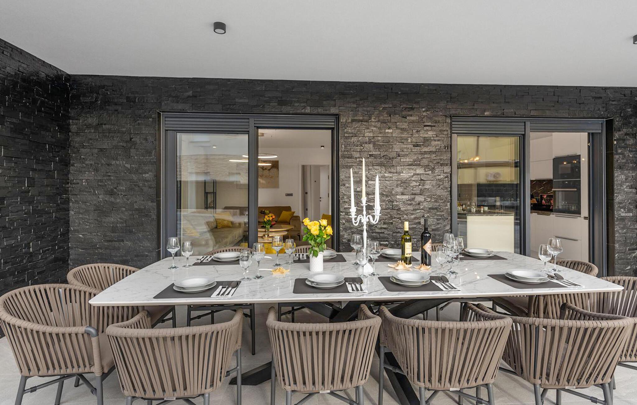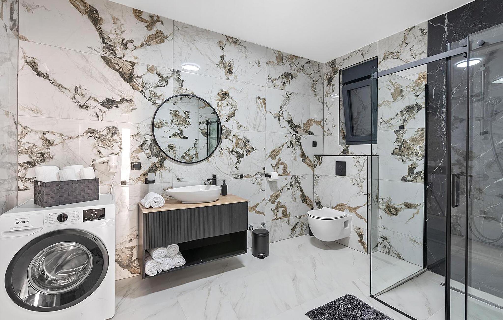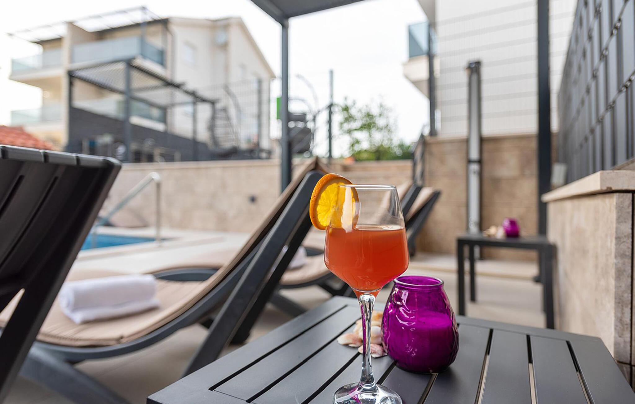 Draußen erwartet Sie eine großzügige Terrasse mit Essbereich und hochwertigen Lounge-Möbeln. Der einladende Pool mit Wasserspielen und die gemütlichen Liegen sorgen für entspannte Stunden unter der kroatischen Sonne. Die überdachte Grillstation ermöglicht gesellige Grillabende mit Familie und Freunden.