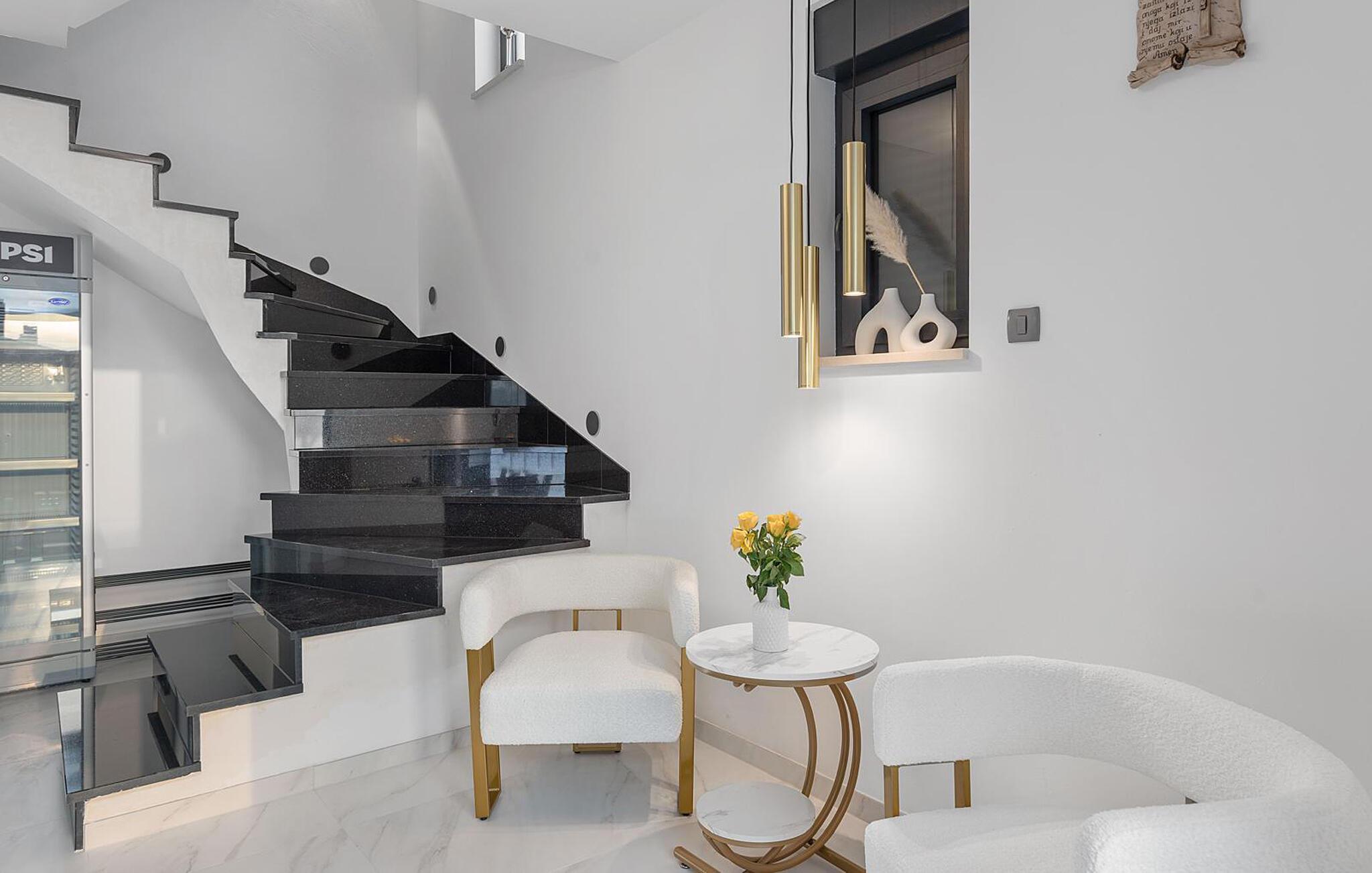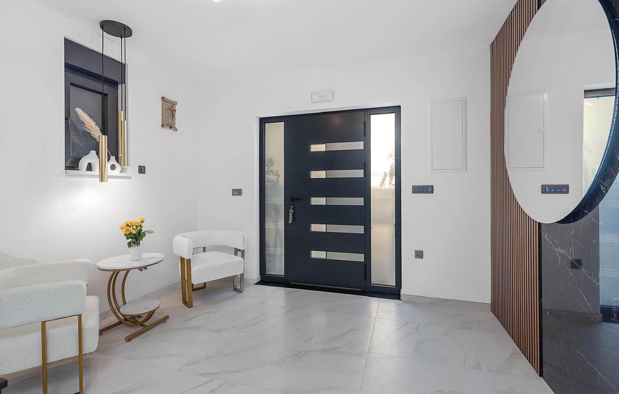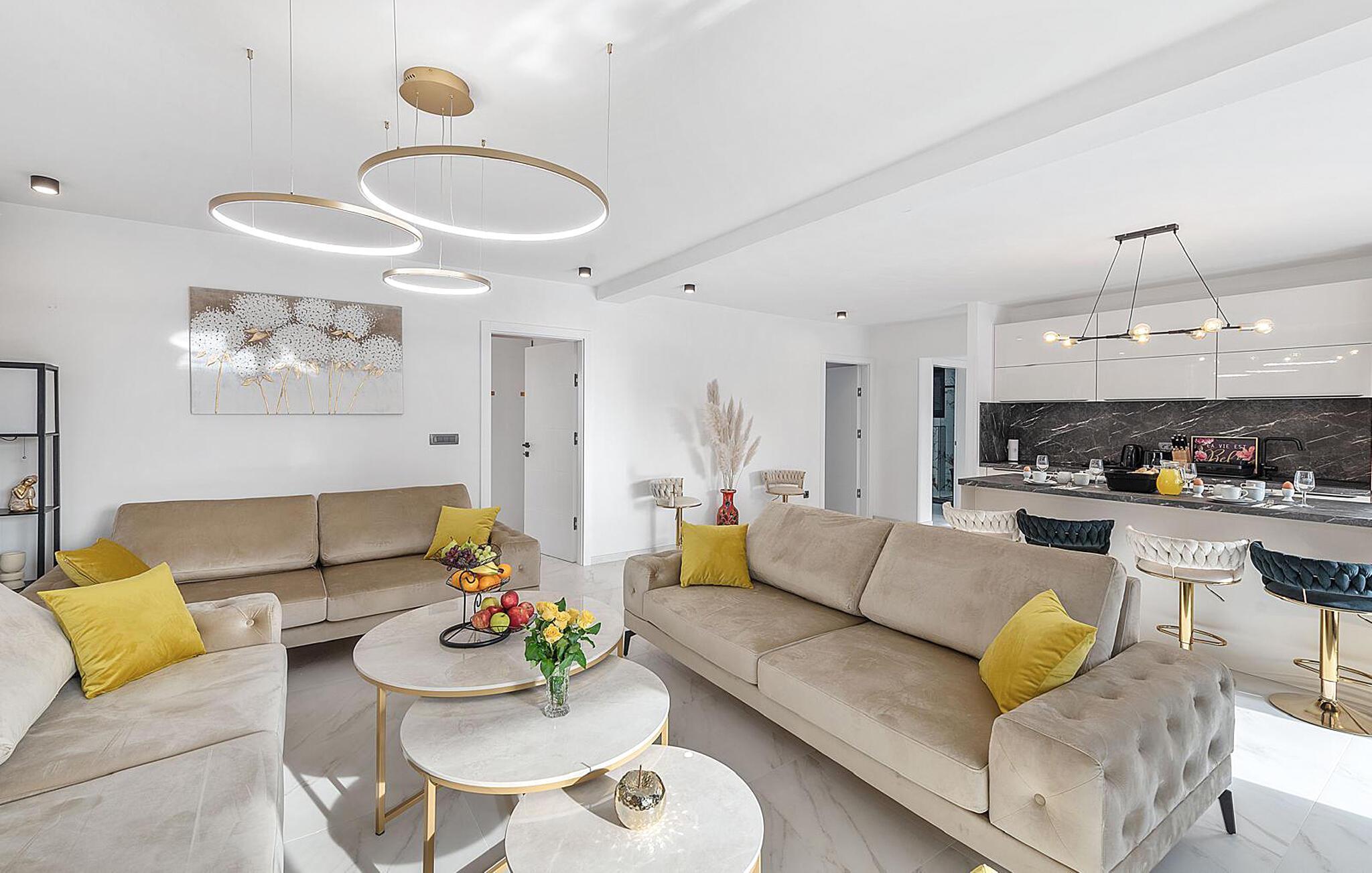 Dieses elegante Ferienhaus begrüßt Sie mit einem hellen, geschmackvoll eingerichteten Innenbereich. Die moderne Hochglanzküche mit Kochinsel macht gemeinsames Schlemmen zum Genuss. Der angrenzende Wohnbereich, ausgestattet mit bequemen Sofas in sanften Farbtönen und goldenen Akzenten, erhält dank großer Panoramafenster reichlich natürliches Licht. Breite Glasschiebetüren bieten hier einen bequemen Zugang zum Außenbereich.