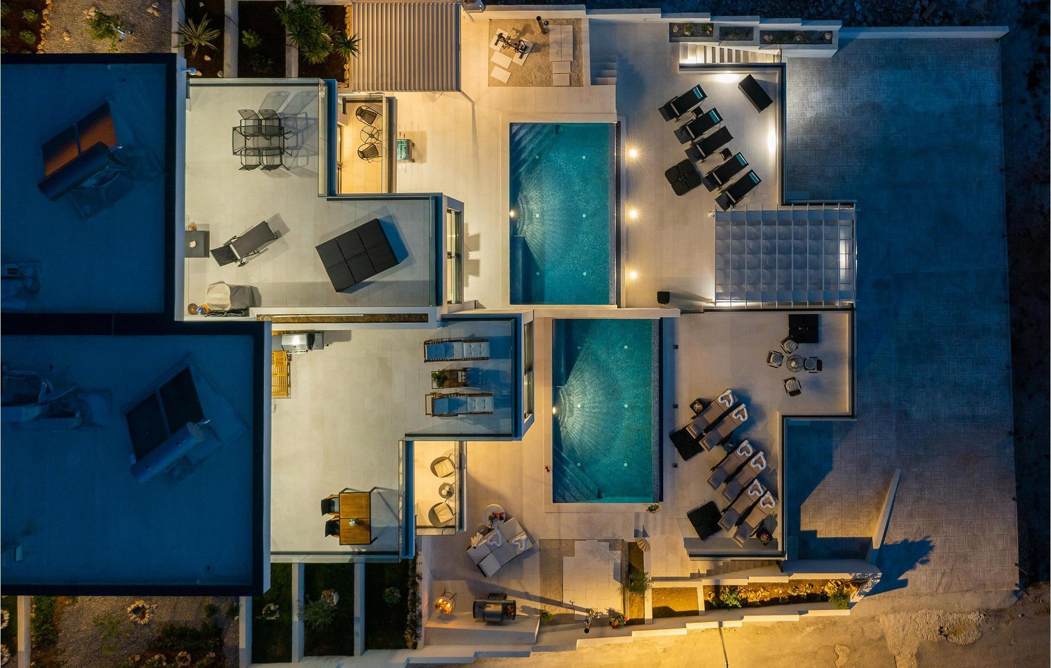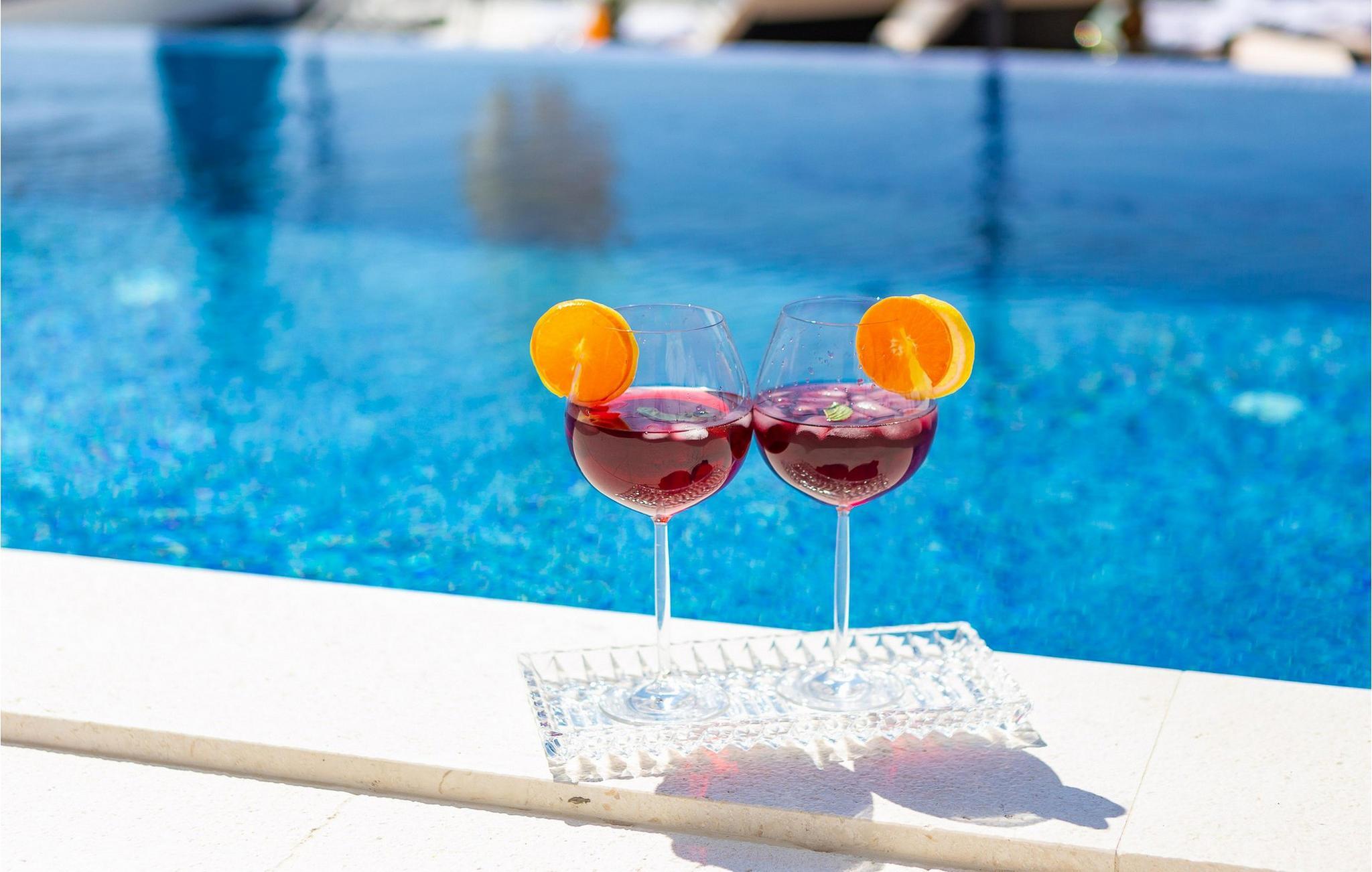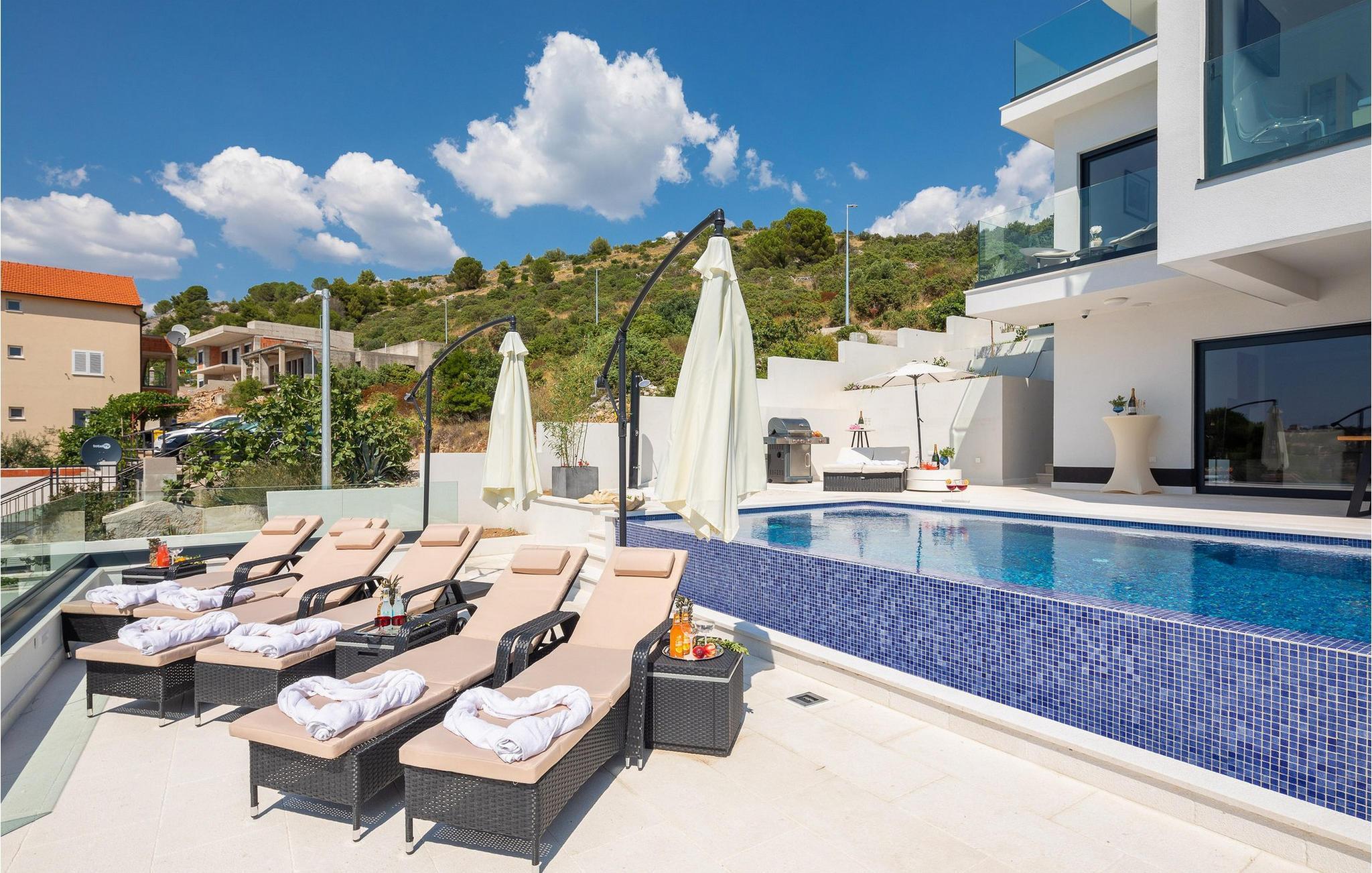Der sensationelle Außenbereich dieser komfortablen Doppelhaushälfte begeistert mit einem herrlichen, beheizten Infinity-Pool und mehreren Sonnenterrassen mit bequemen Liegen für erholsame Stunden unter dem blauen Himmel. Gönnen Sie sich erfrischende Drinks im Schatten, bewundern Sie den Sonnenuntergang und plaudern Sie bei stimmungsvollen Grillabenden in die lauen Sommernächte hinein.
