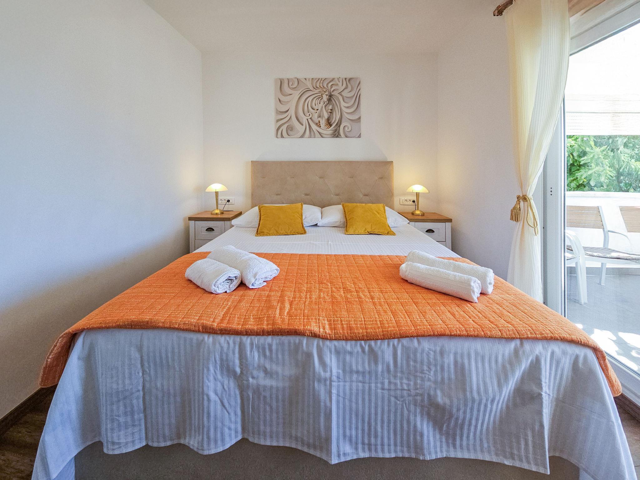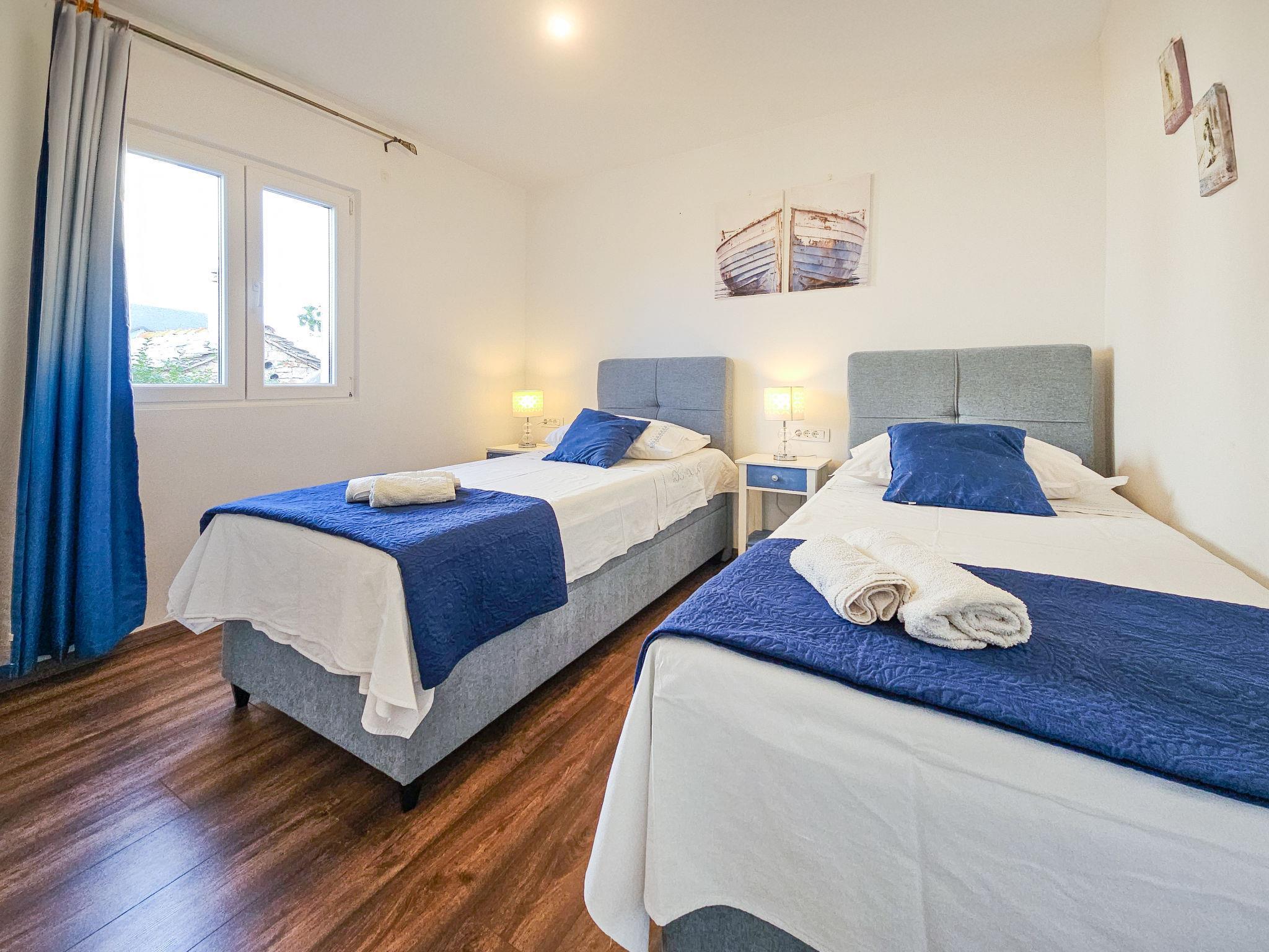 "A1", 3-Zimmer-Wohnung 85 m2 im 1. Stock, Südlage. Wohn-/Esszimmer mit Sat-TV (Flachbildschirm). Ausgang zur Terrasse. 1 Zimmer mit 1 franz. Bett (160 cm, Länge 200 cm). Ausgang zur Terrasse. 1 Zimmer mit 2 Betten (90 cm, Länge 200 cm). Offene Küche (4 Kochplatten, Mikrowelle, Tiefkühler). Dusche/WC. Grosse Terrasse 25 m2, überdacht. Balkonmöbel. Sehr schöne Sicht auf das Meer. Zur Verfügung: Haartrockner. Internet (Wireless LAN, gratis).