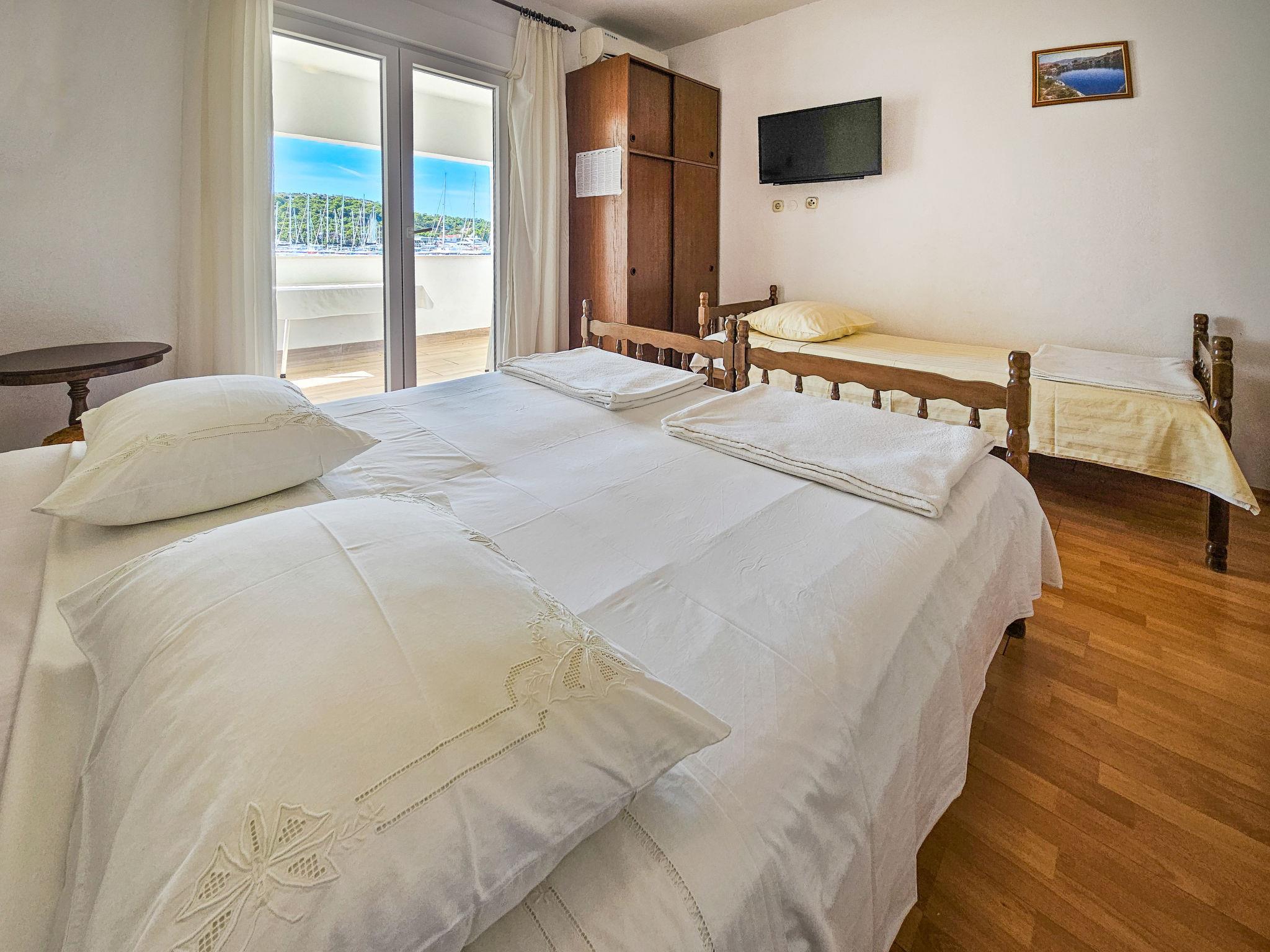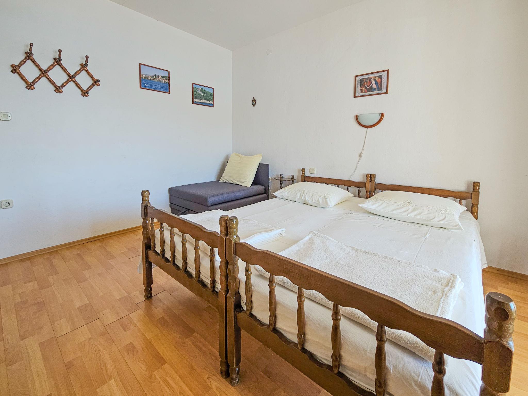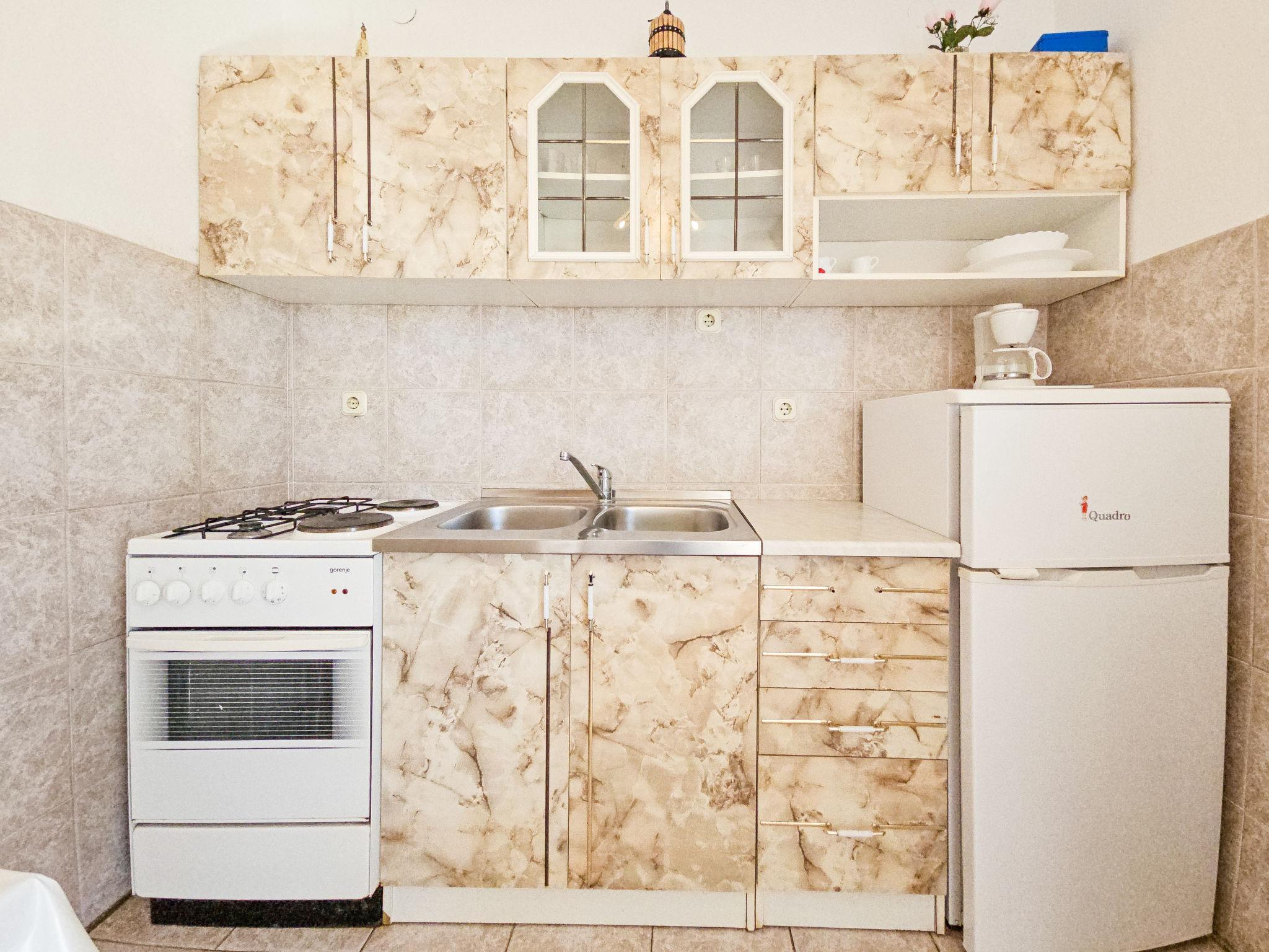 "A2", 2-Zimmer-Wohnung 40 m2 im 2. Stock, Südlage. 1 Zimmer mit 1 Bett (90 cm, Länge 200 cm), 1 Doppelbett (2 x 80 cm, Länge 200 cm), Dusche/WC und Sat-TV (Flachbildschirm), Klimaanlage. Ausgang zur Terrasse. Küche (4 Kochplatten, Backofen, Mikrowelle, Tiefkühler, elektrische Kaffeemaschine). Ausgang zur Terrasse. Terrasse 5 m2, überdacht. Balkonmöbel. Sehr schöne Sicht auf das Meer. Zur Verfügung: Haartrockner. Internet (Wireless LAN, gratis).