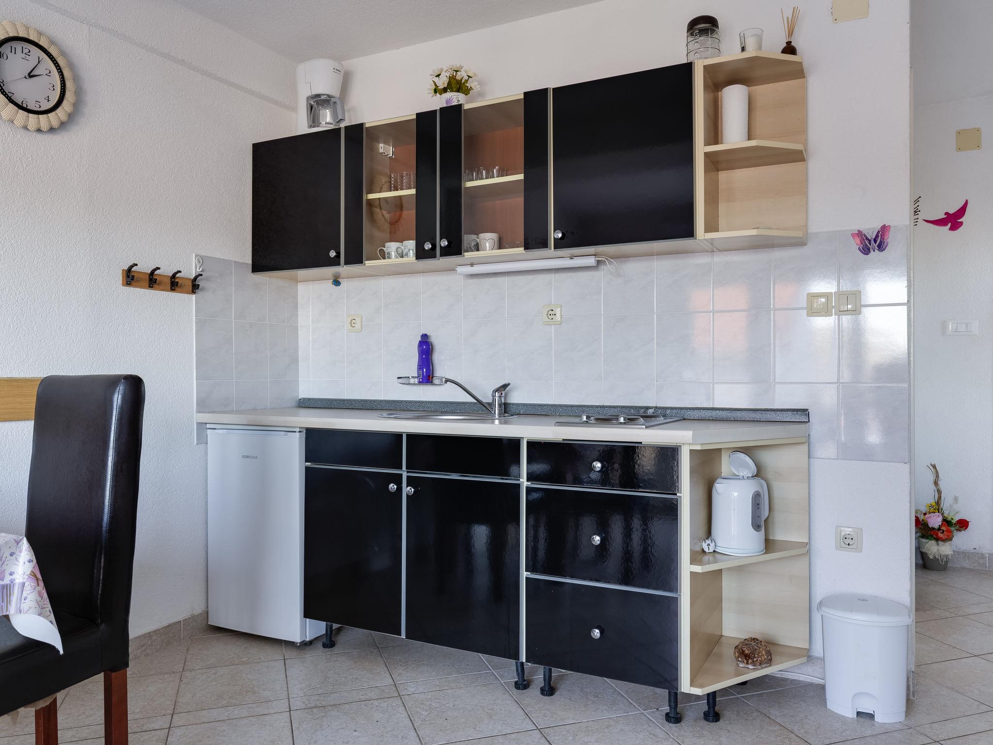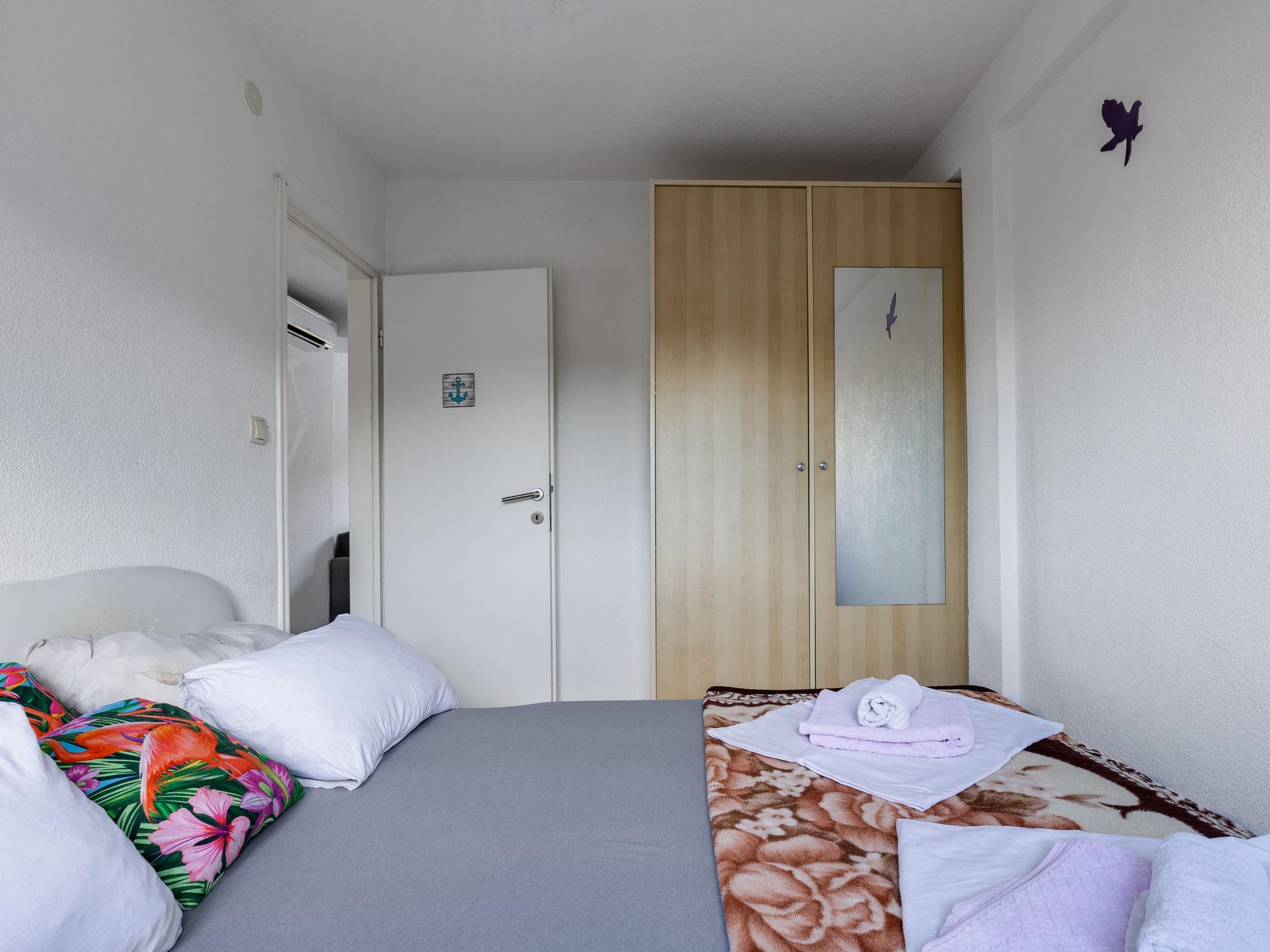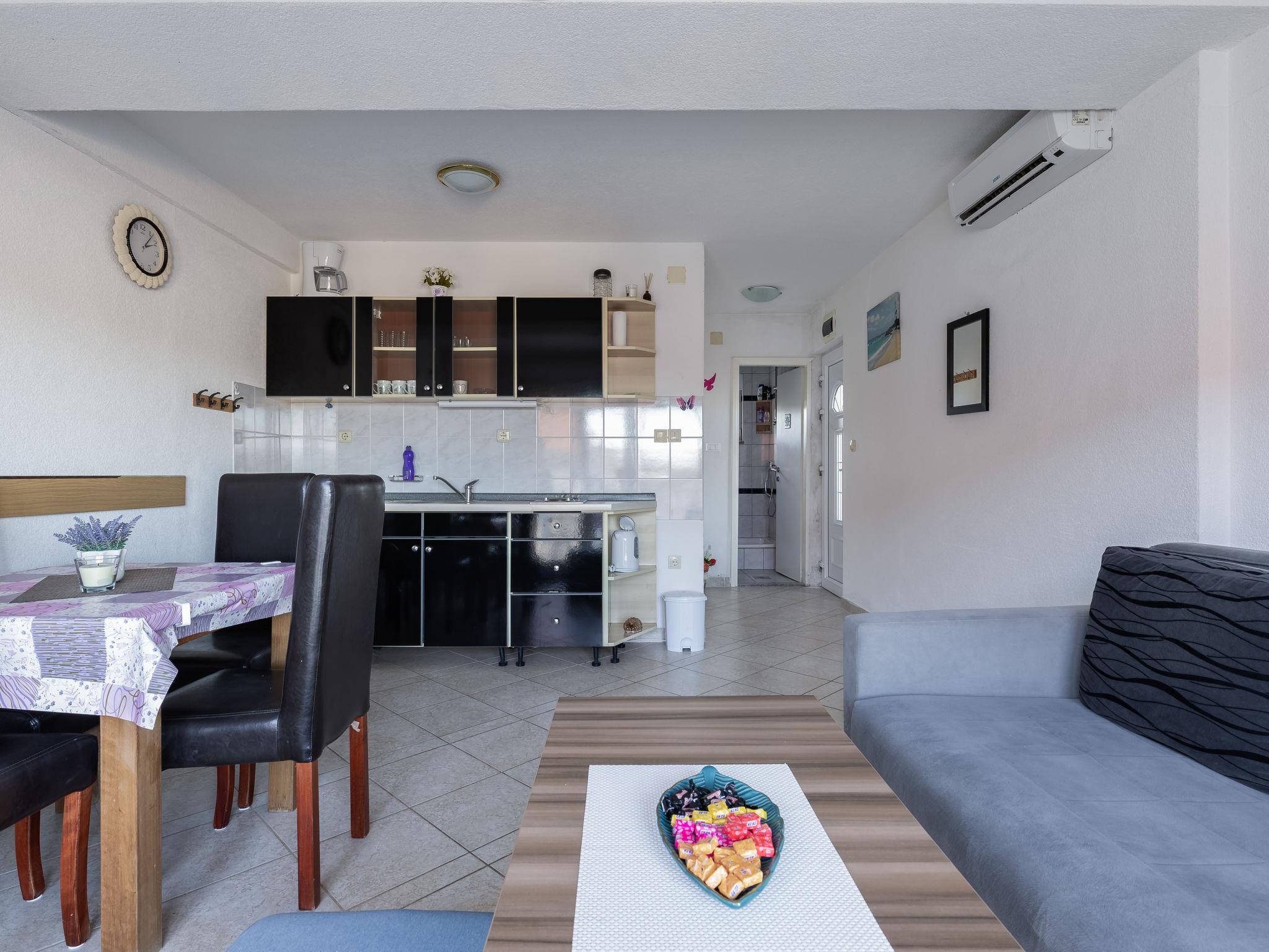 2-Zimmer-Wohnung 42 m2 im 1. Stock, Südostlage. Wohn-/Esszimmer mit 1 Doppeldiwanbett (160 cm, Länge 200 cm), Sat-TV (Flachbildschirm), Klimaanlage. Ausgang zum Balkon. 1 Zimmer mit 1 franz. Bett (160 cm, Länge 200 cm). Offene Küche (2 Kochplatten, Wasserkocher, elektrische Kaffeemaschine). Dusche/WC. Keine Heizmöglichkeit. Balkon 5 m2. Balkonmöbel. Sicht auf das Meer. Zur Verfügung: Haartrockner. Internet (WLAN).