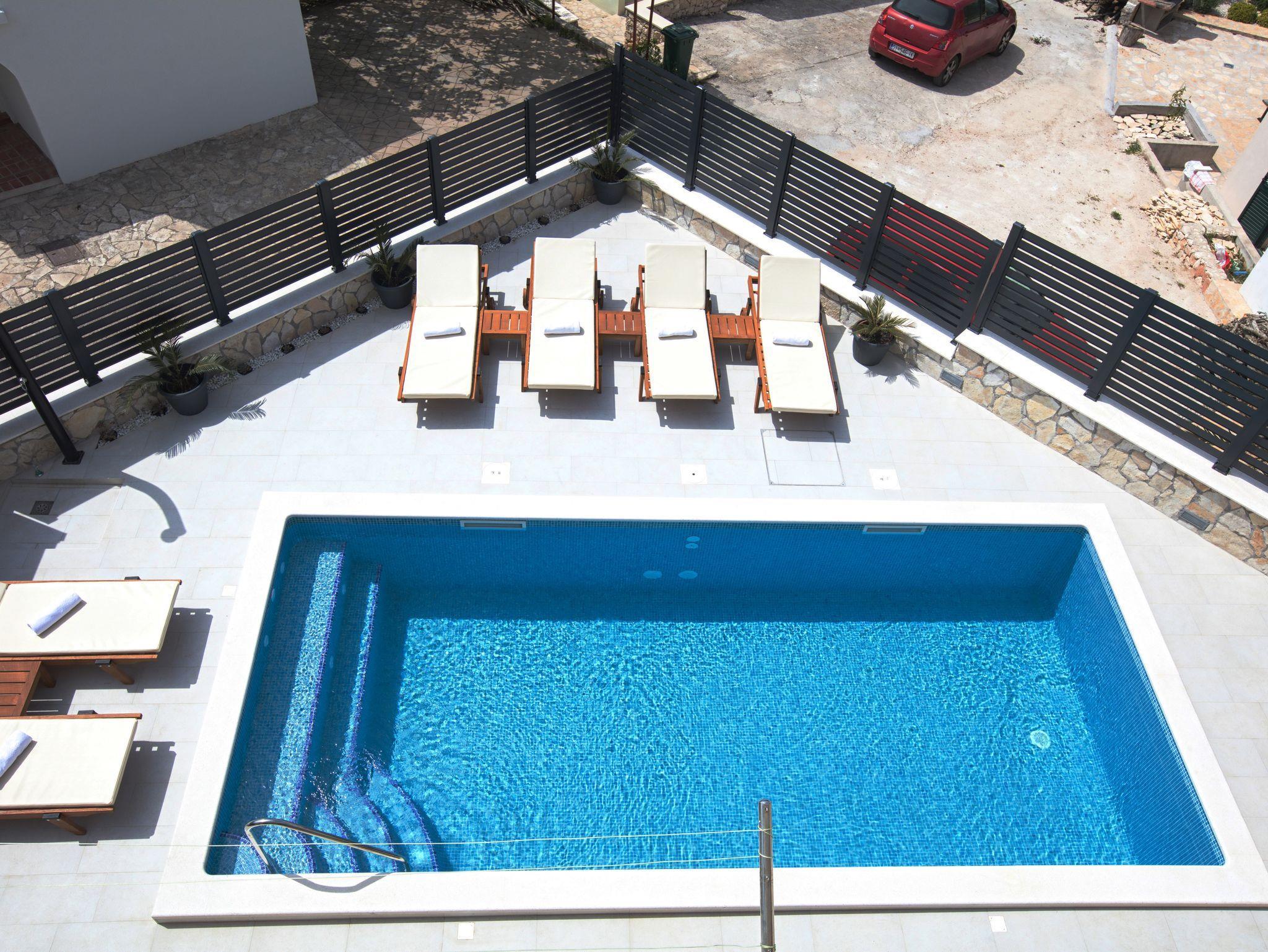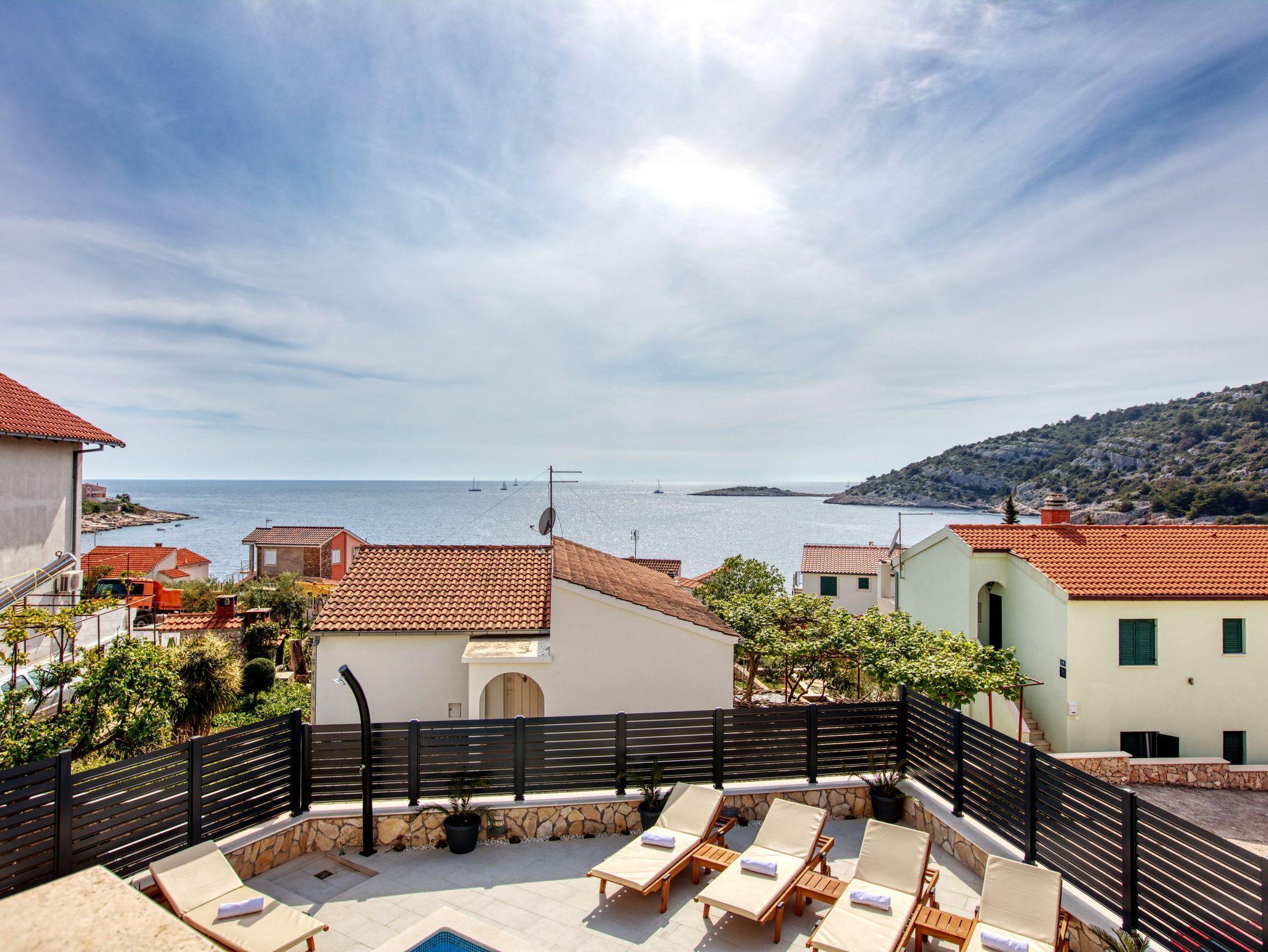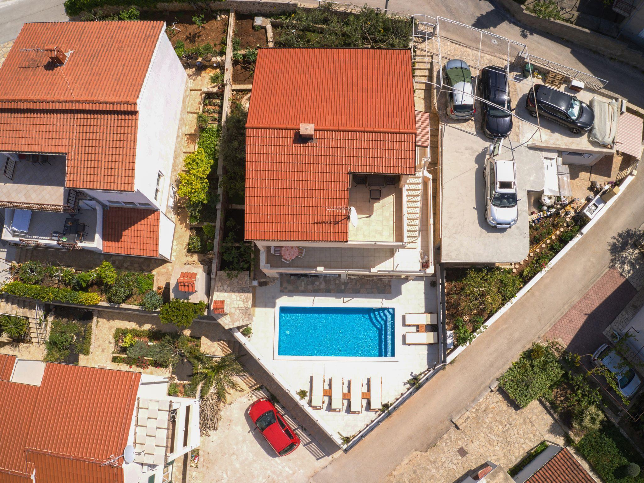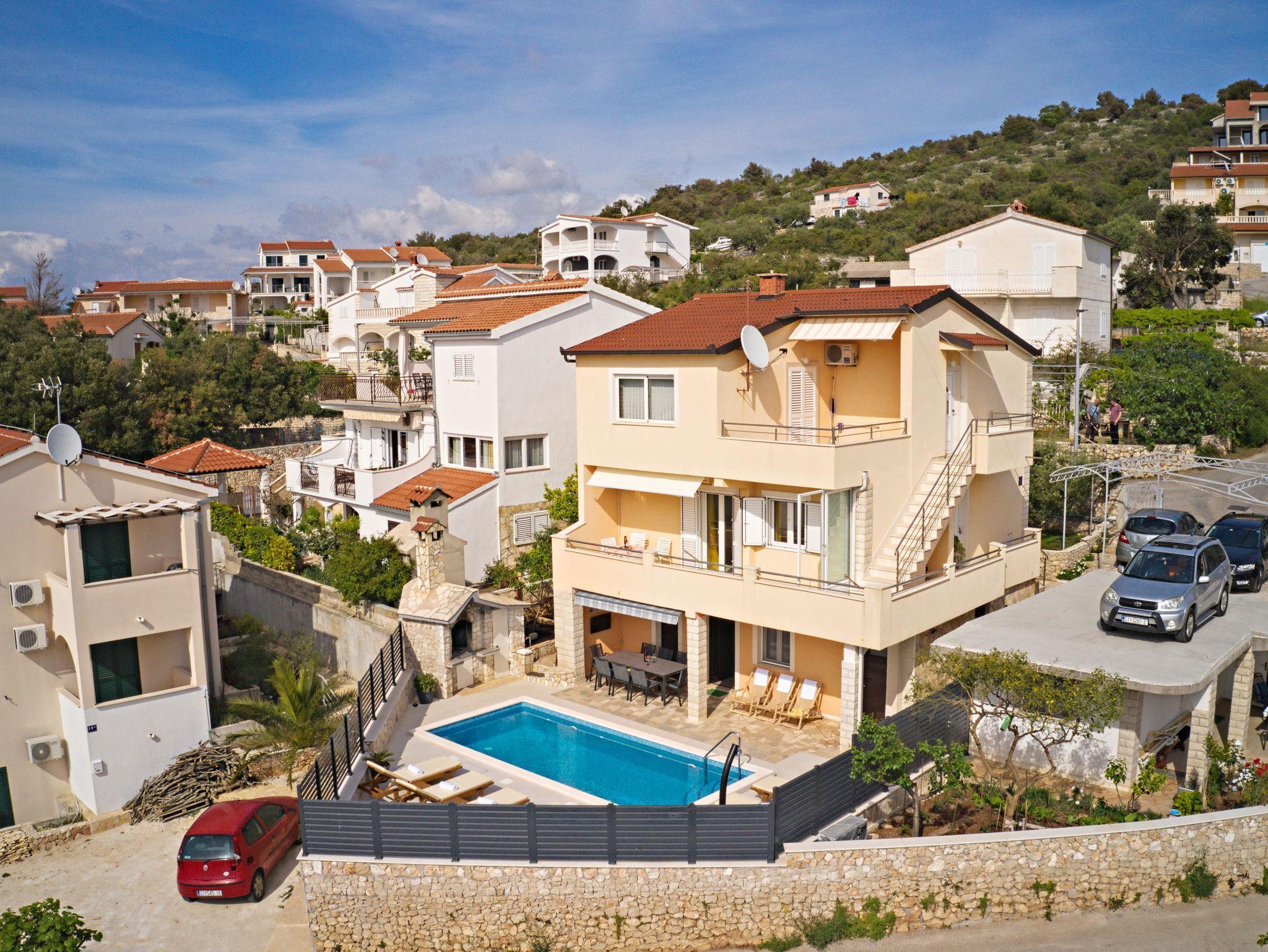 Haus bietet Platz für 10 Gäste. Die Betten sind in Schlafzimmern, die es 4 gibt, und in Wohnzimmer, innerhalb einer Gesamtfläche von 122m2, angeordnet. Die Gäste haben eine eigene Terrasse zur Verfügung, auf der sie in warmen Sommernächten genießen können. Das Haus bietet Meerblick. Für vollen Genuss und Entspannung gibt es einen privaten Grill für Gäste dieser Unterkunft. Während ihres Aufenthalts können sich Gäste im privaten Schwimmbad entspannen. IM PREIS INBEGRIFFEN: Kurtaxe, Endreinigung, Klimatisierung, Pool, Parkplatz, Internet, Kinderbett, Bügeleisen, Bügelbrett, Föhn, Sonnenschirm, Liegestühle. UNVERBINDLICHE ZUSÄTZLICHE KOSTEN: Bootsanlegeplatz (20,00 € pro Nacht). Die Verfügbarkeit zusätzlicher Dienstleistungen in Ihrem reservierten Termin und die Preise derselben (falls nicht aufgeführt) müssen im Voraus überprüft werden. Zusätzliche Dienstleistungen die in der Zahlungsaufforderung nicht aufgeführt sind werden direkt beim Vermieter bezahlt, angenommen der Gast nutzt auch diese. Ermäßigung auf den Grundpreis: Gratistag 14=13 (bei einem Aufenthalt von 14 Tagen oder mehr erhalten Sie einen Gratistag für den Aufenthalt bis 31.12.26).