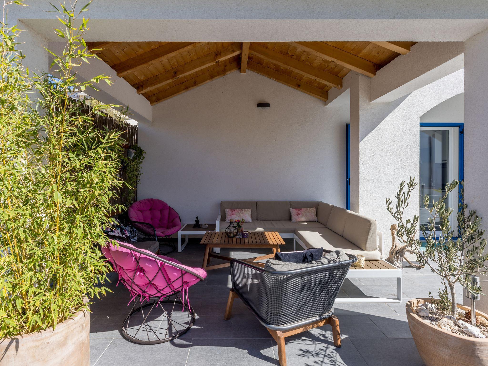 Umgebung des Objekts (Eingerichtet), Hof (500m2, Kinderbereich, Sitzbereich), Parkplatz (Anzahl der Parkplätze: 6, Entfernung vom Objekt: im Hof), Pool: privat, Dimensionen: 8.5m x 4.5m x 1.5m, Wassertyp: Süßwasser, WiFi Internet, Föhn, Bügeleisen, Bügelbrett, Liegestühle, Kinderbett