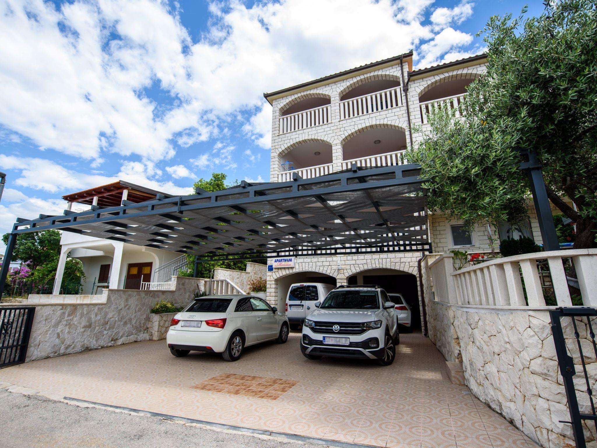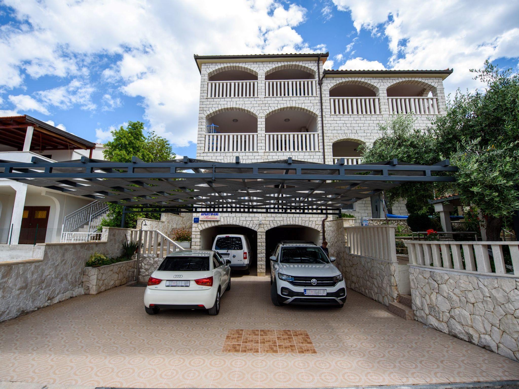 Razanj 10 km von Rogoznica: Schönes Appartementhaus "Marina". Im Ortsteil Ljoljinica, ruhige, erhöhte Lage, 40 m vom Meer. Zur Mitbenutzung: Aussendusche, Terrasse, Gartenmöbel, Grill, Parkplatz (überdacht) beim Haus auf dem Grundstück, Gemeinschaftsgarage. Einkaufsgeschäft, Restaurant 200 m, Bushaltestelle 5.1 km, Felsstrand 40 m. Bitte beachten: Weitere Unterkünfte sind buchbar.