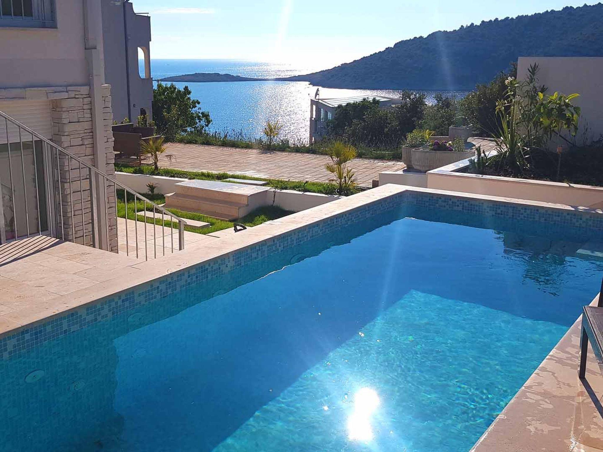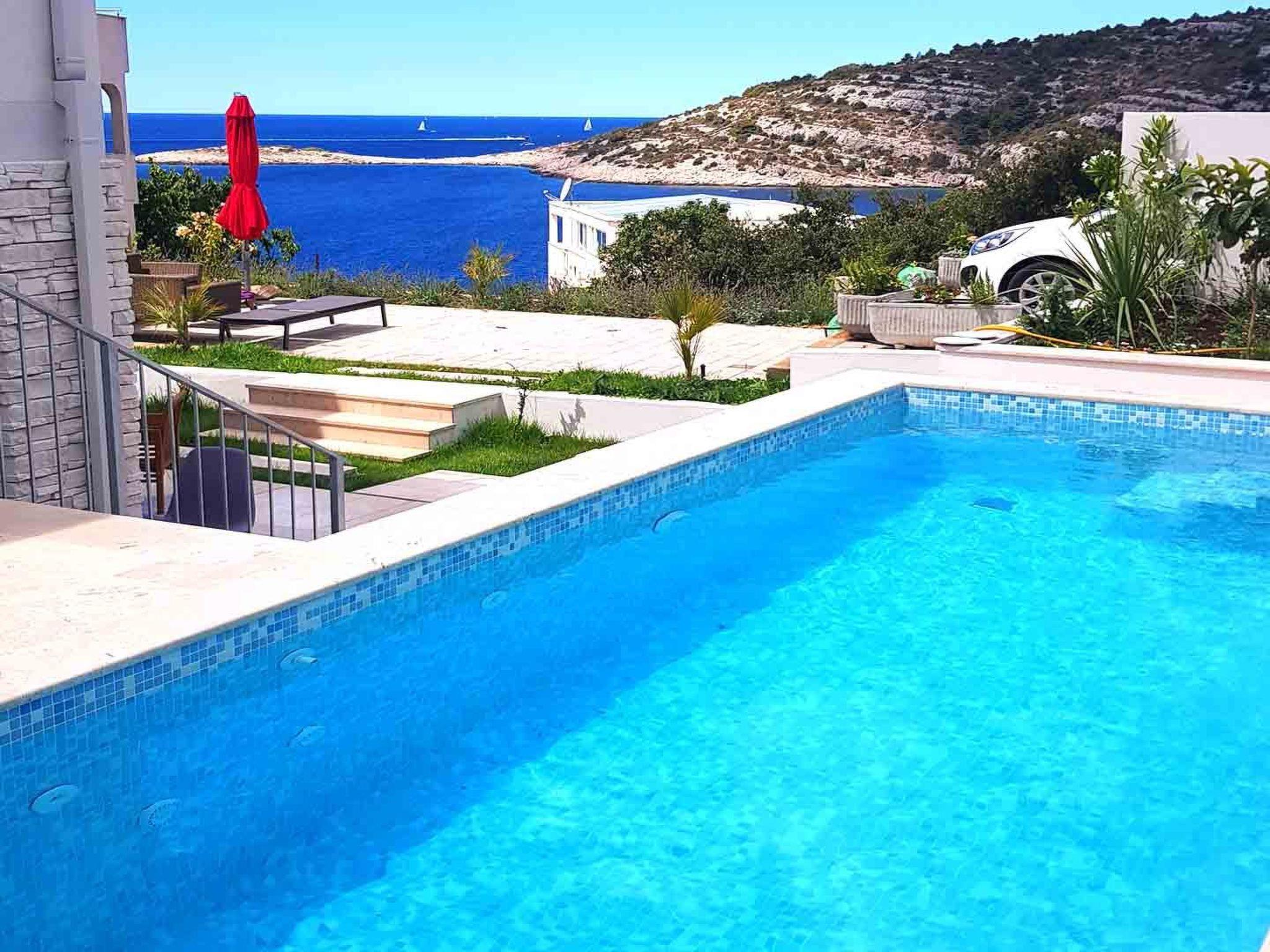 Der Außenbereich ist als gemütlicher Garten mit Tisch und Stühlen im Freien und einer Sitzecke gestaltet. Die Gäste können sich im beheizten Außenpool (21 m2) mit Wasserfall erfrischen oder auf den Liegestühlen rund um den Pool die Sonne genießen, während sie den atemberaubenden Meerblick bewundern. Für diejenigen, die gerne im Freien kochen, steht ein Außengrill zur Verfügung.