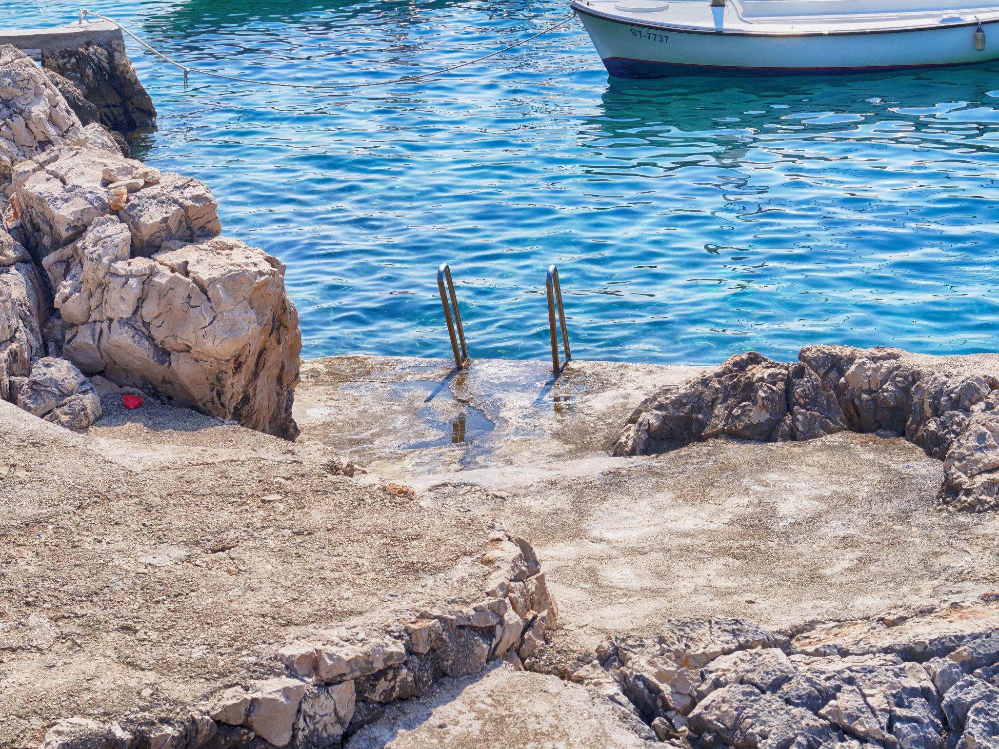 Vom Haus aus sind es 150 m bis zum Strand. Der Strand direkt am Haus geht relativ steil ins Meer, deswegen sind Leitern angebracht. Auf der anderen Seite der Bucht (5 min zu Fuß) befindet sich noch ein Strand (Kiesel), der flach ins Wasser führt. Dieser ist für kleinere Kinder und Nichtschwimmer geeignet.