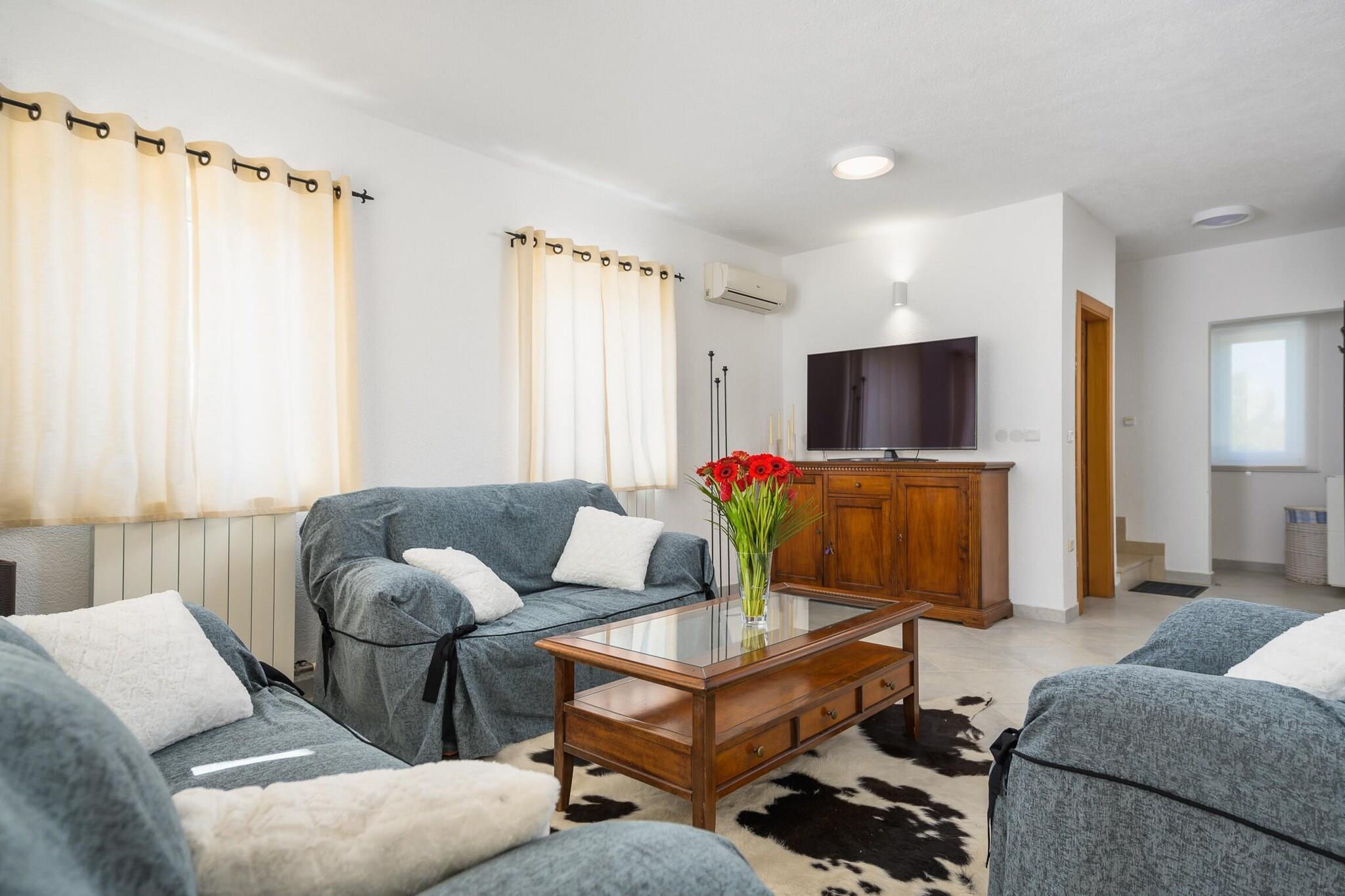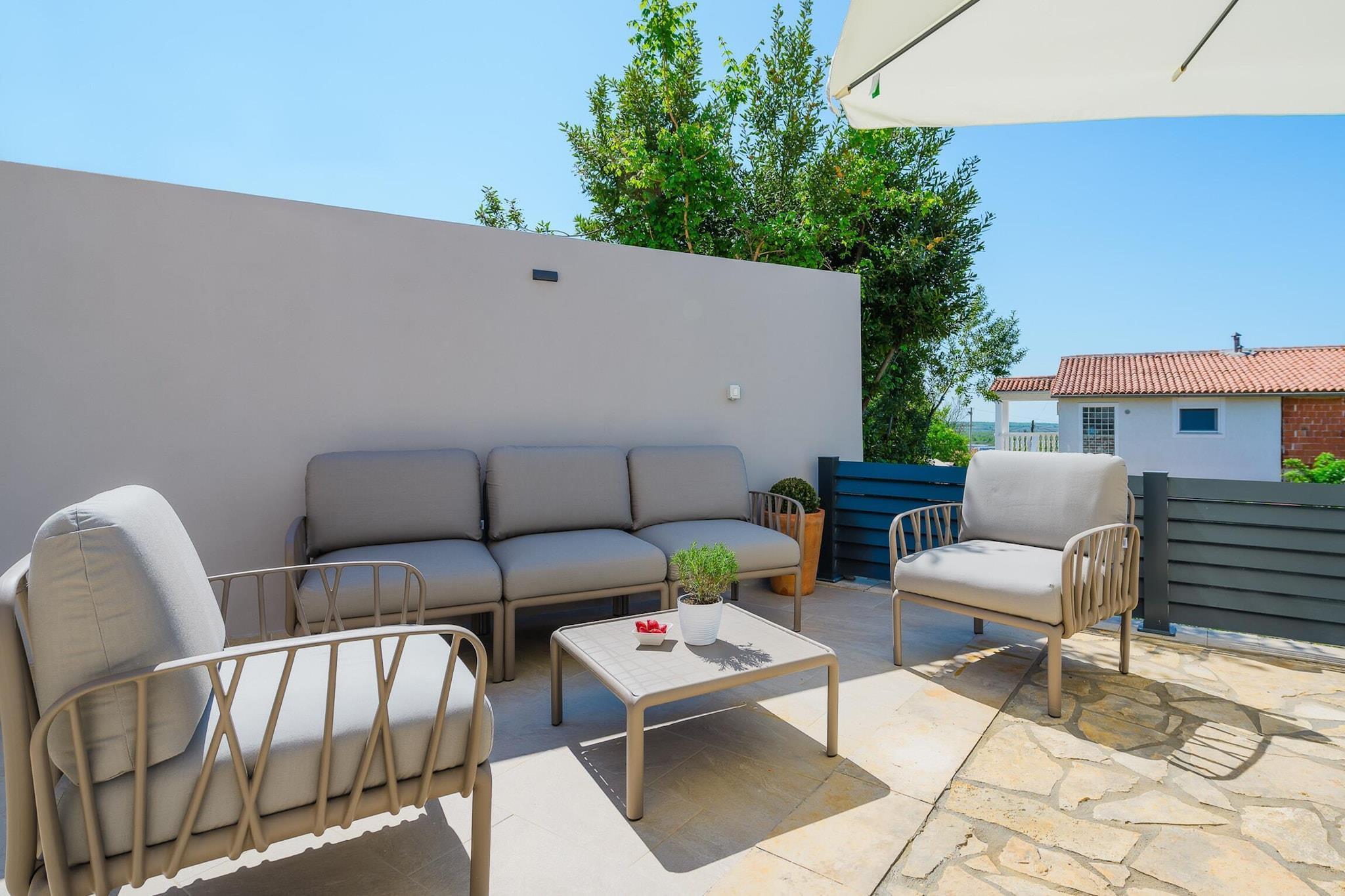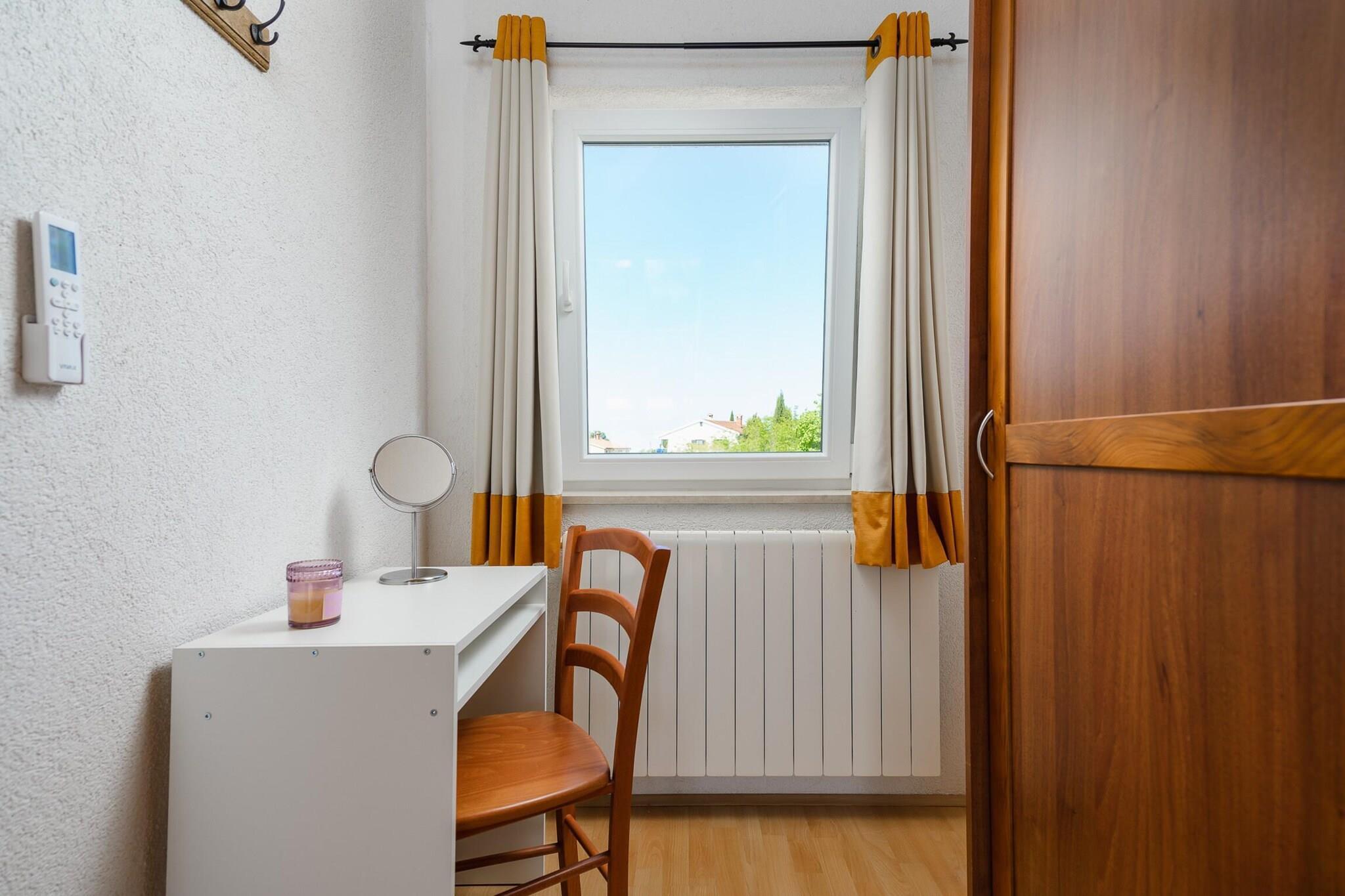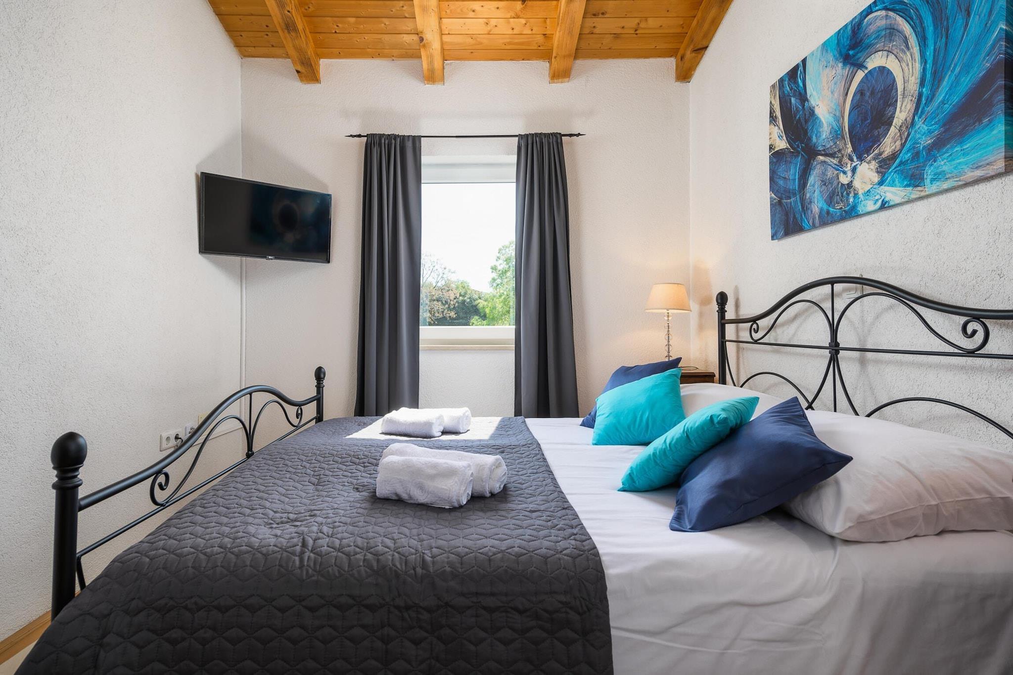 Villa Zaza ist eine charmante Villa mit zwei Schlafzimmern, Pool und Meerblick. Es bietet Platz für 4+2 Personen; Im Wohnbereich befindet sich ein Schlafsofa. Die Villa verfügt über einen offenen Wohn- und Küchenbereich mit Ausgang zur Terrasse, ideal für das morgendliche Frühstück oder Abendessen im Freien. Die Treppe führt zum Loungebereich in der Nähe des Pools. Es gibt auch eine Außendusche. Die Villa hat 2 Schlafzimmer im ersten Stock; ein Schlafzimmer mit Doppelbett und ein Schlafzimmer mit zwei Einzelbetten mit einem großen Balkon mit Couchtisch und einem Sofa. Die beiden Schlafzimmer teilen sich ein Badezimmer mit Dusche. Unten gibt es eine Toilette. Am Eingang der Villa gibt es einen Parkplatz für 2 Autos. Das Dorf ist sehr beliebt bei Reisenden, es gibt Restaurants zu Fuß erreichbar, Lebensmittelgeschäfte, Cafés. Die Strände sind ca. 10 Minuten mit dem Auto entfernt, Lanterna Strand oder Porec Strand.