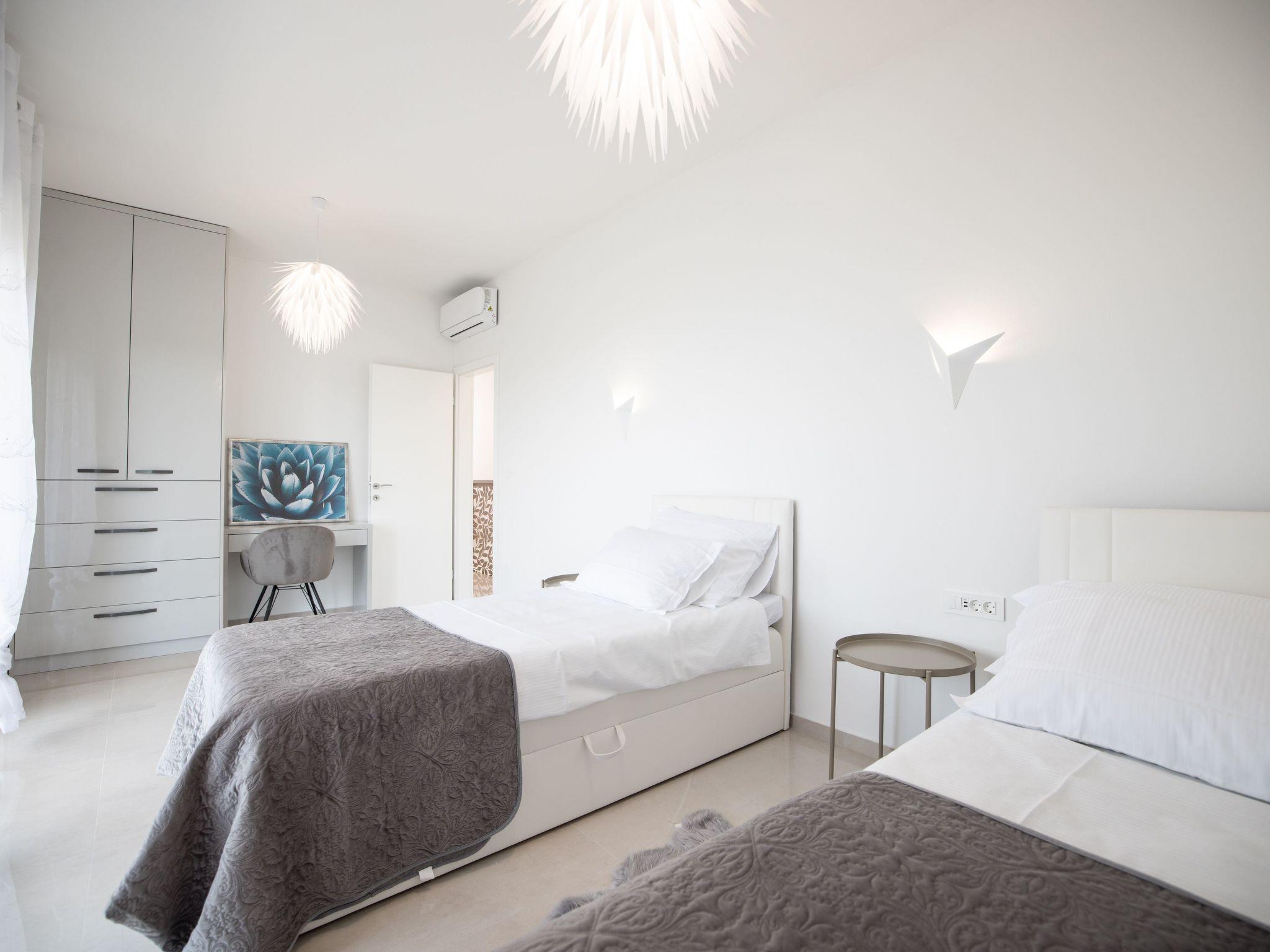 Im Obergeschoss befinden sich 3 Schlafzimmer mit zwei Doppelbetten und zwei Einzelbetten, die alle über einen Balkon mit Meerblick verfügen. Zwei Bäder befinden sich ebenfalls im Obergeschoss.