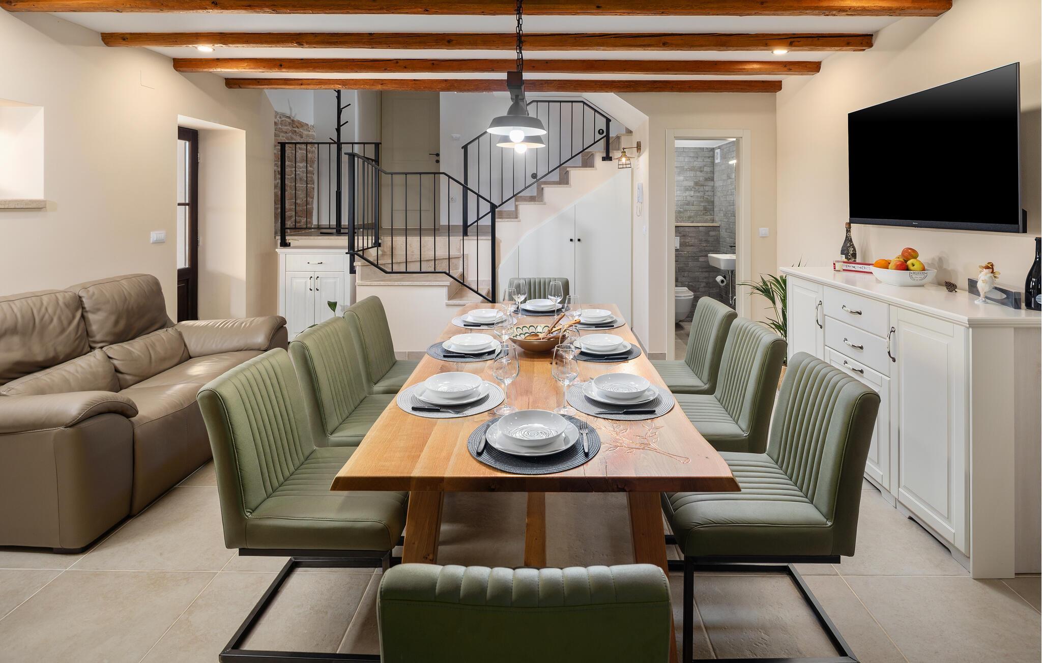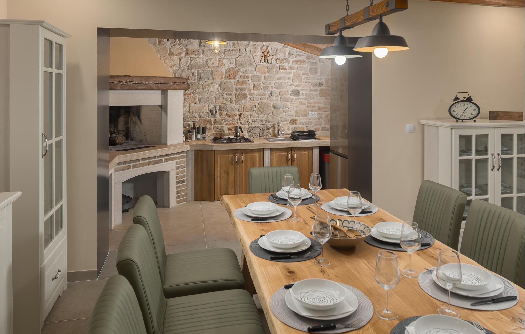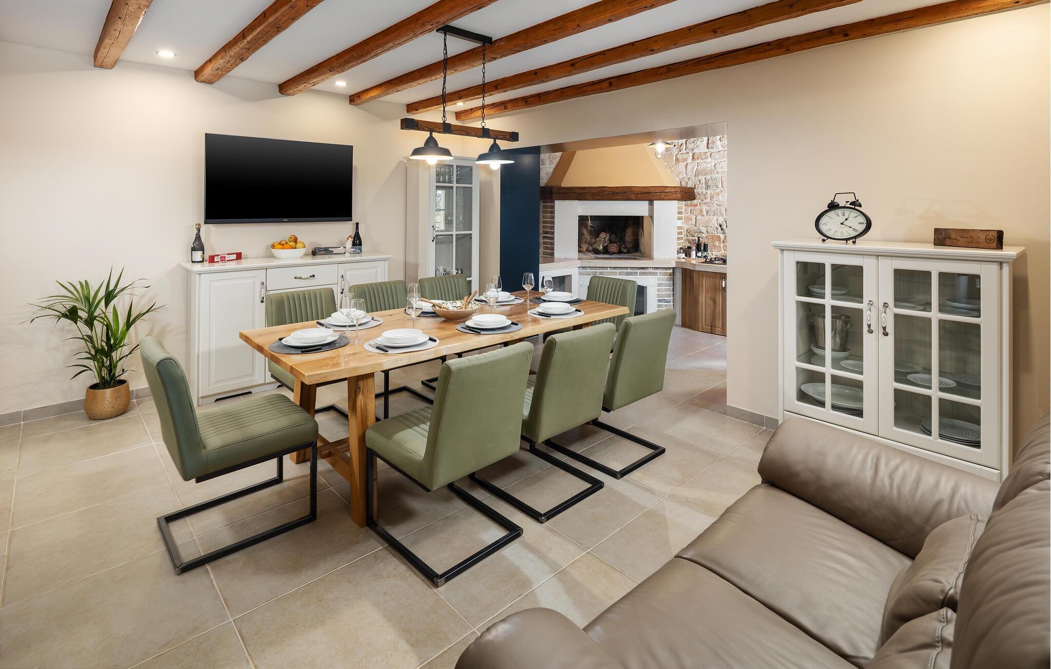 Dieses große Ferienhaus besticht durch seinen rustikalen Stil mit gemauerten Steinwänden und einer charmanten Küche mit offenem Grillofen. Die komfortable Einrichtung sorgt dafür, dass Sie und Ihre Familie sich hier sofort wohlfühlen. Im Außenbereich laden zwei überdachte Terrassen dazu ein, die Zeit im Schatten zu genießen, während der private Pool für Erfrischung sorgt. Ob gemeinsames Grillen, entspannte Stunden auf der Terrasse oder ein Sprung ins kühle Nass – hier können Sie die Seele baumeln lassen.