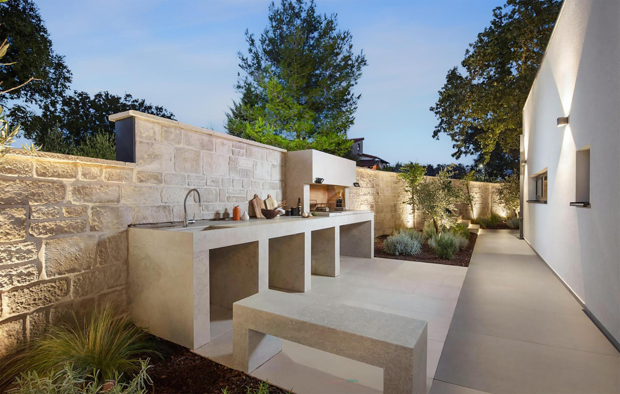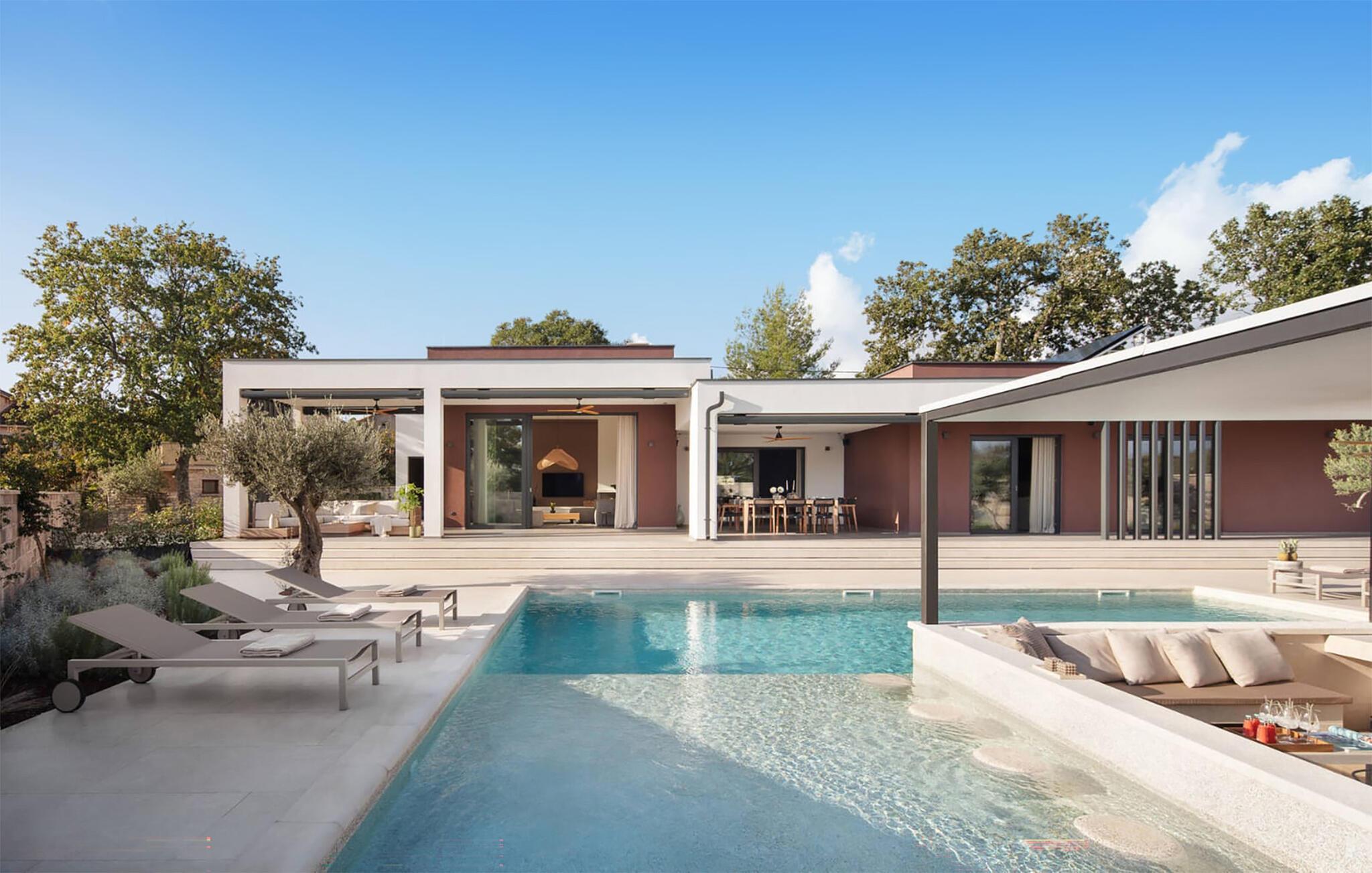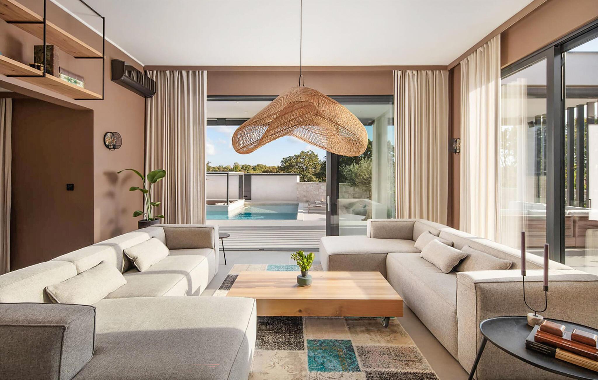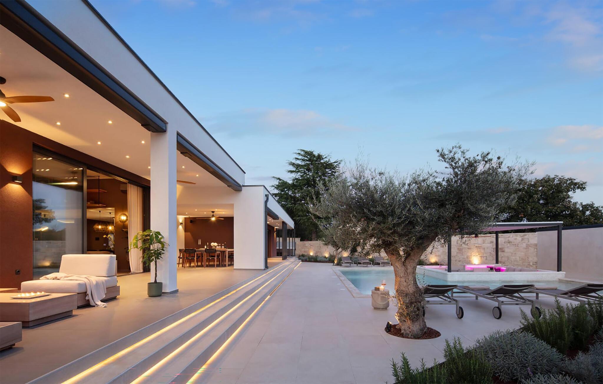 Unweit des Limski Fjords und der wunderschönen adriatischen Küste empfängt Sie dieses große Haus mit moderner Architektur. Die großartigen und komfortablen Räume der Villa verteilen sich auf einer Ebene und laden Sie zum Entspannen auf der Sofalandschaft ein. In Verbindung mit dem Essbereich und der stilvollen und vollständig ausgestatteten Küche bildet dieser Bereich das Herzstück der Villa, in der das Zusammenkommen der Gruppe zu einem Genuss wird.