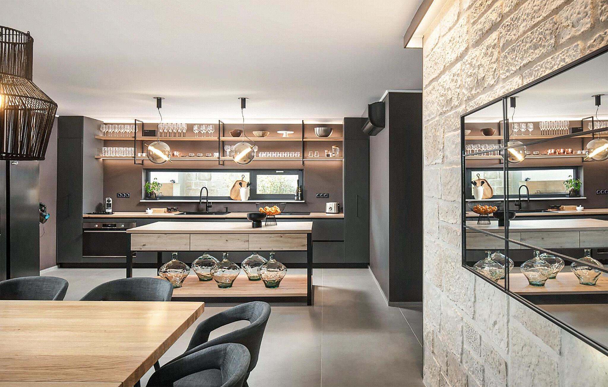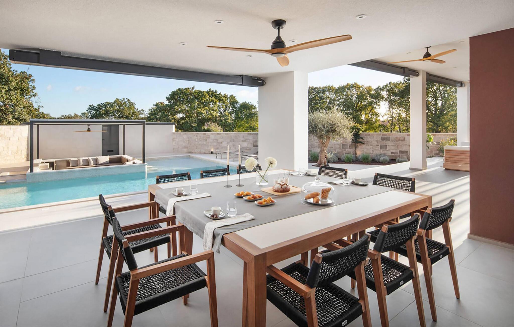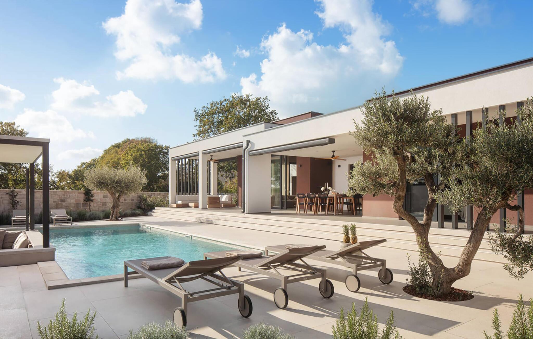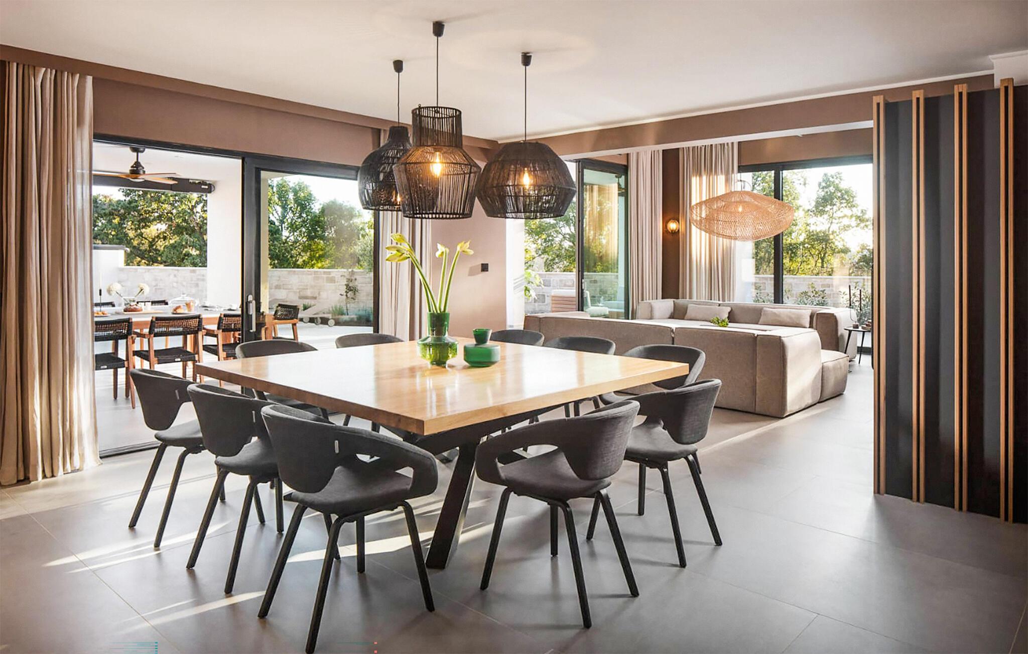 Unweit des Limski Fjords und der wunderschönen adriatischen Küste empfängt Sie dieses große Haus mit moderner Architektur. Die großartigen und komfortablen Räume der Villa verteilen sich auf einer Ebene und laden Sie zum Entspannen auf der Sofalandschaft ein. In Verbindung mit dem Essbereich und der stilvollen und vollständig ausgestatteten Küche bildet dieser Bereich das Herzstück der Villa, in der das Zusammenkommen der Gruppe zu einem Genuss wird.