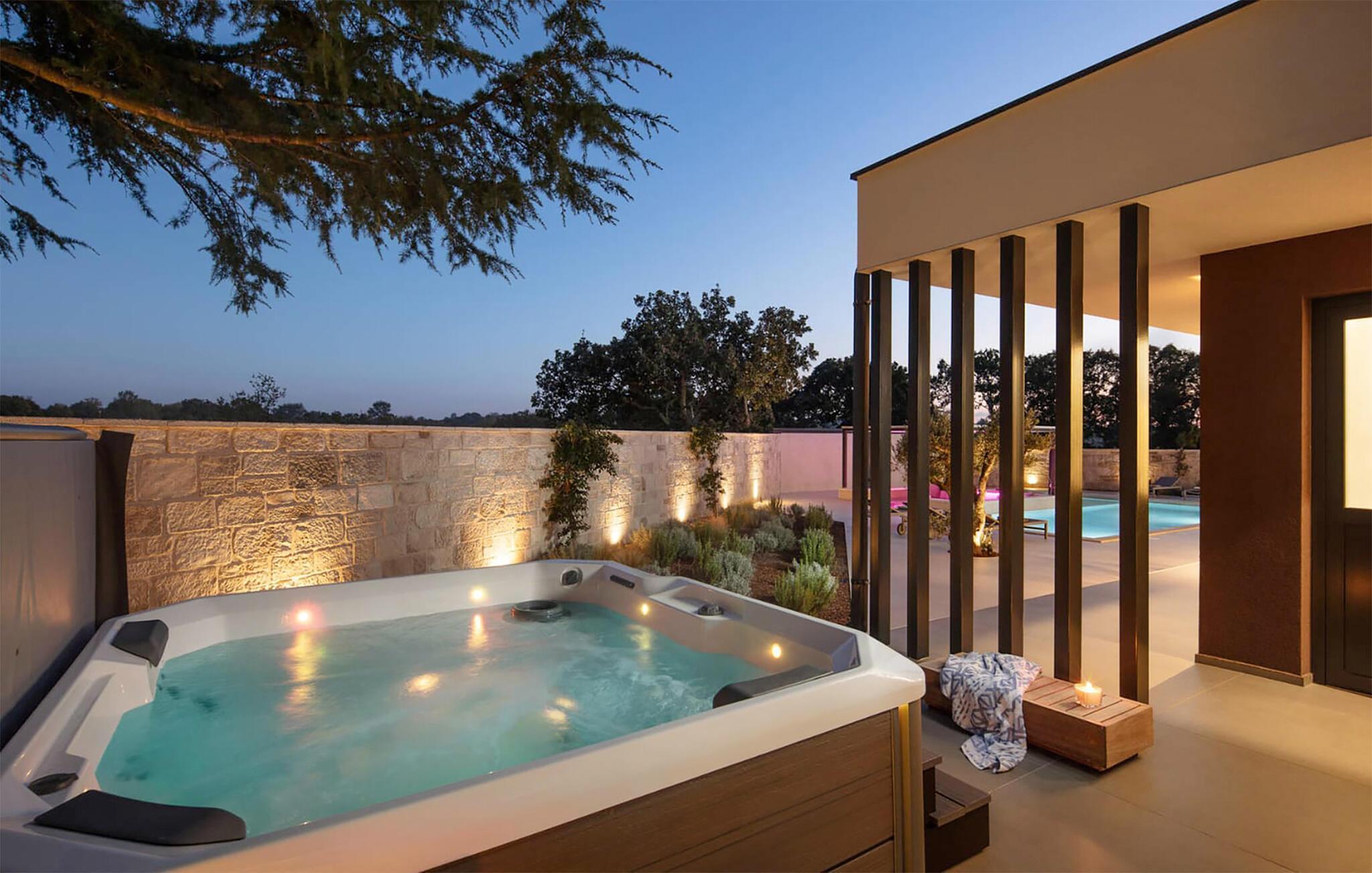 Treten Sie von hier hinaus auf die überdachte Terrasse und verbringen viele Stunden beim Baden im Pool oder Sonnen auf den Liegen. Hochwertige Gartenmöbel, ein zusätzlicher Whirlpool und ein schöner, überdachter Sitzbereich am Pool, machen den Garten zu Ihrem zweiten Wohnzimmer, in dem Sie lange plauschen und Ihre Erlebnisse des Tages austauchen können.