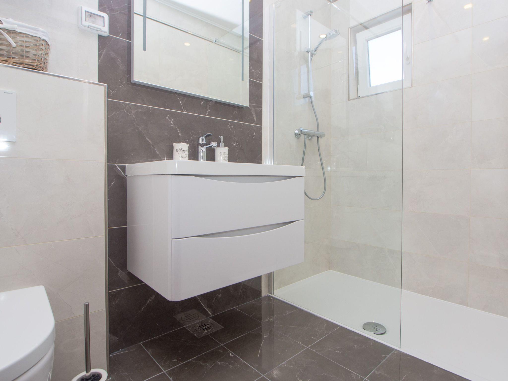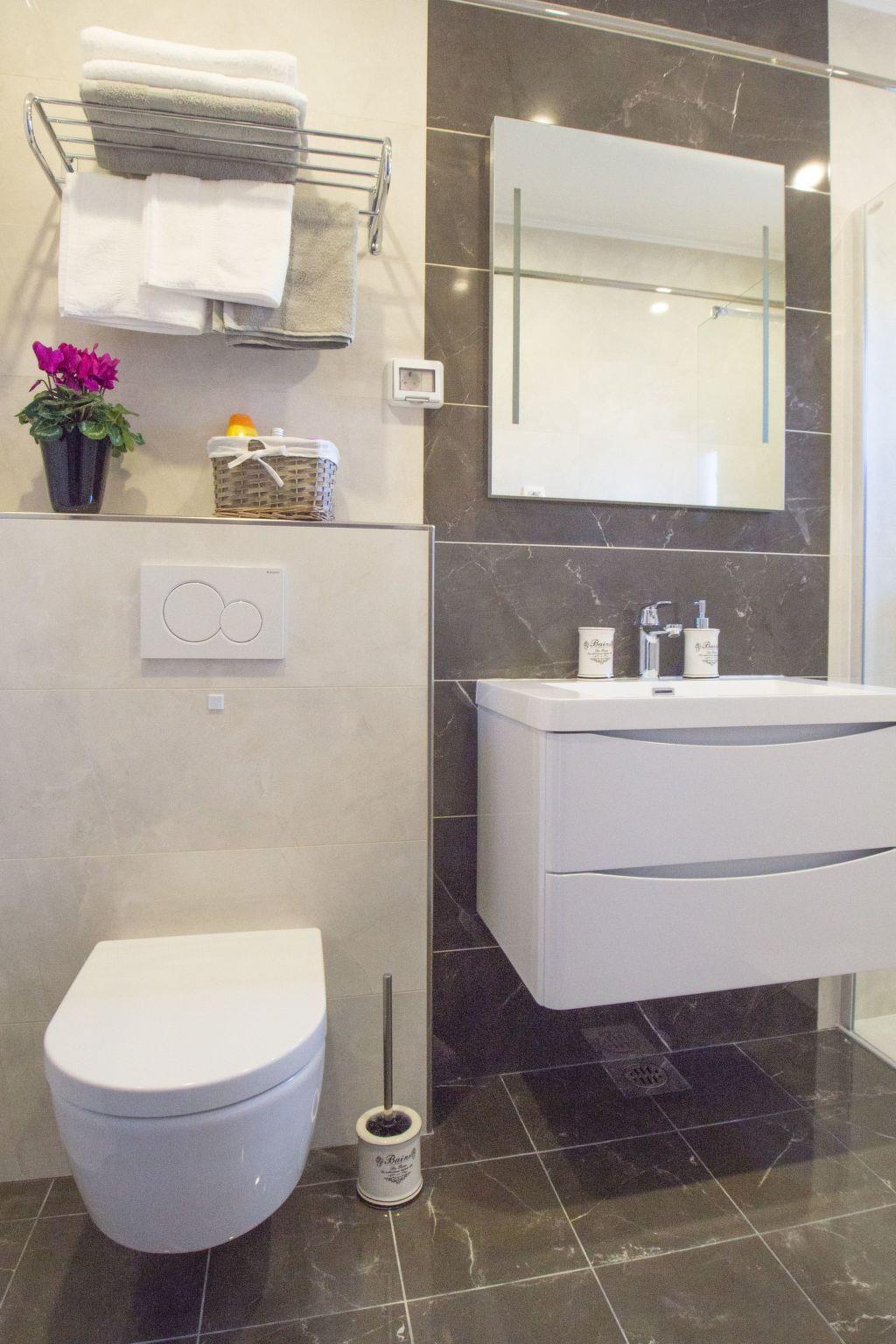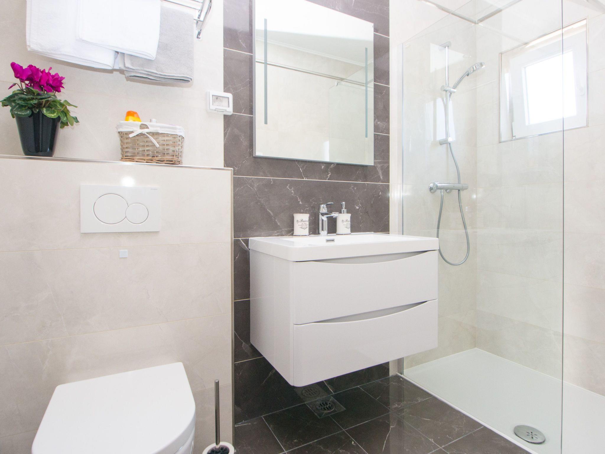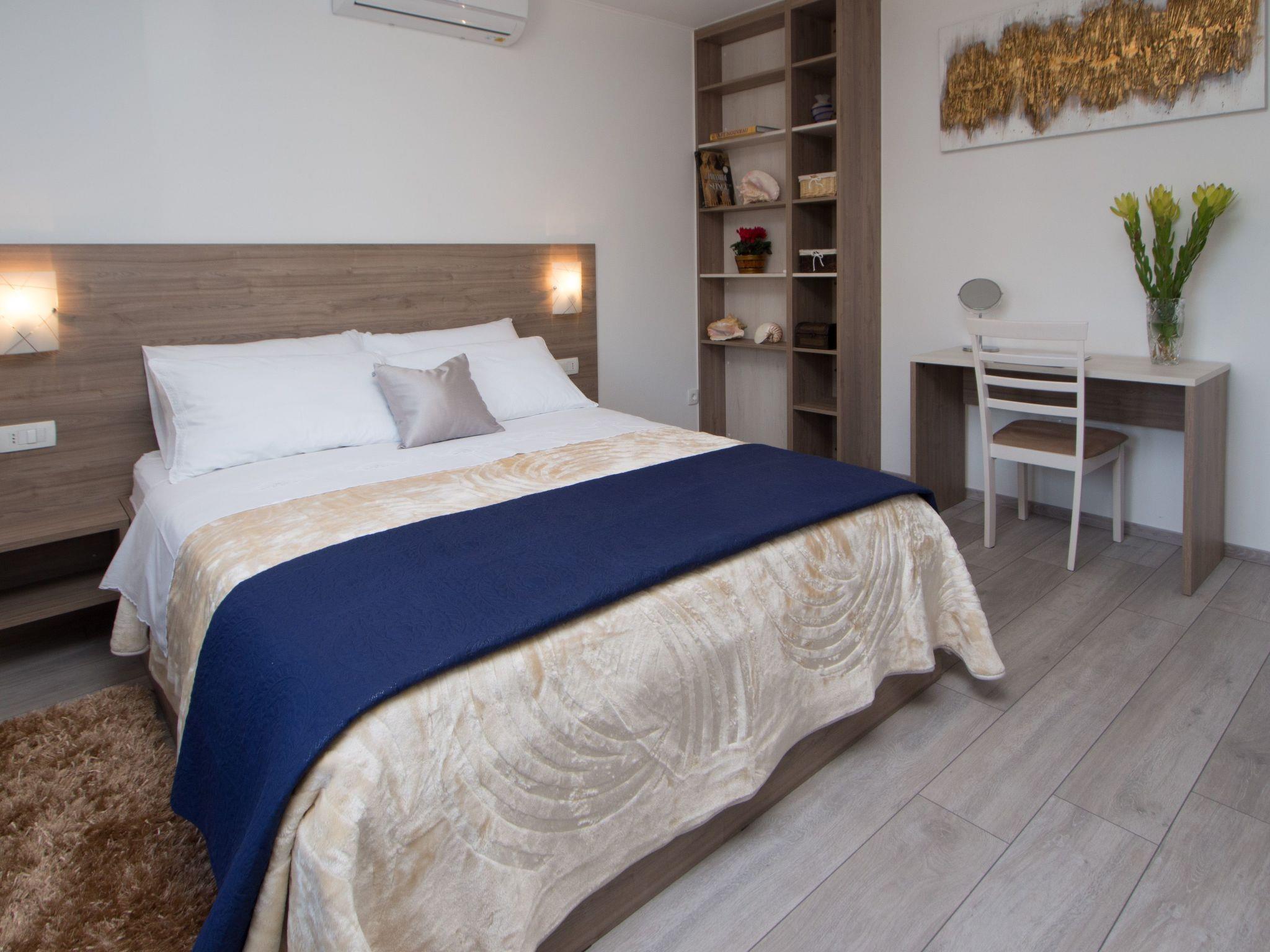 Die 55 m² große Ferienwohnung liegt in der oberen Etage eines zweistöckigen Wohnhauses. Die untere Etage wird von einer kroatischen Familie bewohnt, oben in der Wohnung nebenan wohnt der Vermieter. Erst kürzlich im Jahre 2019 vollständig renoviert bieten sich Ihnen hier alle modernen Annehmlichkeiten, einschließlich Klimaanlagen in Wohn- und Schlafzimmer sowie Internetzugang über WLAN in allen Räumen. Die Ferienwohnung besteht aus einem offenen Wohn- und Essbereich mit integrierter, vollständig ausgestatteter Küche und einem Schlafzimmer mit top modernem Badezimmer. Der Wohnbereich ist mit einem gemütlichen Sofa, einem Sessel, einem Flachbildfernseher mit Satellitenempfang und einer Stereoanlage eingerichtet. Das Sofa lässt sich in einen Schlafplatz für den dritten Gast umfunktionieren. (Abmessungen circa 120 x 200 cm). Neben dem Essplatz schließt sich die moderne Einbauküche, nur mit den neusten Geräten an: Ceran-Kochfeld (Induktion) mit Abzugshabe, Kühlschrank mit Gefrierfach, Wasserkocher und Kaffeemaschine. Im Schlafzimmer finden Sie ein 160 cm x 200 cm großes Doppelbett, einen Wandschrank mit viel Stauraum für Ihre Kleidung und Ihr Gepäck sowie auch noch einen Schreibtisch und einen großen Spiegel vor. Das topmoderne, geschmackvoll cremefarben/braun geflieste Badezimmer verfügt über eine großzügige, begehbare Duschkabine, einen Waschtisch mit Unterschrank und Wandspiegel, einen Föhn und eine Toilette.