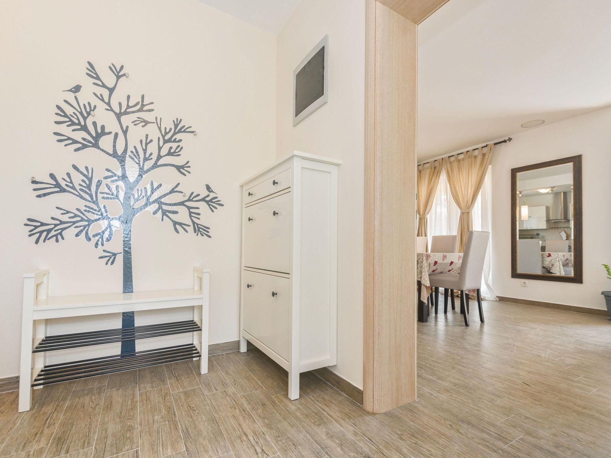Die dreistöckige Ferienvilla wurde erst 2015 neu gebaut und bietet alle notwendigen modernen Annehmlichkeiten für einen komfortablen Aufenthalt, einschließlich Klimaanlagen (kühl/warm) in allen Zimmern. Sie verfügt über ein lichtdurchflutetes Wohn- und Esszimmer mit integrierter, offener Küche sowie vier geräumige Schlafzimmer, drei luxuriös ausgestattete Tageslichtbäder und eine separate Waschküche. Im Erdgeschoss befindet sich ein Wohnzimmer mit einer großzügigen Eckcouchgarnitur, einem gläsernen Couchtisch, einem Flachbildfernseher mit Satellitenempfänger und USB-Anschluss, einem DVD- und CD-Player, einer Stereoanlage und einem Esstisch mit acht Stühlen. Für die Aufbewahrung Ihrer Wertsachen steht Ihnen ein Safe zur Verfügung. Eine elegante Frühstücksbar mit Hockern trennt den Essbereich von der Einbauküche, die mit modernsten Geräten wie Geschirrspüler, Vier-Zonen-Gasherd mit Dunstabzugshaube aus Edelstahl, Elektrobackofen, Kühlschrank mit Gefrierfach, Mikrowelle, Wasserkocher, Toaster und Kaffeemaschine ausgestattet ist. Das Badezimmer im Erdgeschoss verfügt über eine begehbare Dusche. Alle drei Bäder im Haus haben ein Waschbecken mit Unterschrank und Wandspiegel, einen Föhn, ein Bidet und eine Toilette. Eine breite Treppe führt in das Obergeschoss mit drei der vier Schlafzimmer und dem zweiten Badezimmer. Zwei der Schlafzimmer haben jeweils ein Doppelbett (160 x 200 cm) und eines hat zwei Einzelbetten (90 x 200 cm). Das Badezimmer auf dieser Etage verfügt über eine sehr moderne Glasduschkabine. Im Dachgeschoss befinden sich das vierte Schlafzimmer und das dritte Badezimmer. Das Schlafzimmer hat ein Doppelbett (160 x 200 cm) und eine eigene Fernsehecke mit einem Sofa und einem Flachbildfernseher. Das Badezimmer hat eine Badewanne mit Duschvorrichtung und eine große Duschkabine. In der separaten Waschküche befindet sich eine Waschmaschine. Ein Kinderbett und ein Hochstuhl sind vorhanden, Bettwäsche und Handtücher sind ausreichend vorhanden und die zuverlässige drahtlose Internetverbindung in der Villa kann kostenlos genutzt werden.