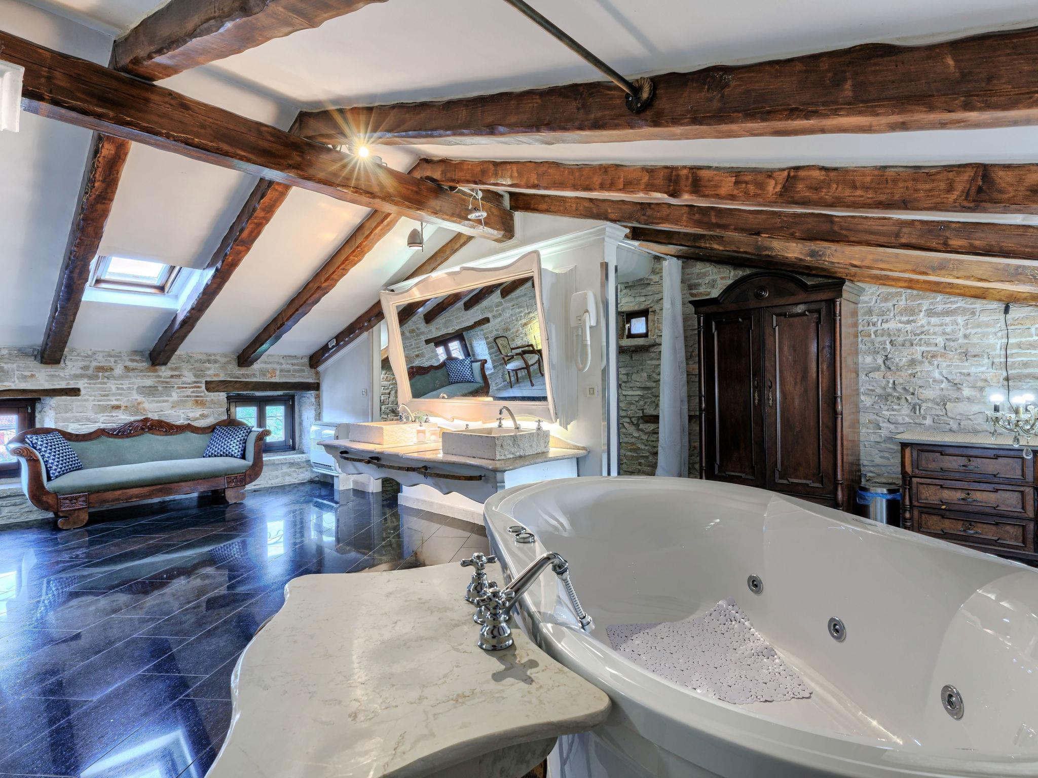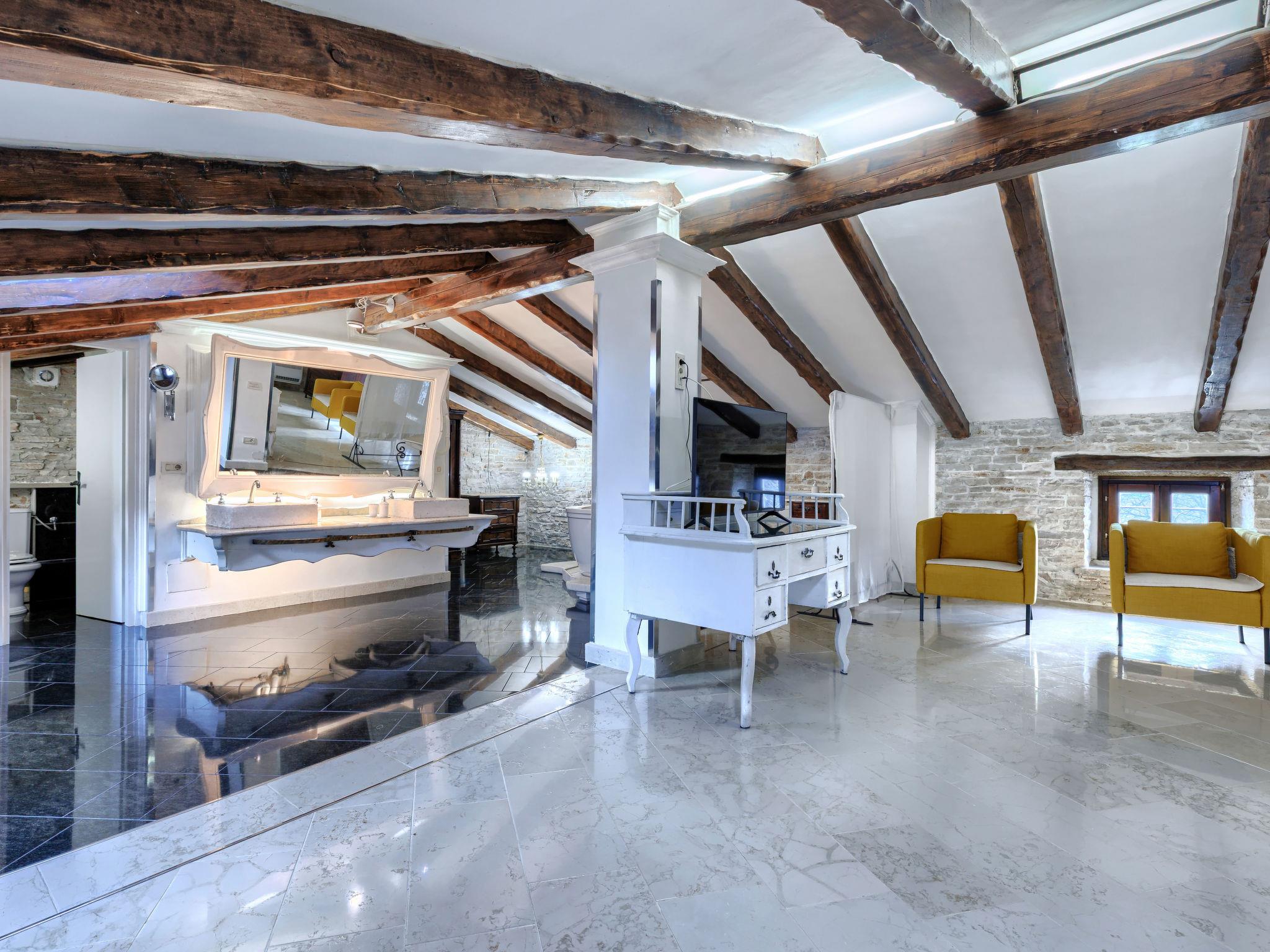 Schönes, rustikales Einfamilienhaus "Golden Roots", auf 3 Stockwerken. Im Weiler Katun Lindarski, 2 km vom Zentrum von Žminj, 27 km vom Zentrum von Rovinj, ruhige, sonnige Lage, 30 km vom Meer. Zur Alleinbenutzung: Grundstück 600 m2, Schwimmbad eckig (8 x 4 m, 150 cm tief, saisonale Verfügbarkeit: 01.Mai. - 01.Okt.) mit Innentreppe. Aussendusche, Terrasse, Gartenmöbel, Grill. Im Hause: Internetzugang, Waschmaschine. Einkaufsgeschäft 2 km, Supermarkt 2 km, Restaurant 2 km, Bushaltestelle 2.6 km, Kieselstrand 27 km. Reitstall 10 km, Wanderwege ab Haus, Radweg 50 m. Nahe gelegene Sehenswürdigkeiten: Zip line 15 km, Adventure park 20 km. Bitte beachten: Flugplatz 30 km vom Haus.