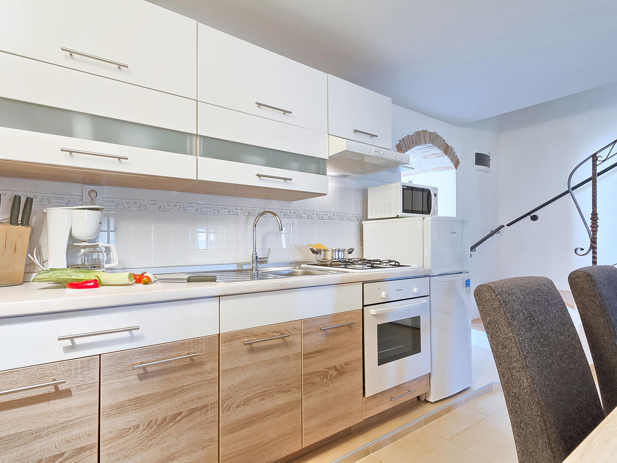 5-Zimmer-Doppelhaushälfte 160 m2 auf 2 Stockwerken. Wohn-/Esszimmer mit Sat-TV (Flachbildschirm), DVD und Klimaanlage. Ausgang zur Terrasse. 1 Zimmer mit 1 franz. Bett (160 cm, Länge 200 cm). Offene Küche (4 Kochplatten, Backofen, Mikrowelle, Tiefkühler, elektrische Kaffeemaschine). Ausgang zur Terrasse. Bad/WC, Dusche/WC. Obergeschoss: Eingang mit Klimaanlage. 1 Zimmer mit 1 franz. Bett (160 cm, Länge 200 cm). 1 Zimmer mit 1 franz. Bett (160 cm, Länge 200 cm), Dusche/WC. Abgeschrägte, offene Galerie, Deckenhöhe 140 - 250 cm mit 1 Doppeldiwanbett (160 cm, Länge 200 cm), Klimaanlage. Terrasse 10 m2, überdacht, Terrasse 15 m2, überdacht. Terrassenmöbel, Liegestühle. Schöne Sicht auf das Schwimmbad und die Landschaft. Zur Verfügung: Safe, Babybett, Haartrockner. Internet (WLAN, gratis). Maximal 1 Haustier/Hund erlaubt. Das Haupthaus mit Wohn-/Essbereich, einer offenen Küche und einem Schlafzimmer im Erdgeschoss und mit 2 Schlafzimmern im ersten Stock. Im Ferienhaus gibt es ein Zimmer mit 2 Fitnessgeräten, eine Dusche/WC im Erdgeschoss und eine offene Galerie, eine Doppel-Schlafcouch, eine Stereo-Anlage und Klimaanlage im ersten Stock.