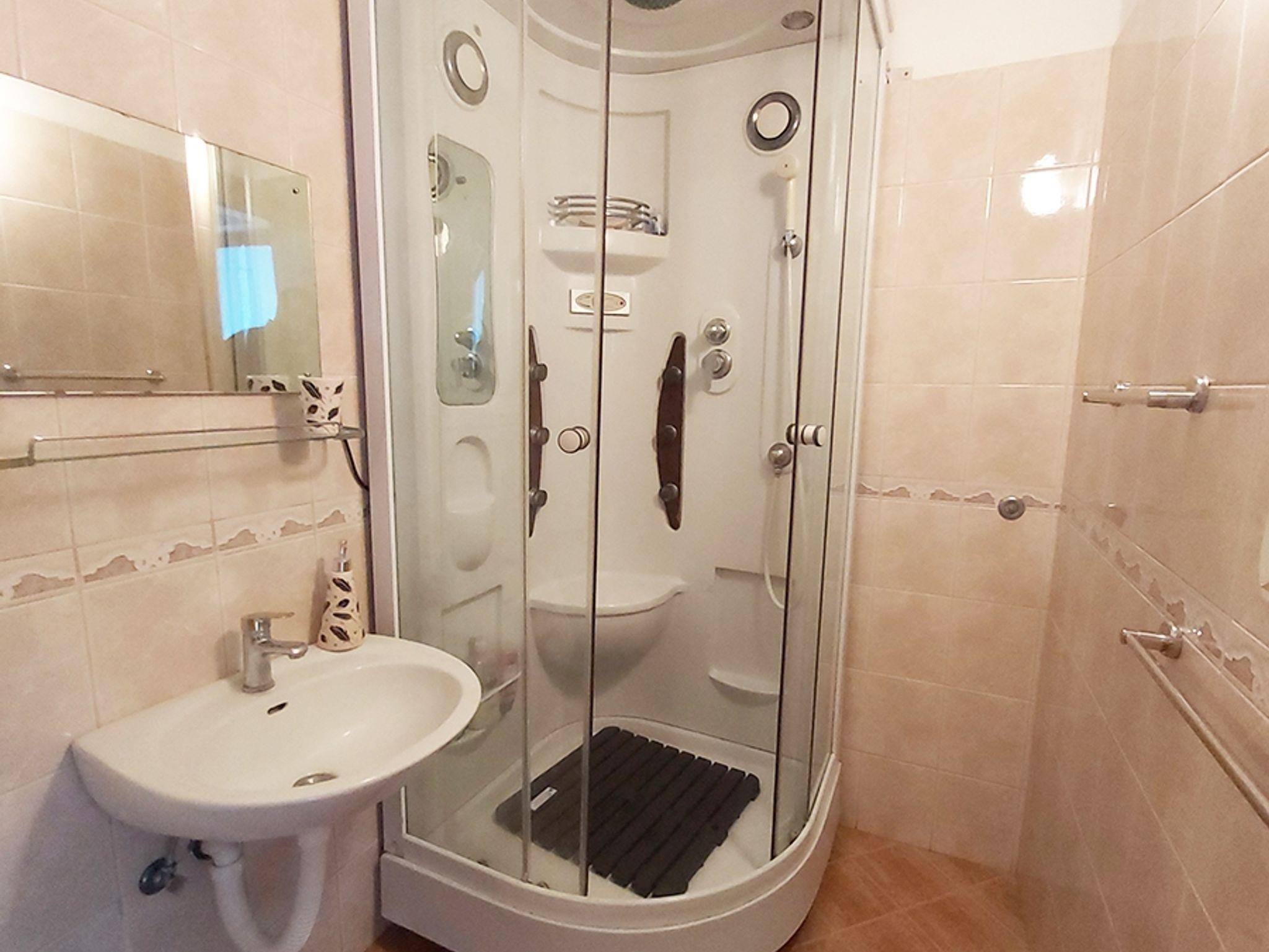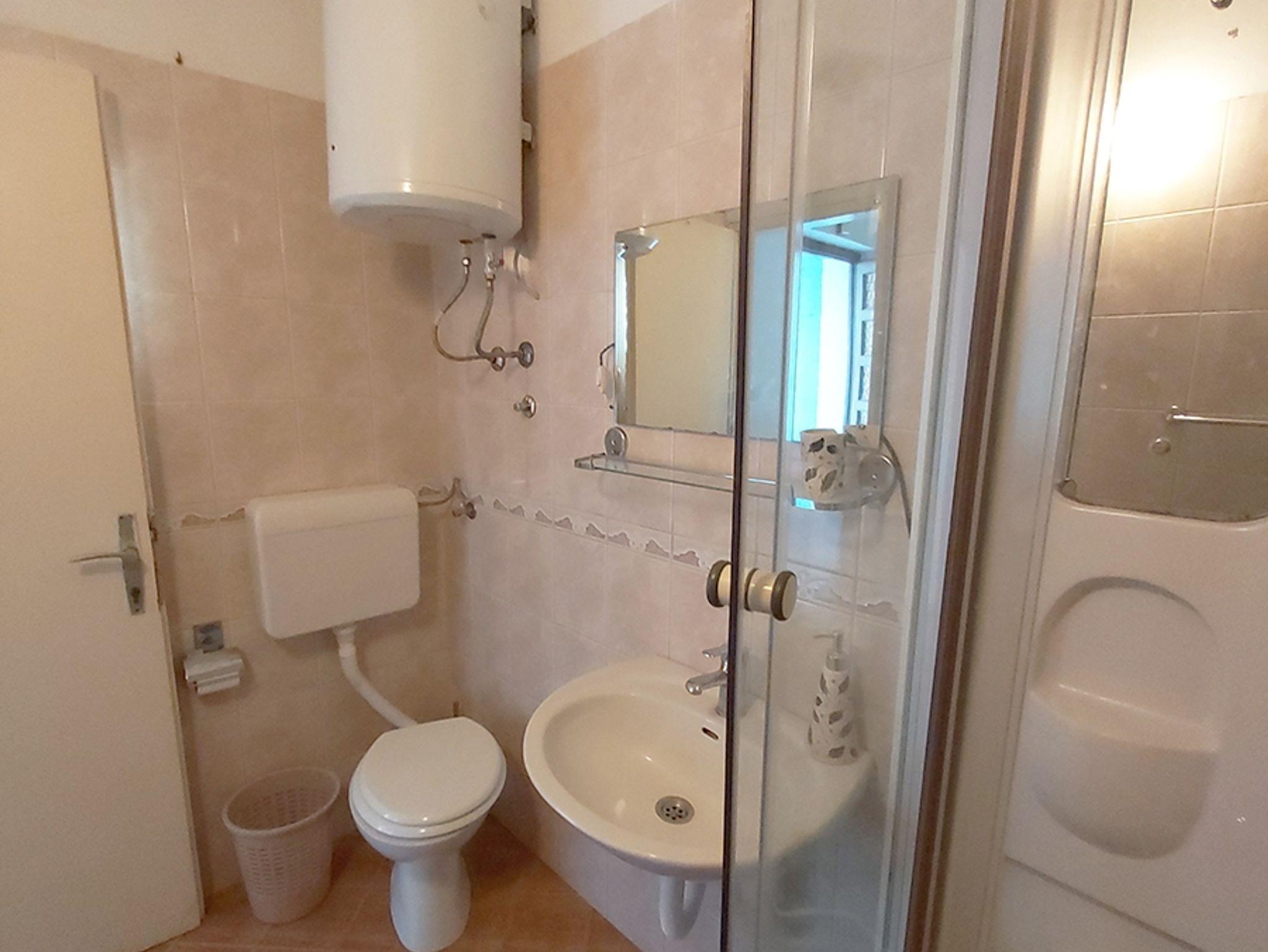 Ferienwohnung bietet Platz für 6 Gäste. Die Betten sind in Schlafzimmern, die es 2 gibt, und in Wohnzimmer, innerhalb einer Gesamtfläche von 59m2, angeordnet. Die Gäste haben eine eigene Terrasse zur Verfügung, auf der sie in warmen Sommernächten genießen können. Das Apartment bietet Meerblick. Es ist erlaubt, Speisen auf dem Gemeinschafts-Grill vorzubereiten. In der Unterkunftseinheit besteht die Möglichkeit des Mitbringens von Haustieren gegen Aufpreis. IM PREIS INBEGRIFFEN: Kurtaxe, Endreinigung, Klimatisierung, Parkplatz, Internet, Kinderbett, Bügeleisen, Bügelbrett, Föhn. VERBINDLICHE ZUSÄTZLICHE KOSTEN: Aufzahlung für Kurzaufenthalte (prozentualer Zuschlag pro Nächtigungsanzahl: 30% - 1, 20% - 2, 10% - 3). UNVERBINDLICHE ZUSÄTZLICHE KOSTEN: Wäschewaschen (5,00 € Waschen), Haustiere (8,00 € pro Nacht). Die Verfügbarkeit zusätzlicher Dienstleistungen in Ihrem reservierten Termin und die Preise derselben (falls nicht aufgeführt) müssen im Voraus überprüft werden. Zusätzliche Dienstleistungen die in der Zahlungsaufforderung nicht aufgeführt sind werden direkt beim Vermieter bezahlt, angenommen der Gast nutzt auch diese.