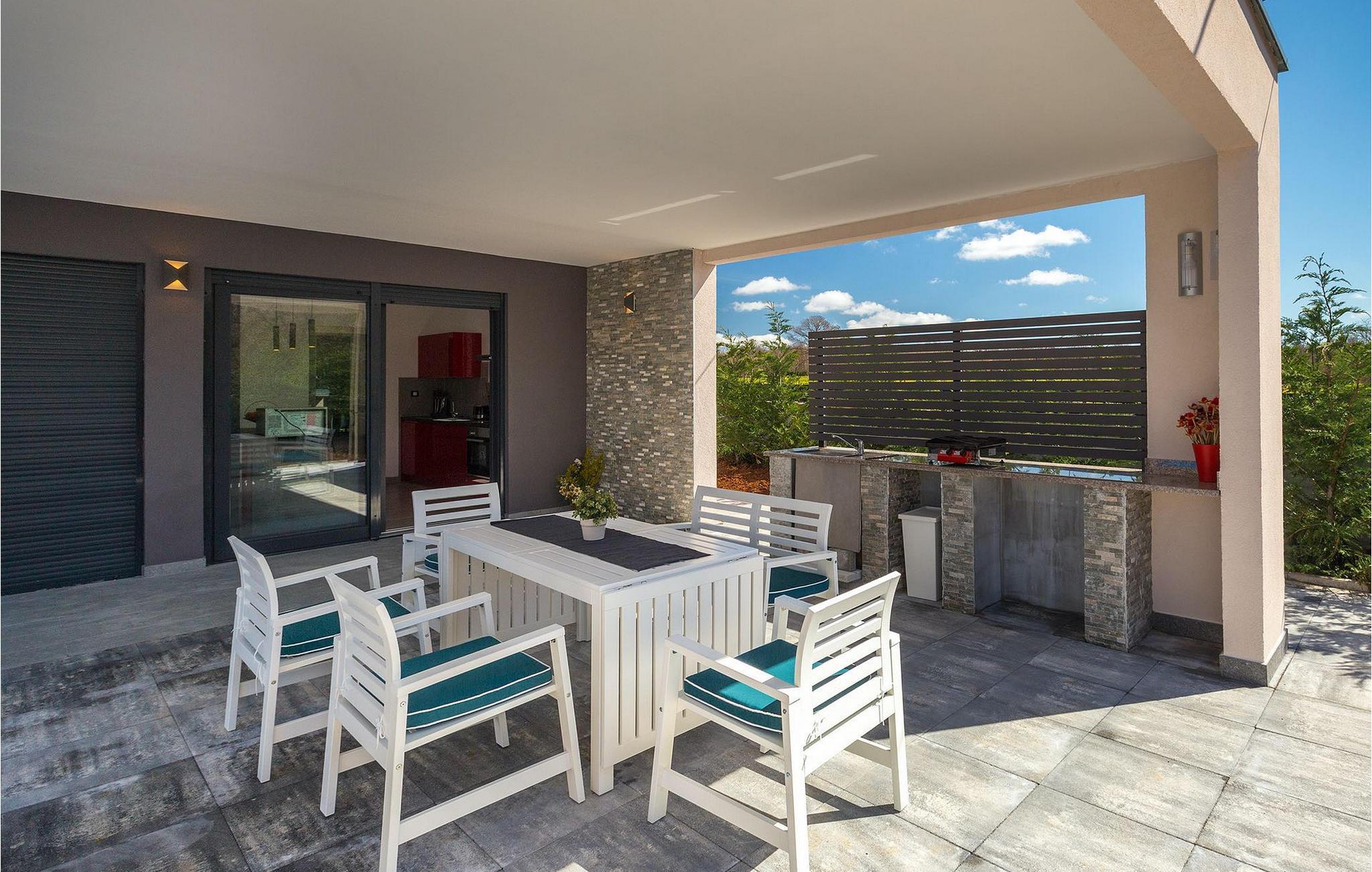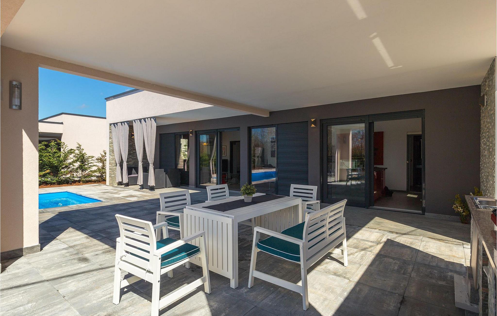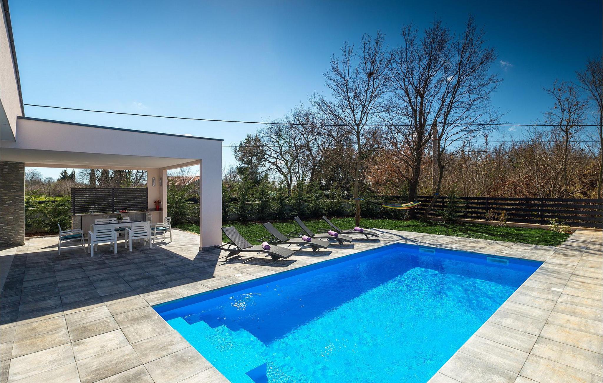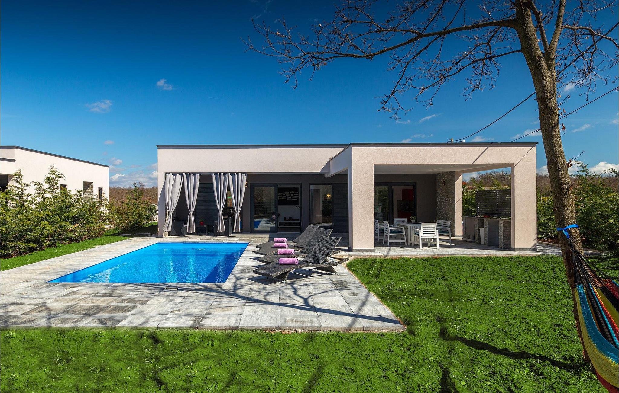 Villa Sorella 2 ist in einer ruhigen istrischen Ortschaft gelegen und ist eine ideale Unterkunft für 4 Personen in 90 Quadratmetern. Die Villa ist einfach aber stilvoll eingerichtet und besteht aus 2 Schlaf- und 2 Badezimmer. Ein Schlafzimmer verfügt über ein Doppelbett und hat ein eigenes Badezimmer. Das zweite Schlafzimmer hat 2 Einzelbetten. Das große Sofabett im Wohnzimmer bietet Platz für noch 2 zusätzliche Personen. Das Wohnzimmer ist dank der großen Glasfläche mit viel Licht durchflutet und hat auch direkten Zugang zum Pool im Garten der Villa. Das Wohnzimmer ist mit dem Essbereich und der völlig ausgestatteten Küche verbunden. Die Küche ist jedoch nicht der einzige Platz, wo Sie Ihre Mahlzeiten zubereiten können; auf der geräumigen überdachten Terrasse vor der Villa stehen Ihnen ein elektrischer Grill, sowie ein Waschbecken und Geschirr zur Verfügung. Ein Holzkohlengrill steht Ihnen auch zur Verfügung. Falls Sie Ihren Urlaub mit Kindern verbringen, außer im privaten Pool, können sie auch Spaß mit Badminton oder auf der Rutsche und der Schaukel haben. Villa Sorella 2 bietet alles was Sie für einen vollkommend erholsamen Urlaub brauchen.Beide Villen, Sorella 1 und Sorella 2, befinden sich in einem ruhigen istrischen Dorf, das eine perfekte Mischung aus Ruhe und Entspannung weit weg von der Stadthektik ist. Doch die bekannten Urlaubsziele an der Küste, wie z.B. Pula und Rovinj, sind leicht zu erreichen. Zentralistrien ist eine wunderschöne Region mit vielen kleinen mittelalterlichen Städtchen mit guten Restaurants, Cafés, Weingütern und Geschäften. Svetvincenat und Vodnjan sind zwei solche Städtchen und sind innerhalb 10 km von der Villa entfernt. Während Sie Ihren Urlaub in der Ruhe dieser Zentralistrischen Ortschaft verbringen, können Sie die Gelegenheit nutzen, Fažana und die schönen umliegenden Strände zu besuchen oder die Möglichkeit nutzen, mit dem Boot zu einem der Nationalparks in Kroatien - Brijuni zu fahren.