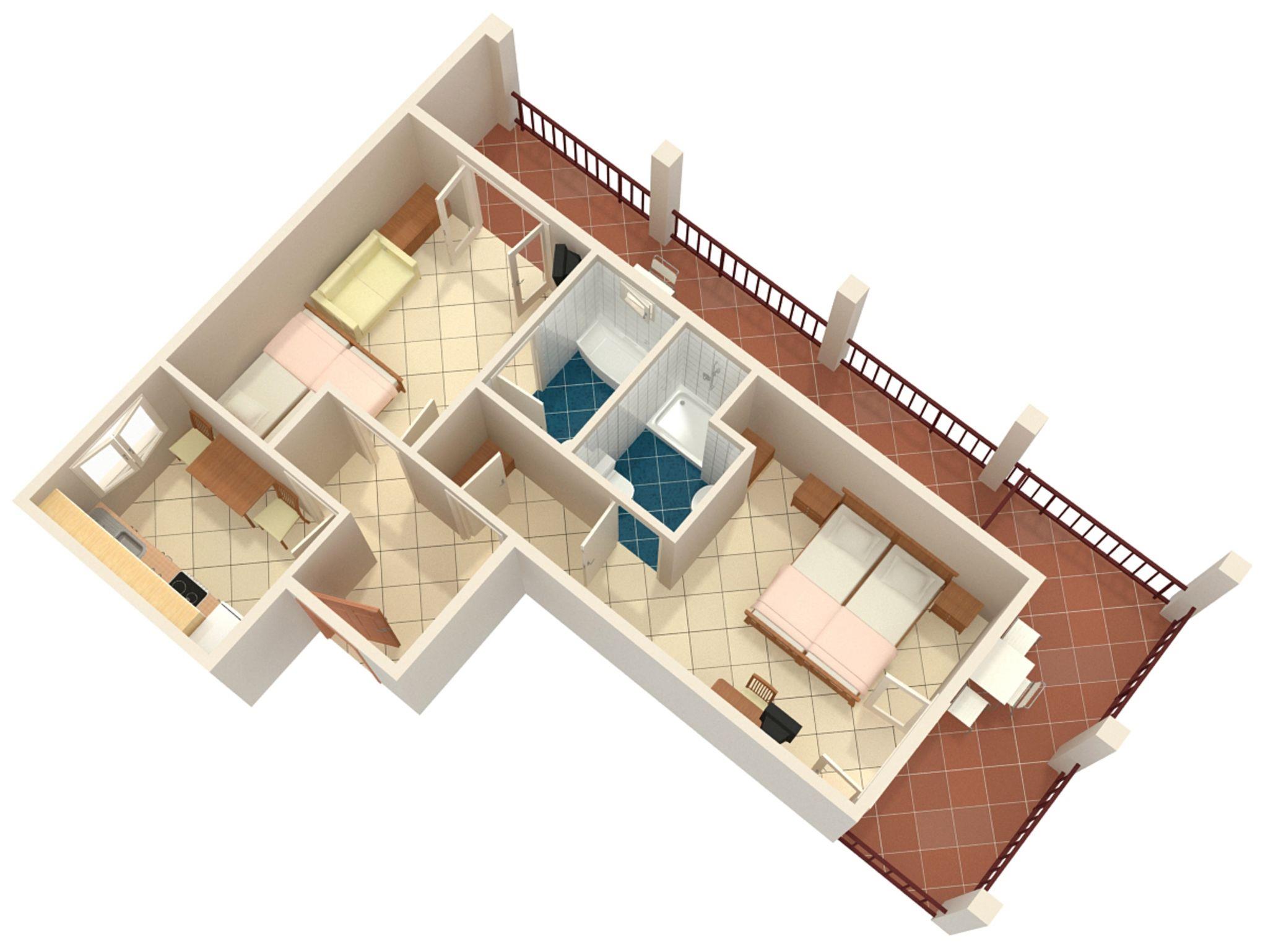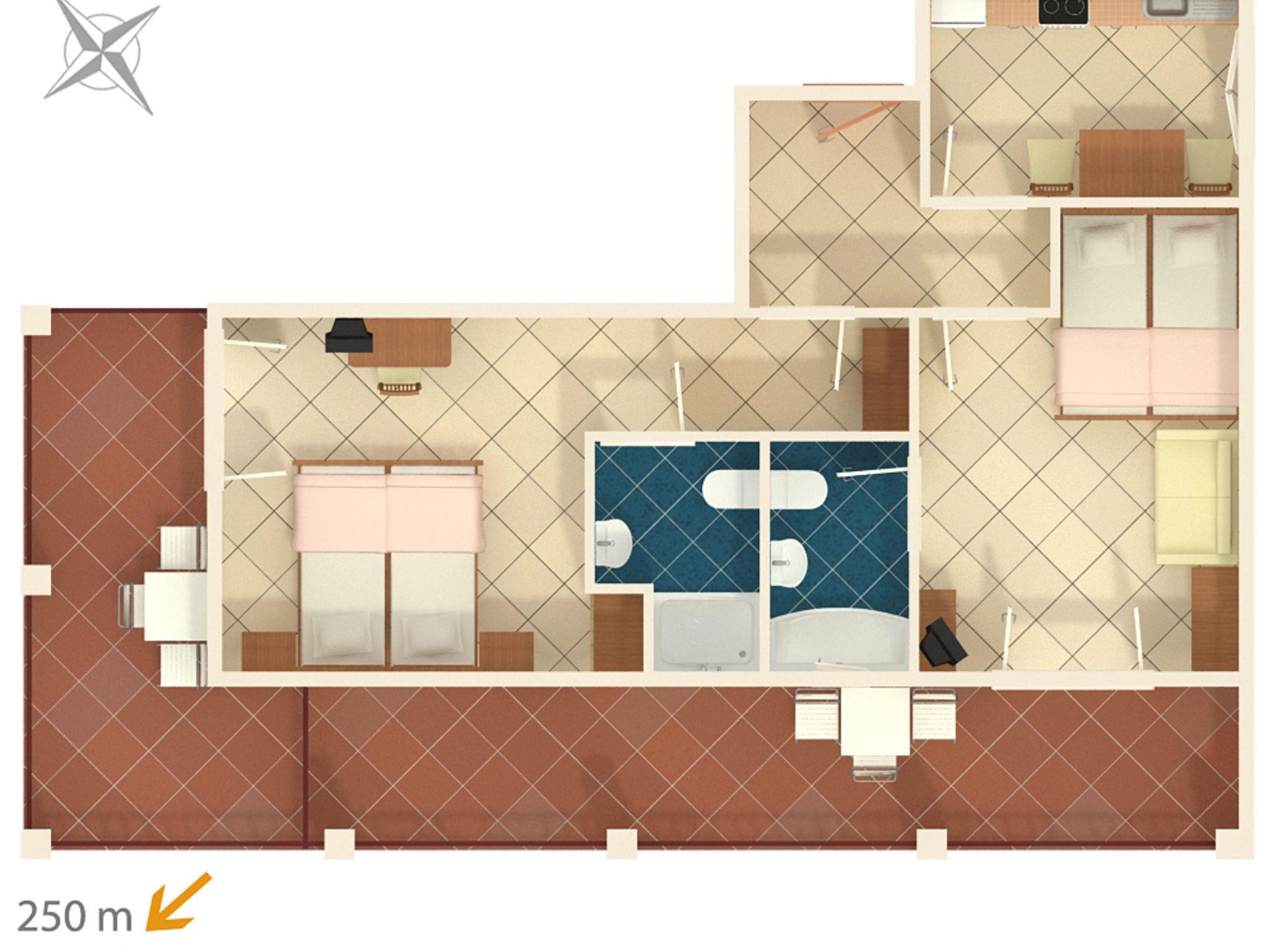 Ferienwohnung bietet Platz für 5 Gäste. Die Betten sind in Schlafzimmern, die es 2 gibt, innerhalb einer Gesamtfläche von 38m2, angeordnet. Die Gäste haben eine eigene Terrasse zur Verfügung, auf der sie in warmen Sommernächten genießen können. Es ist erlaubt, Speisen auf dem Gemeinschafts-Grill vorzubereiten. IM PREIS INBEGRIFFEN: Kurtaxe, Endreinigung, Parkplatz, Internet, tragbarer Grill. VERBINDLICHE ZUSÄTZLICHE KOSTEN: Aufzahlung für Kurzaufenthalte (prozentualer Zuschlag pro Nächtigungsanzahl: 30% - 1, 20% - 2, 10% - 3). UNVERBINDLICHE ZUSÄTZLICHE KOSTEN: Klimatisierung (5,00 € pro Nacht), Wäschewaschen (5,00 € Waschen). Die Verfügbarkeit zusätzlicher Dienstleistungen in Ihrem reservierten Termin und die Preise derselben (falls nicht aufgeführt) müssen im Voraus überprüft werden. Zusätzliche Dienstleistungen die in der Zahlungsaufforderung nicht aufgeführt sind werden direkt beim Vermieter bezahlt, angenommen der Gast nutzt auch diese.
